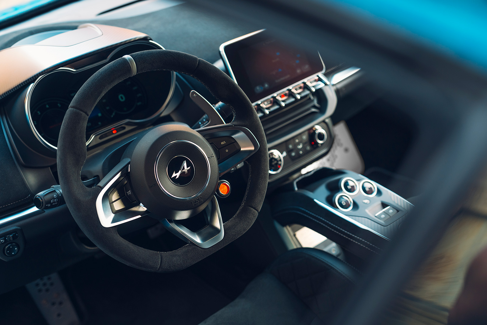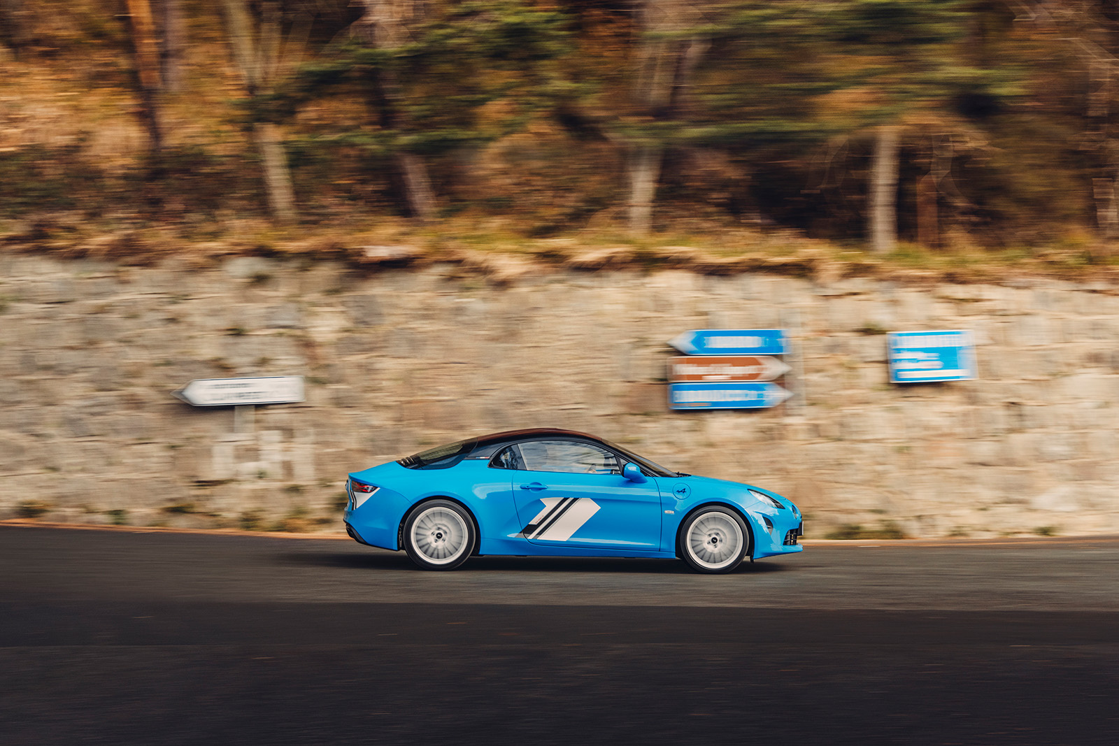 Во новиот модел користени се класични бои. Бојата Caddy Blue, која е комбинирана со црни столбови и црвен покрив, изгледа многу добро овде. Не е заборавена ниту графиката на вратите и на задниот дел. Оваа едиција на А110 има бандажи во Grand Prix Brilliant Blanc боја, а шепите на сопирачките се обоени во антрацит.