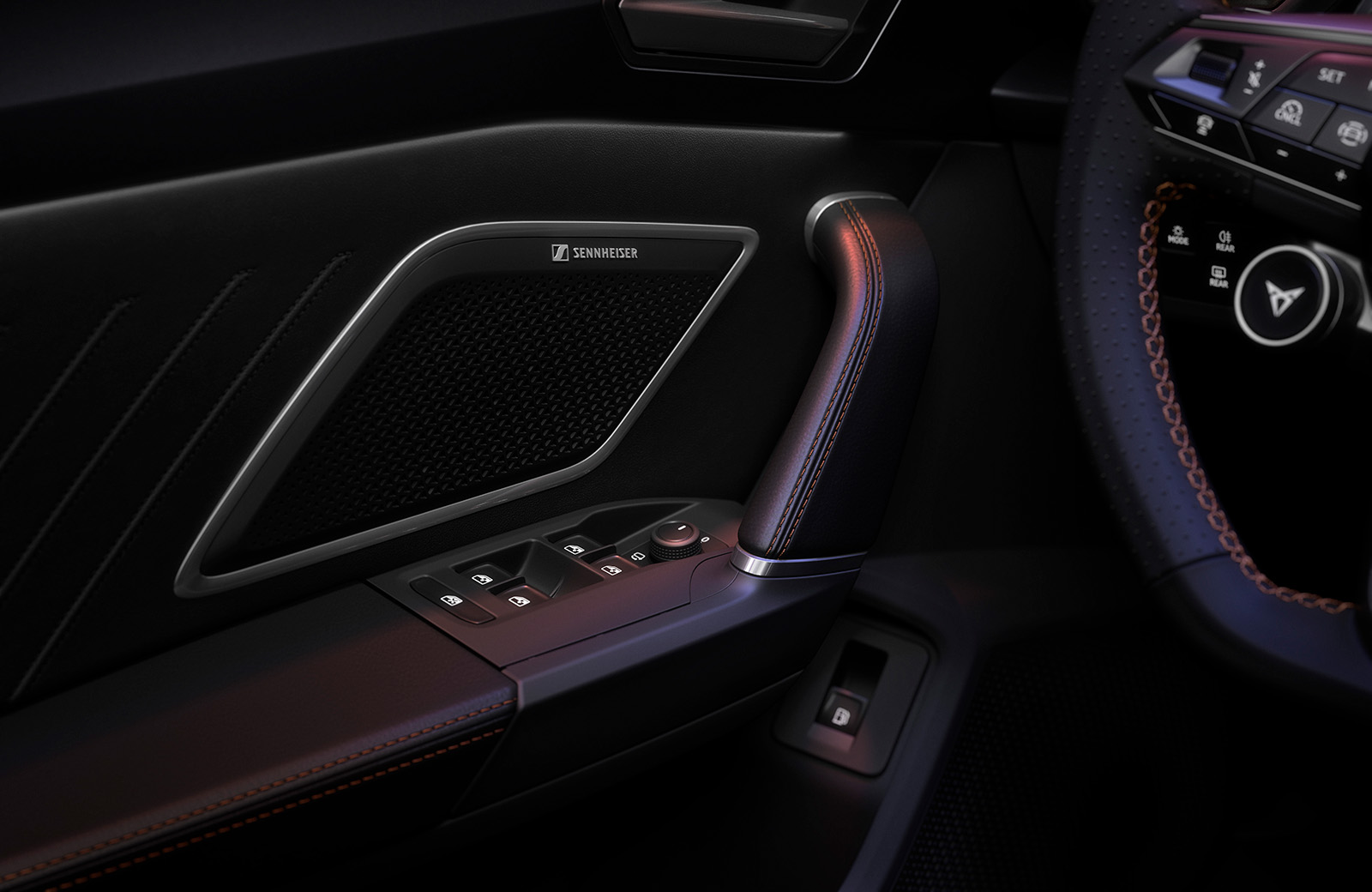 Звучниот систем Sennheiser дебитира на Cupra Leon. Неговата моќност е 425 W, а звучниците се наредени за да обезбедат максимално добар звук. Списокот на опции е збогатен со спортските седишта CUPBucket.