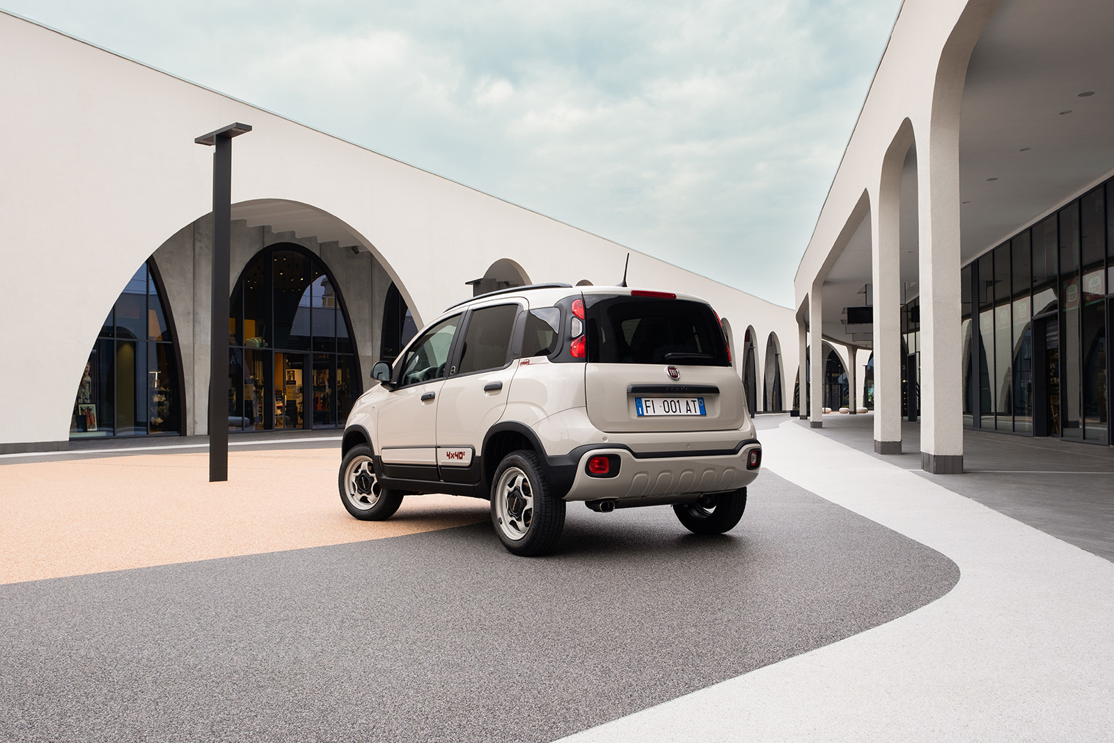Fiat Panda 4×40 ќе ја препознаете по налепниците и бандажите. Последните се интересна референца за оригиналните „nibs“ бандажи од првата Panda 4×4. Тие се само структурни бандажи кои не добија капаци и обоени се во бела боја, а додадено е  дискретно капаче за покривање на завртките. Ефектот е навистина добар и визуелно интересен.