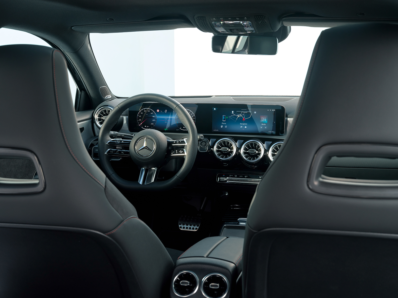 Ексклузивноста се одразува и во внатрешноста на новата А-Class. Апсолутно истакнување е стандардниот самостоен дисплеј со двоен екран од 7-инчи и поголемиот 10.25-инчен екран за инфозабавниот систем. Како опција достапни се два екрани од 10.25 инчи кои изгледаат како да лебдат. Внатрешната архитектура, која е единствена во оваа класа, создава многу посебен осветлен амбиент кој можеби потсетува на осветлувањето на футуристичка зграда во текот на ноќта. Трите кружни отвори за воздух со изглед на турбина, толку типични за Mercedes-Benz, се почит на светот на авијацијата. Ревидираниот волан е од најновата генерација на волани на Mercedes-Benz, стандардно во Nappa кожа, е компактен и одговара на високотехнолошкиот карактер на редизајнираната централна конзола.