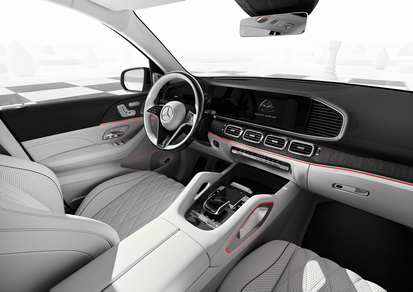 Додека веќе иконската внатрешност на S-Class го носи луксузот на следното ниво, Night Series ја проширува ексклузивноста на моделот со две внатрешни варијанти – црна со црна бисерна кожа или MANUFAKTUR deep бела/црна. Благородниот ефект на црно бисерна напа кожа, заедно со златно-сивите сјајни шевови суптилно ја нагласуваат вредноста на внатрешноста.