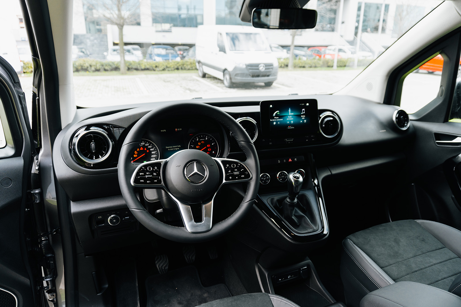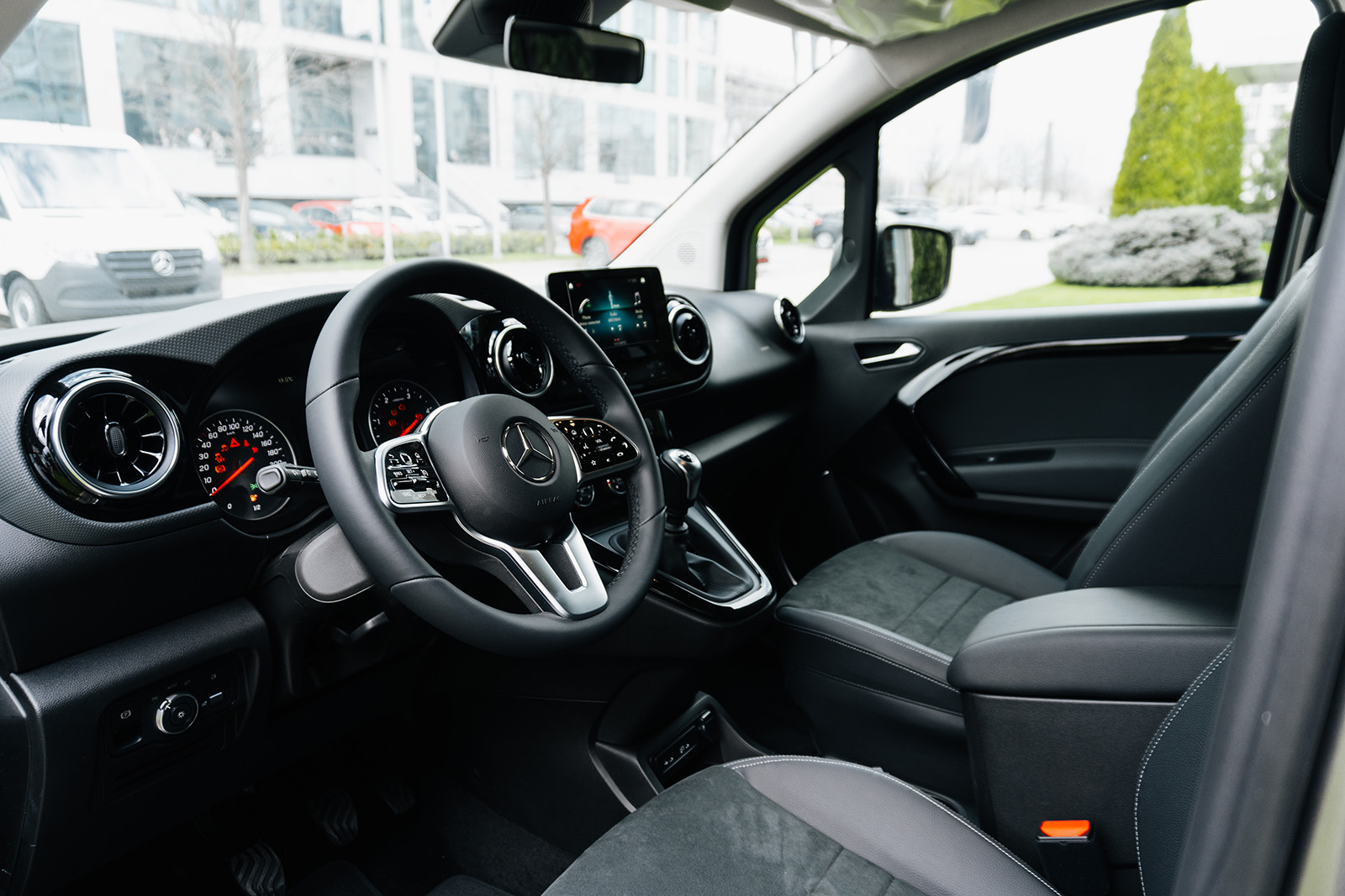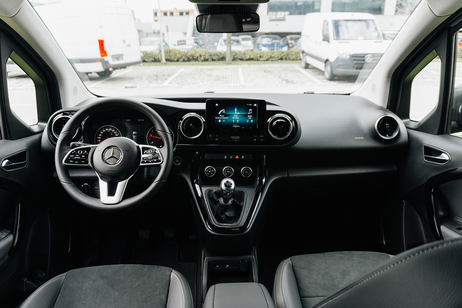 Што се однесува до внатрешноста, Mercedes-Benz внесува сосема нова привлечност со висока вредност во сегментот на мали ван автомобили. Стандардната опрема која се добива кај T-Class вклучува најнова генерација на MBUX инфозабавен систем со 7-инчен екран на допир и интеграција за паметни телефони, мултифункционален волан со копчиња за контрола на допир, стартување без клуч, табла со инструменти со дисплеј во боја од 5,5 инчи, а достапно е и LED амбиентално осветлување со избор од осум бои.