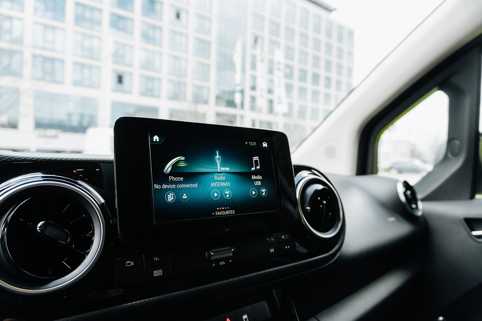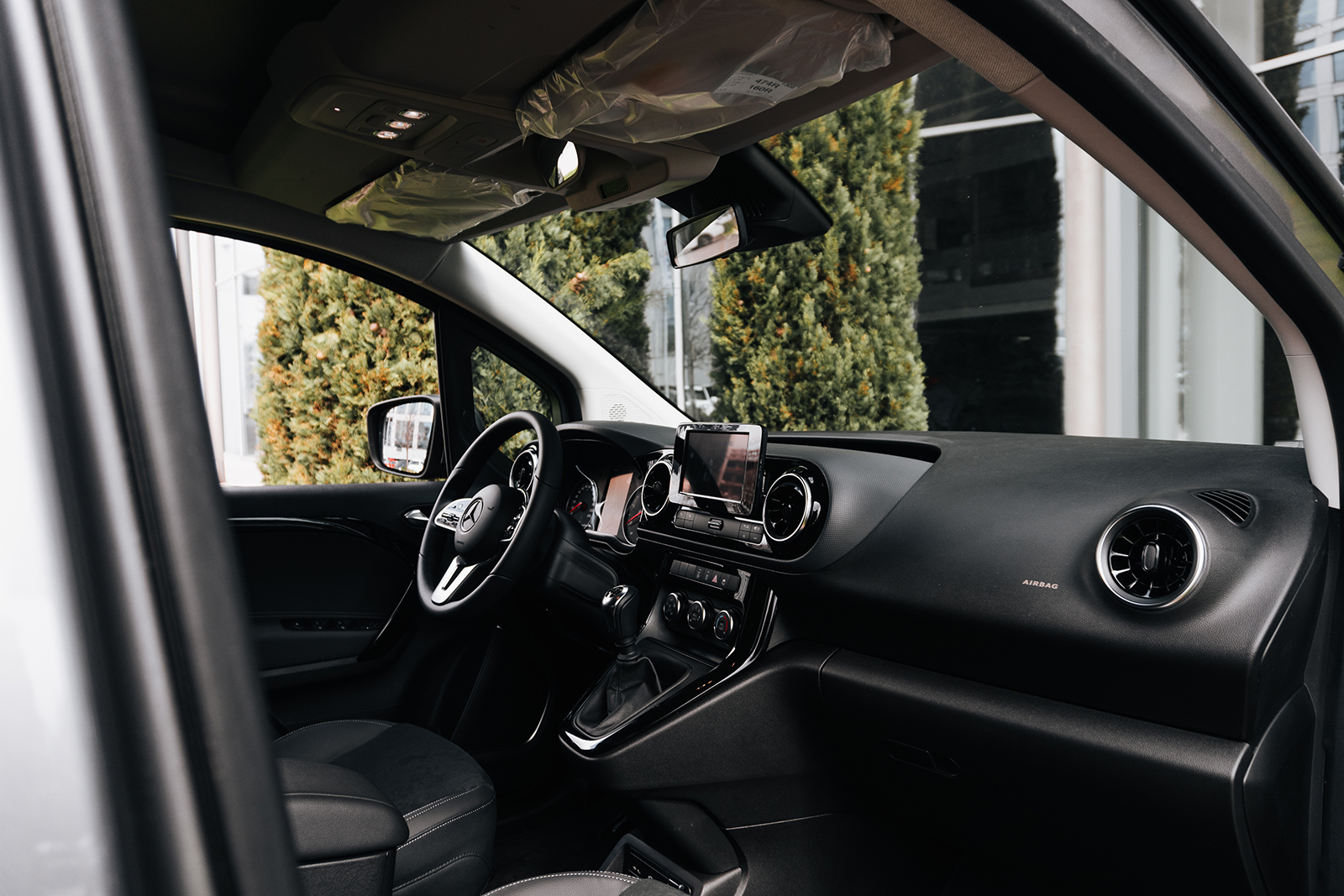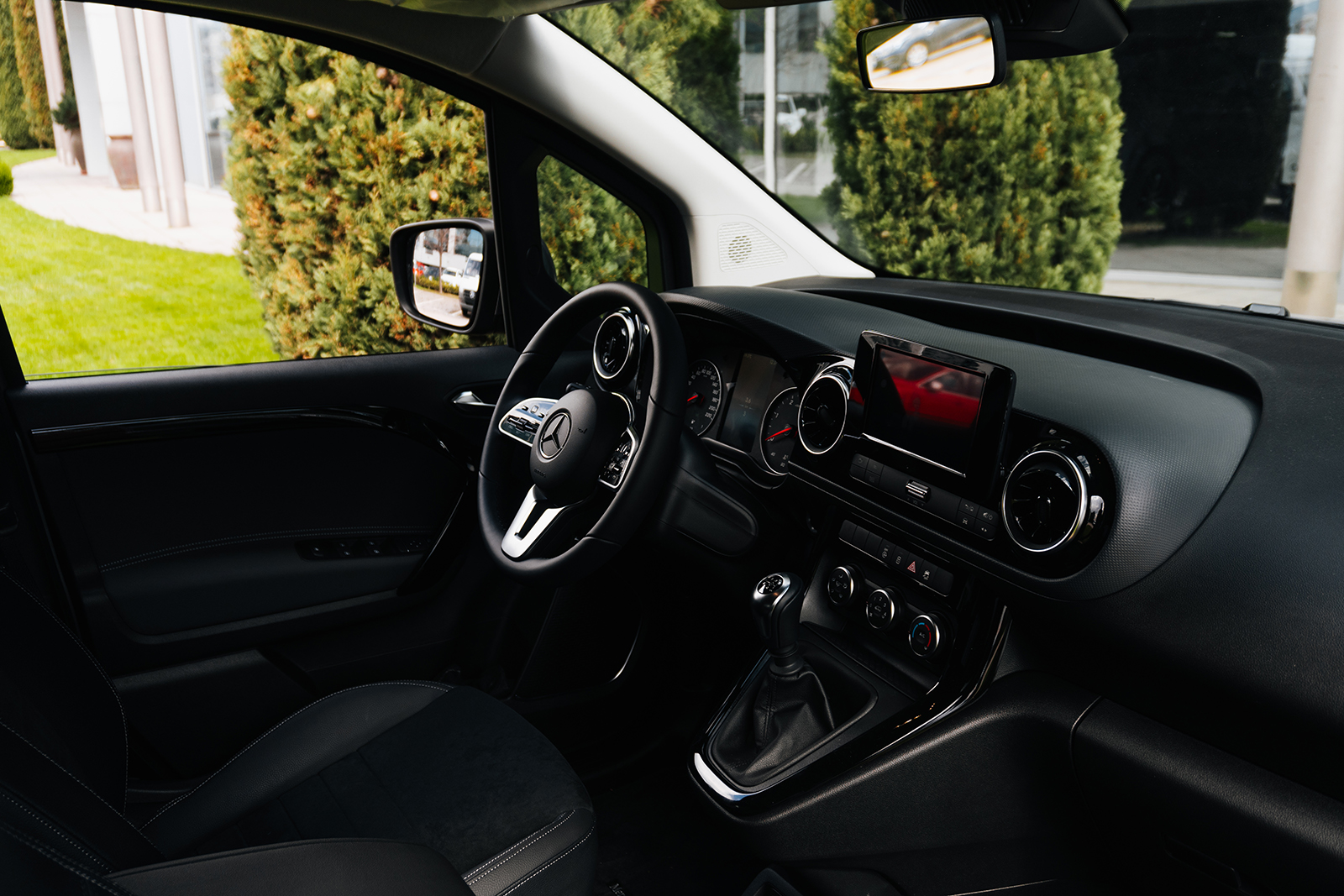 Што се однесува до внатрешноста, Mercedes-Benz внесува сосема нова привлечност со висока вредност во сегментот на мали ван автомобили. Стандардната опрема која се добива кај T-Class вклучува најнова генерација на MBUX инфозабавен систем со 7-инчен екран на допир и интеграција за паметни телефони, мултифункционален волан со копчиња за контрола на допир, стартување без клуч, табла со инструменти со дисплеј во боја од 5,5 инчи, а достапно е и LED амбиентално осветлување со избор од осум бои.