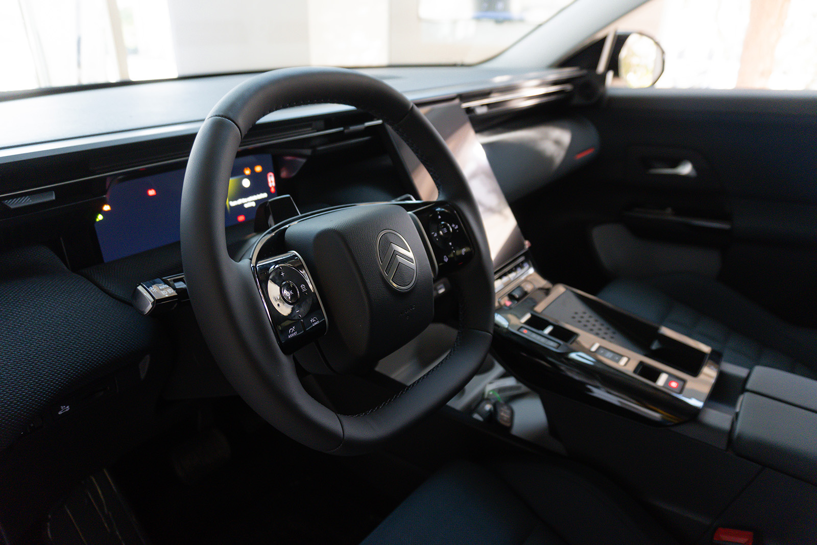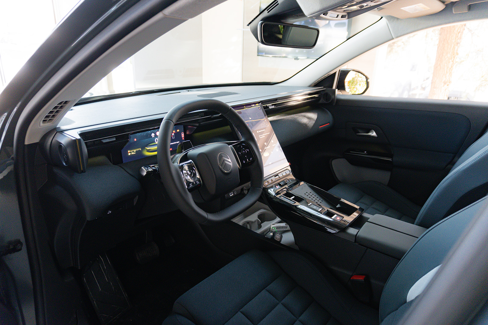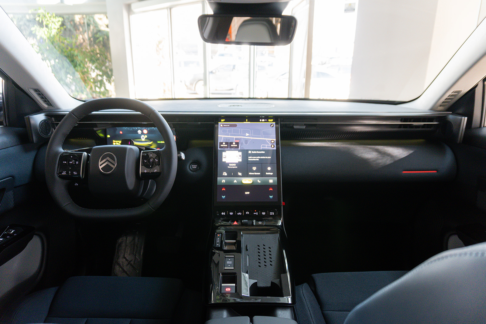 Внатрешноста е сосема нов концепт. Нема повторување на другите автомобили од групацијата Stellantis. Откако ќе ја отворите вратата, веднаш ќе го забележите мултимедијалниот екран од 13,6 инчи, кој е поставен вертикално и малку накосен. Зад него ќе најдете дополнителни прегради за складирање и USB-C порти. Зад воланот има 10,25-инчен екран за инструментите.