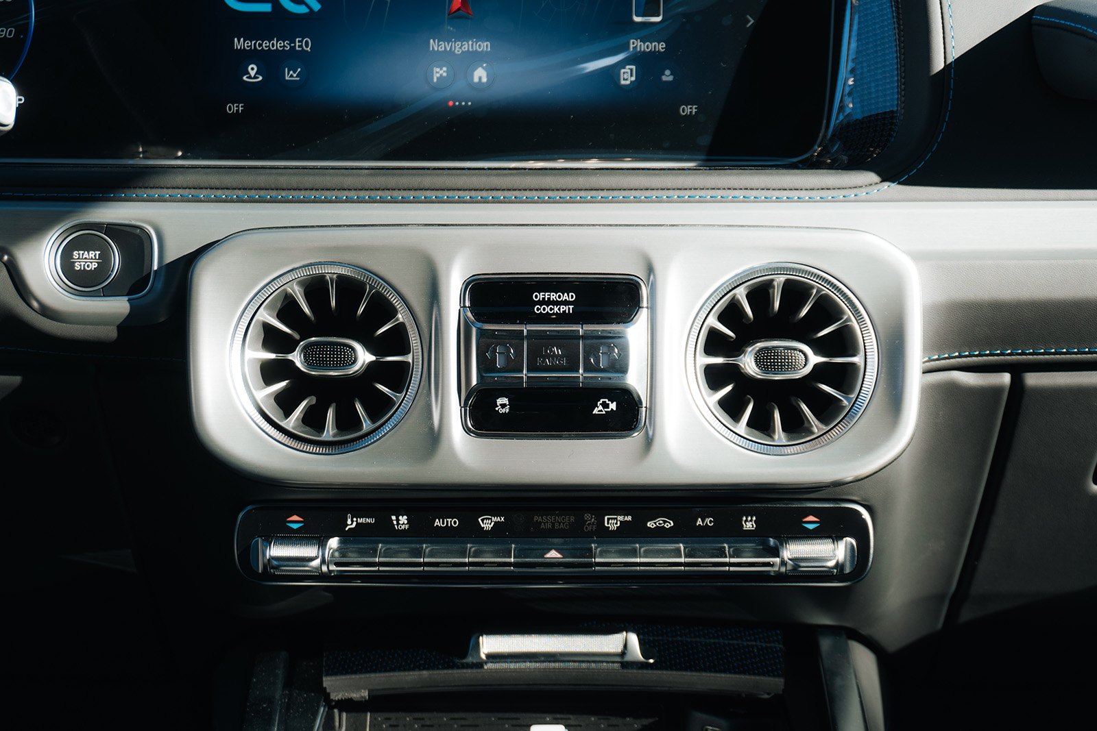 Ефект? Електричната G-Class лесно ќе вози на пат со наклон од 35 степени, а исто така ќе совладува вода длабока до 850 мм. Ова е подобар резултат отколку во случајот со класичната G-Class со мотор со внатрешно согорување, каде што воздушниот пристап до моторот е ограничен. Аголот на пристап е 32 степени, аголот на поаѓање е 30,7 степени и аголот на прекршување е 20,3 степени.
