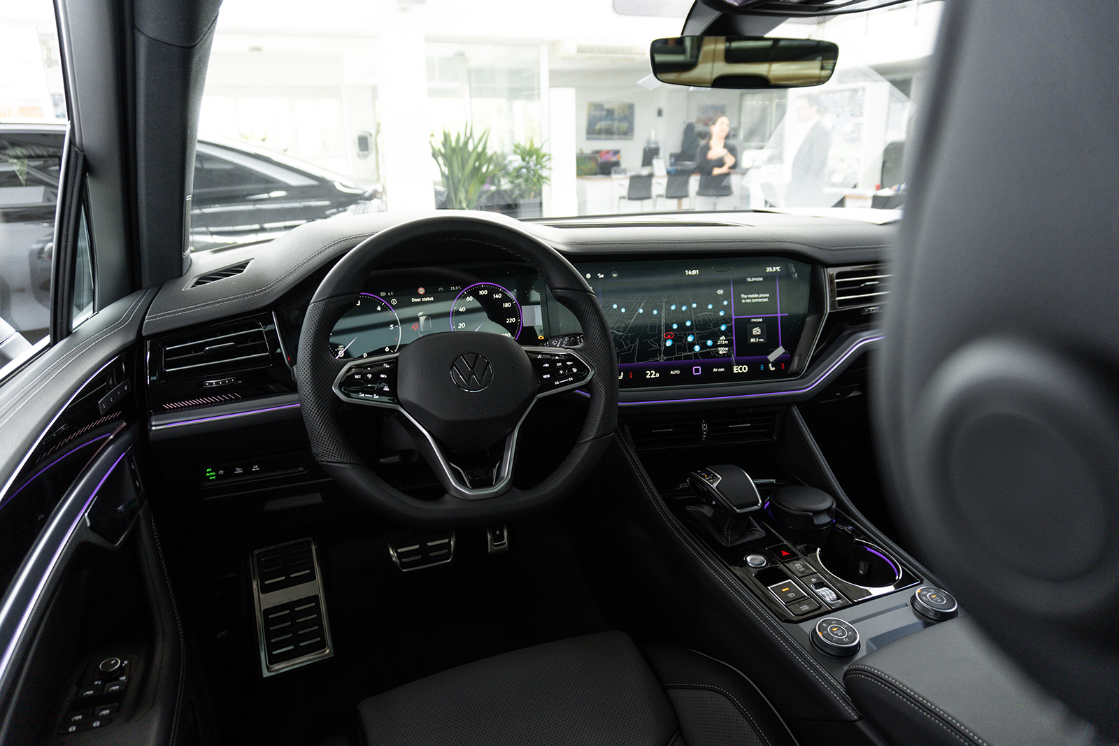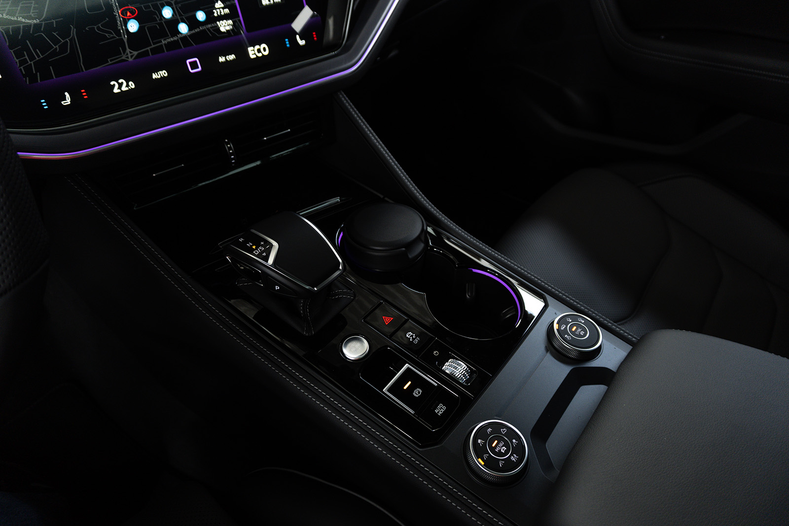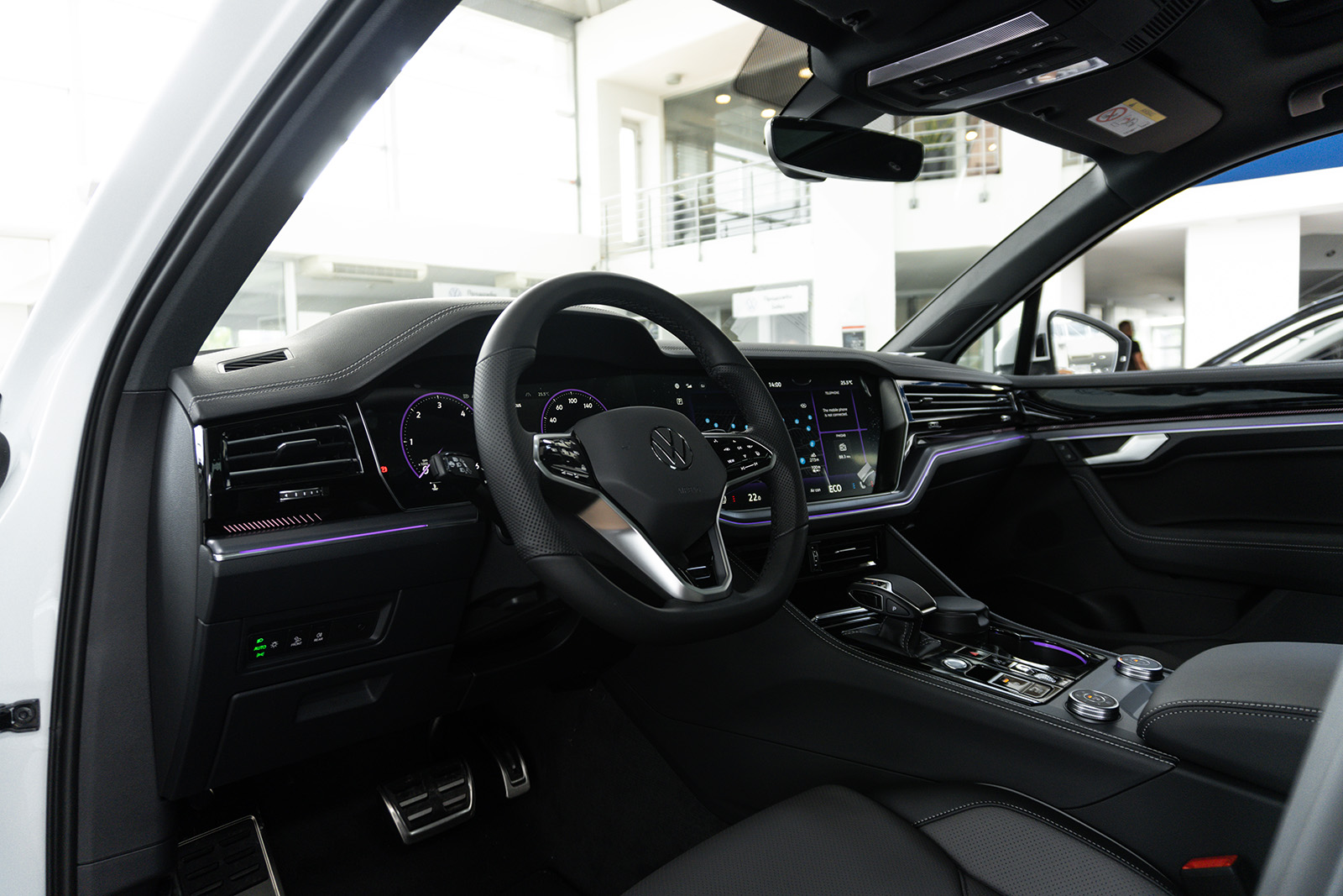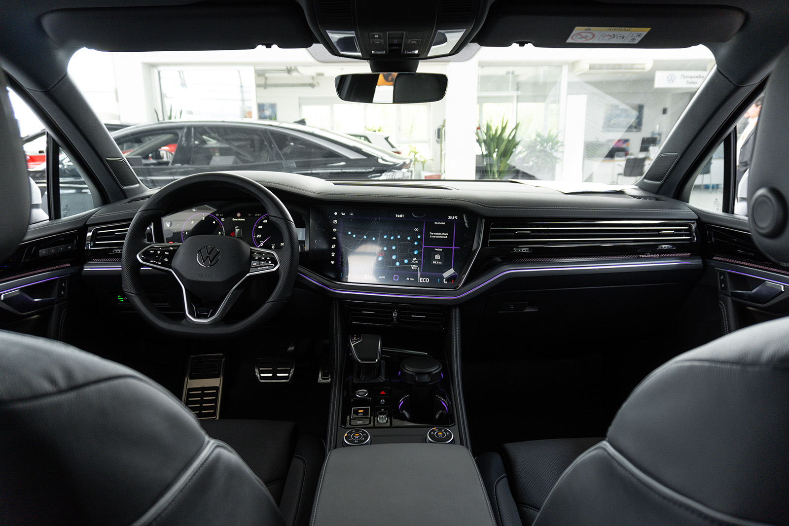 Освежениот Touareg доби и нови бои за внатрешните работи и освежена мултимедијална графика на Innovision концептот (сега опремен со безжичен Apple CarPlay и Android Auto). Има и USB-C приклучоци и нов Dynaudio аудио систем со моќност од 730W. Практичноста овде остана на исто високо ниво. Истото може да се каже и за прилично добрата завршница.