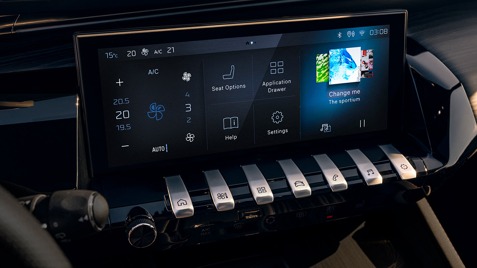 Внатре се остана „како и обично“. Всушност, единствената новост овде е поновиот мултимедијален софтвер (и потенцијално променет хардвер) кој поддржува онлајн ажурирања. Сепак, сè уште се користи 10-инчен дисплеј. Инструмент таблата доби нова графика, но и овде нема ништо ново. 12-инчниот екран остана на своето место и не ја доби 3D функцијата позната од моделите 208 и 308.