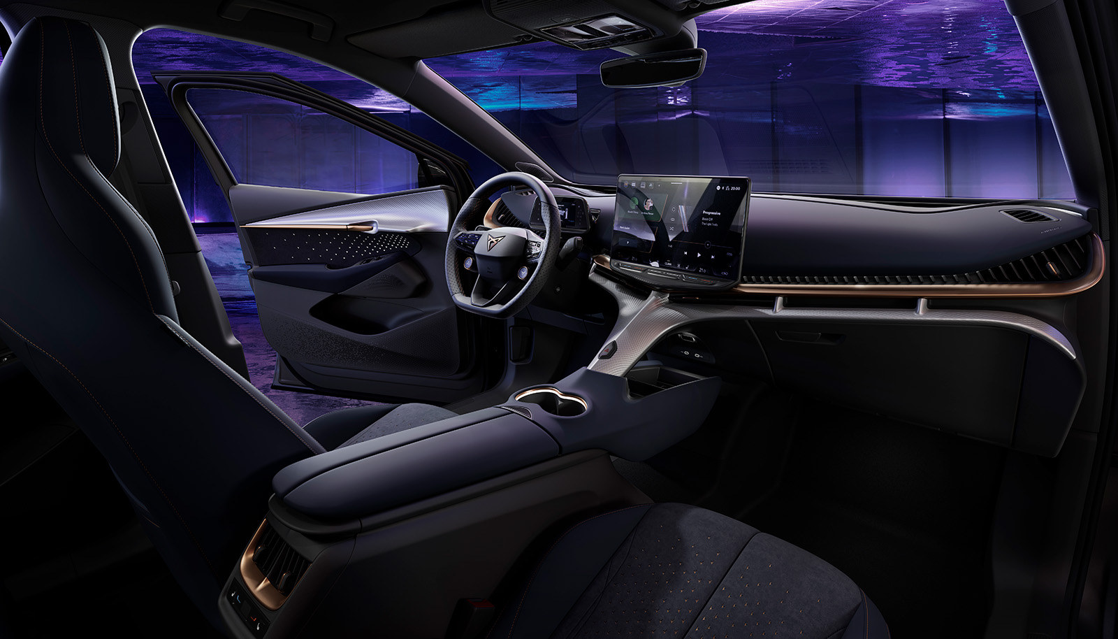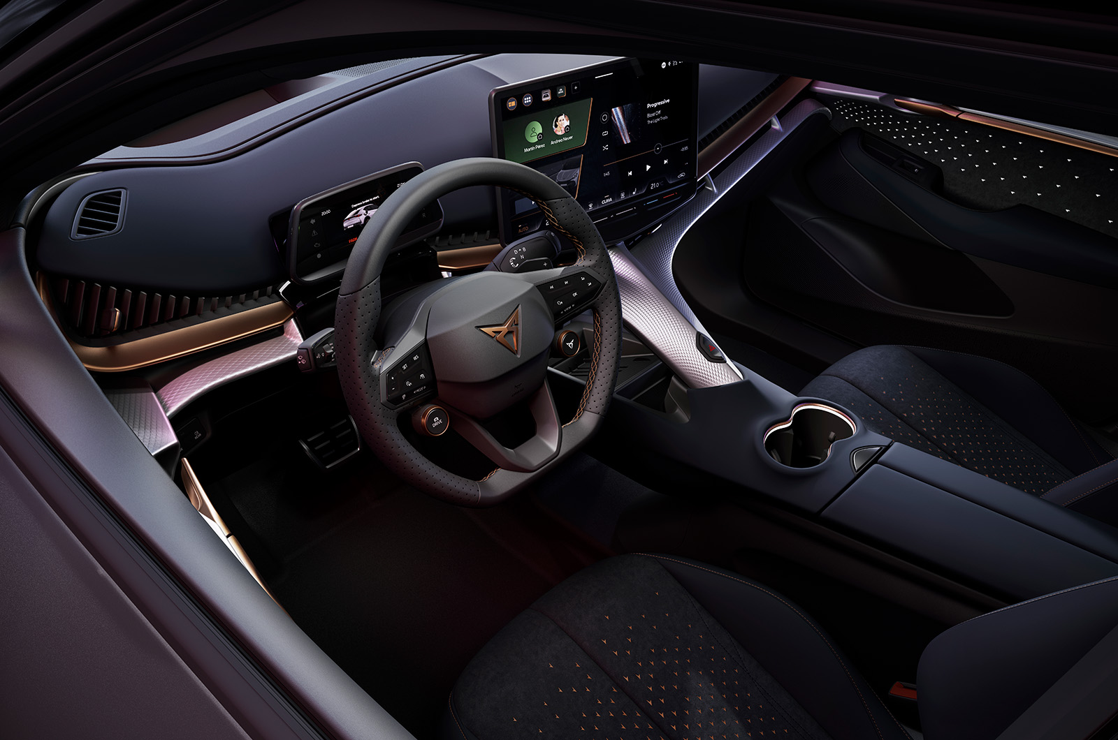 Cupra Tavascan има подеднакво уникатен и интересен ентериер. Овој автомобил совршено покажува дека Cupra Born е создаден врз основа на сосема различни претпоставки, а брендот еволуираше оттогаш. Tavascan доби уникатен кокпит, полн со остри линии и интересно осветлување.