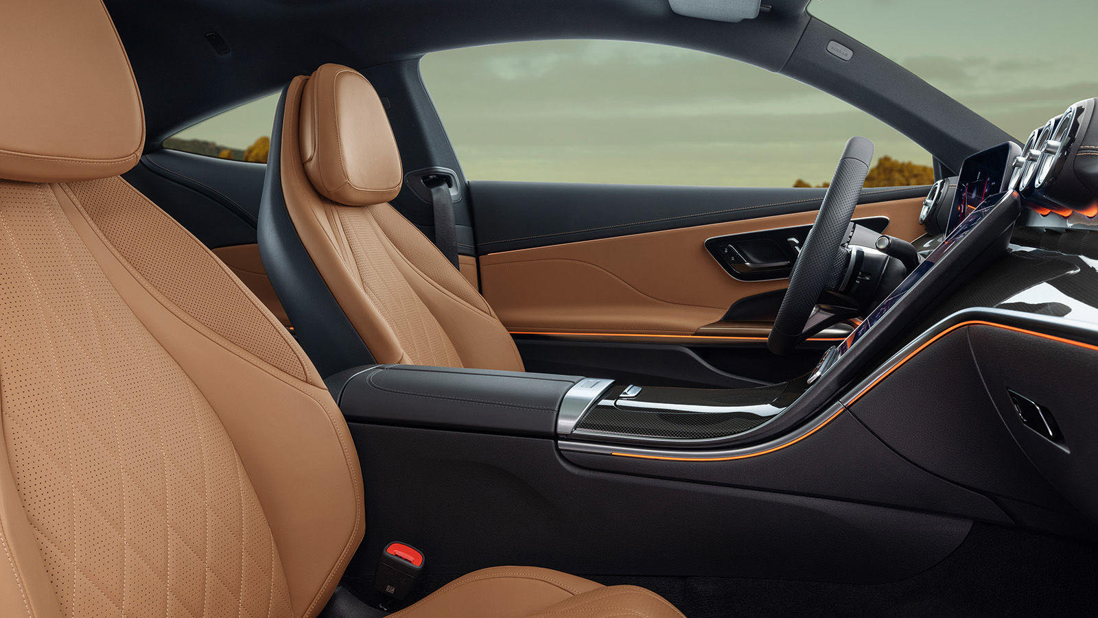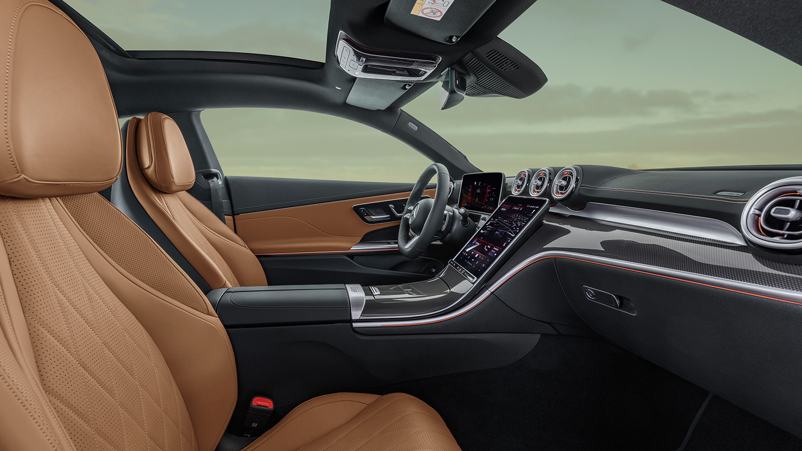 Внатрешноста на Mercedes CLE е целосно префрлена од C-Class. Ова значи дизајн типичен за новите автомобили на марката, со хоризонтален MBUX екран и карактеристични отвори за воздух. Мултимедијата го користи новиот софтвер кој дебитираше во E-Class. Ова значи пристап до многу апликации, вклучувајќи игри (Angry Birds) и TikTok.