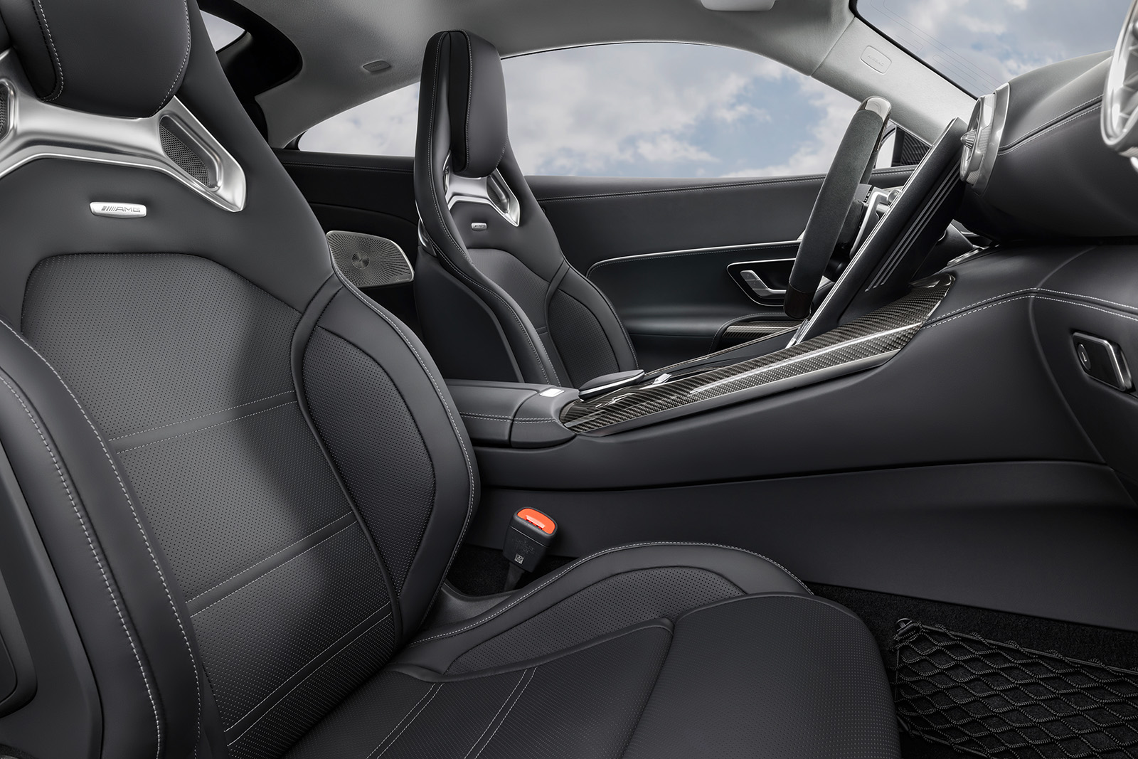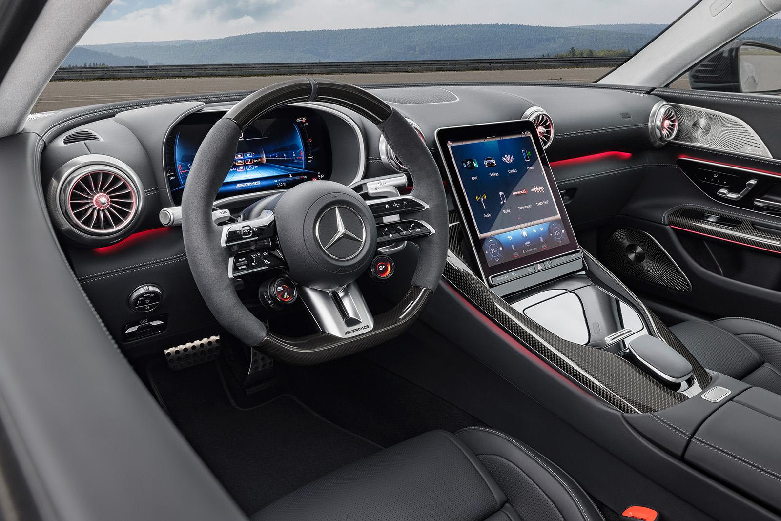 Внатрешноста е скоро идентична како и кај Mercedes SL. Но, германците одлучија дека кај AMG GT е потребна пообемна опрема. Така, имаме мултимедијален екран со новиот MBUX систем од 11,9 инчи, голем дисплеј зад воланот и карактеристични кружни отвори за воздух на централната конзола и на страните на контролната табла. Целата работа го загуби спортскиот карактер, но ќе биде попрактична и покорисна.