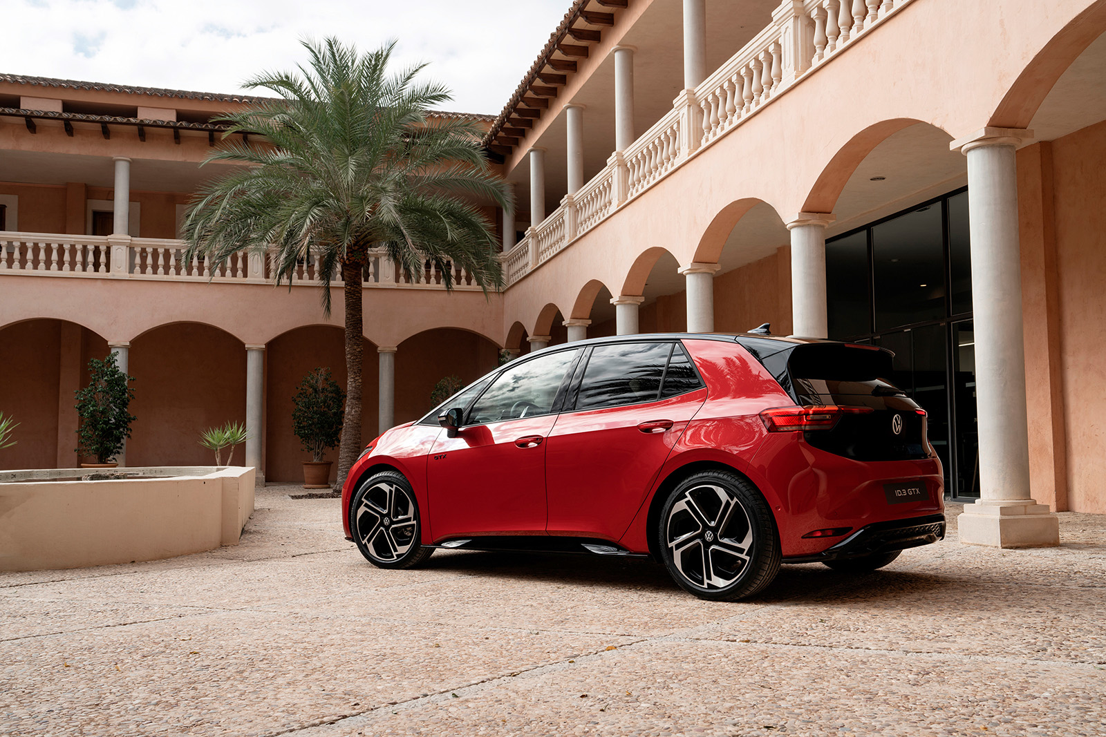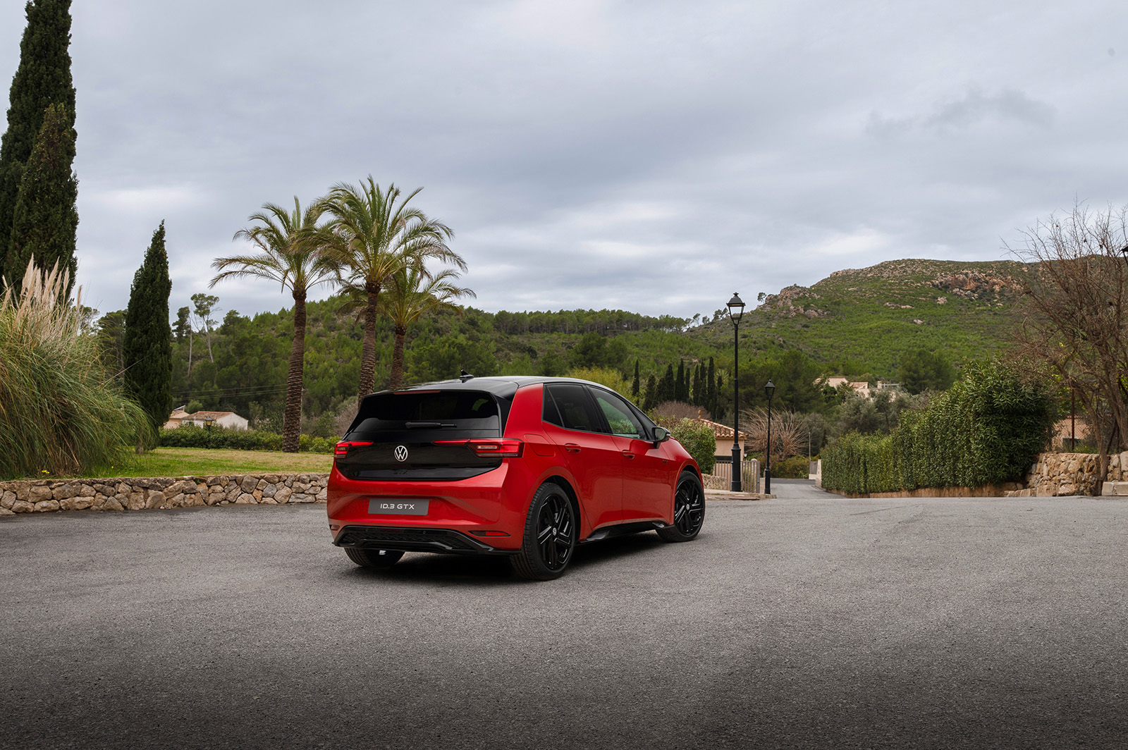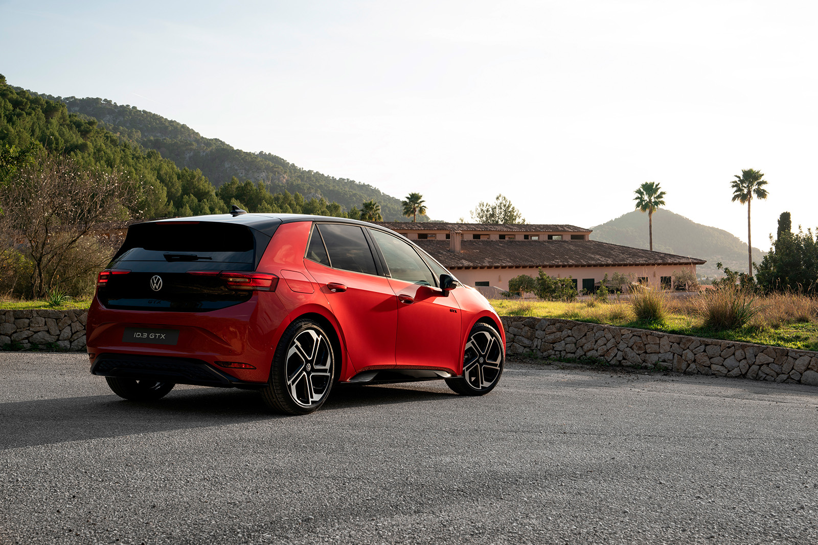 Volkswagen ID.3 GTX се одликува со неколку визуелни промени. Ќе најдете различен браник напред (со нови дневни светла) и различен браник назад, карактеристични бандажи од 20 инчи, црни елементи и црн покрив. Има и амблеми GTX и King’s Red бојата што ја разликува оваа серија.