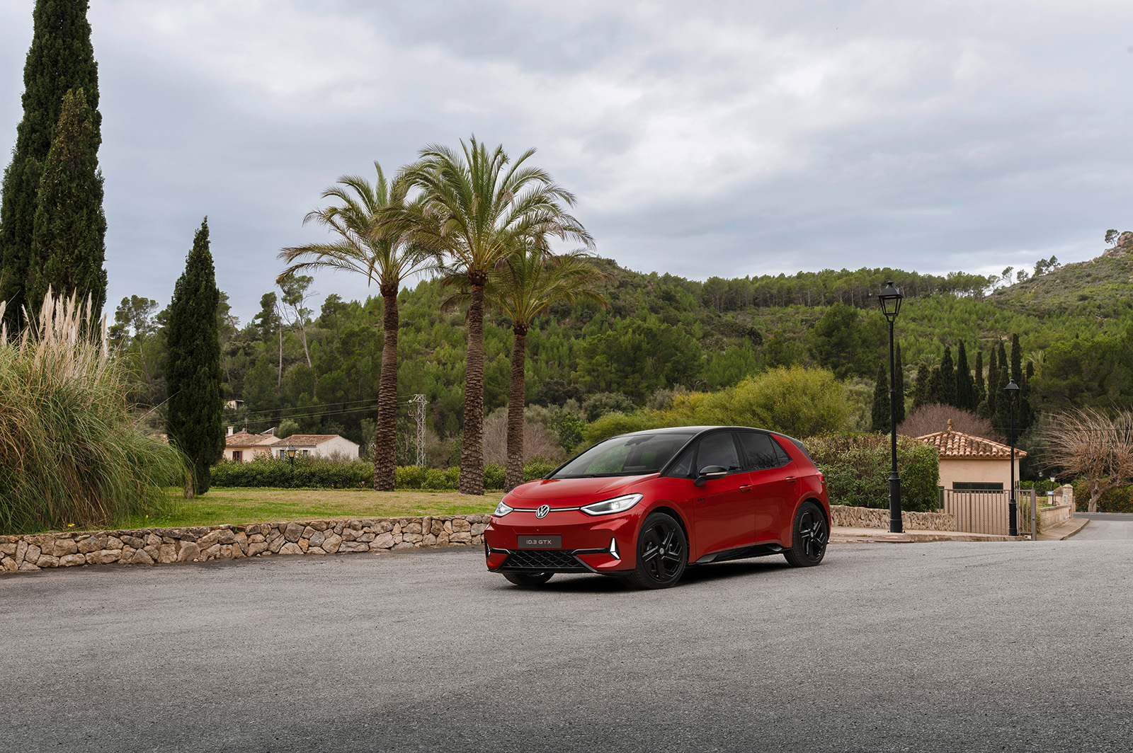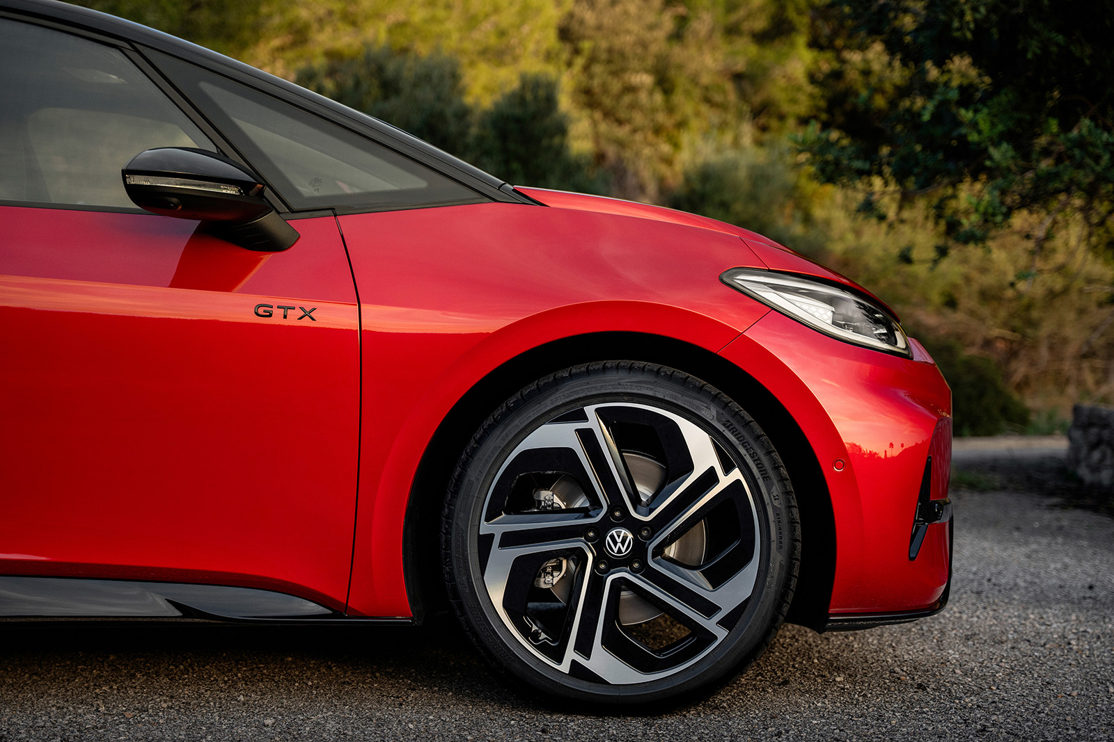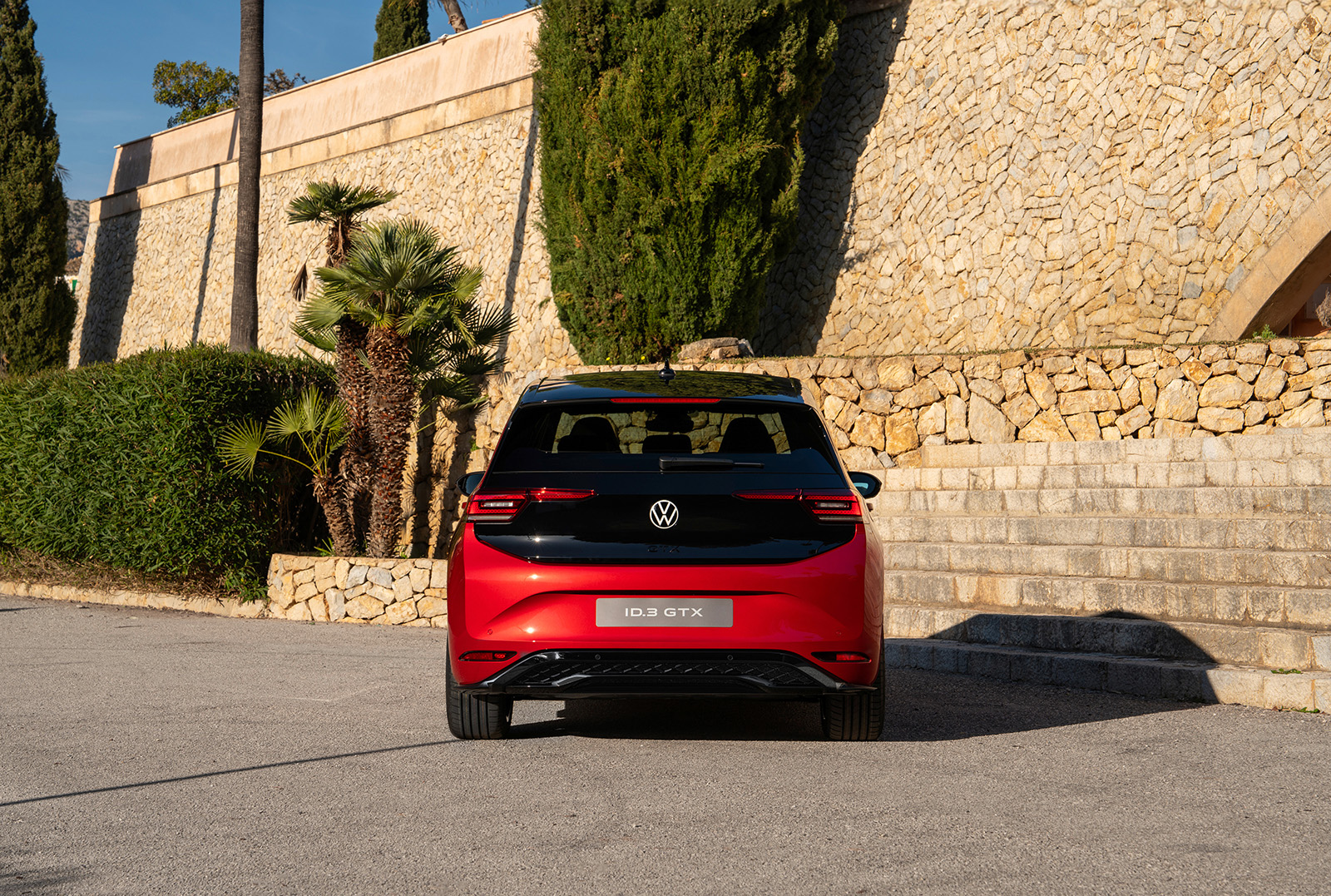 Volkswagen ID.3 GTX се одликува со неколку визуелни промени. Ќе најдете различен браник напред (со нови дневни светла) и различен браник назад, карактеристични бандажи од 20 инчи, црни елементи и црн покрив. Има и амблеми GTX и King’s Red бојата што ја разликува оваа серија.