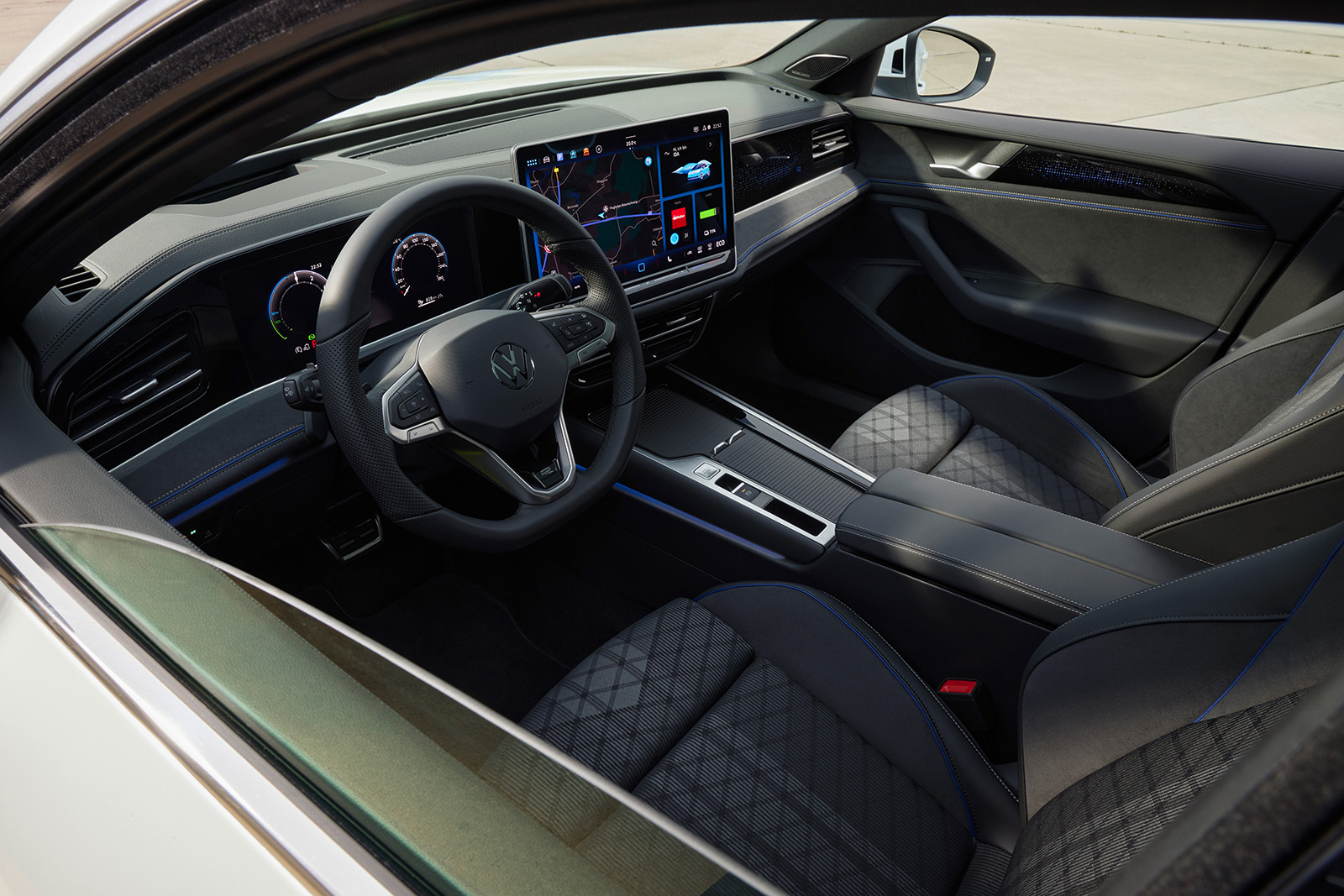 Откако ќе ја отворите вратата, ќе видите едноставен и не многу откривачки ентериер. Концептот на кокпитот овде е комбинација на идеи од Volkswagen Golf и ID.7. На контролната табла владее голем екран од 13 или 15 инчи (во зависност од верзијата), а зад воланот се кријат дигитални инструменти. Бројот на копчиња е сведен на минимум и изненадувачки, тактилните прекинувачи не се напуштени.
