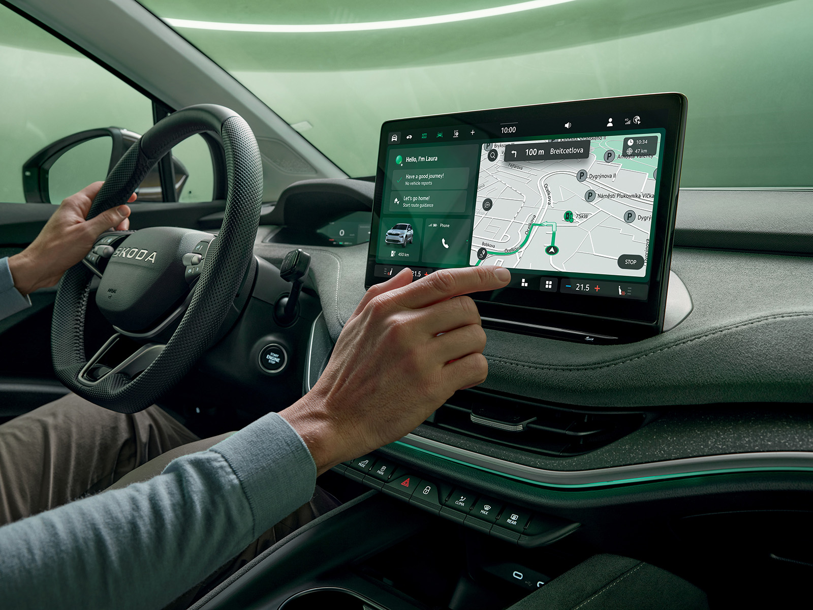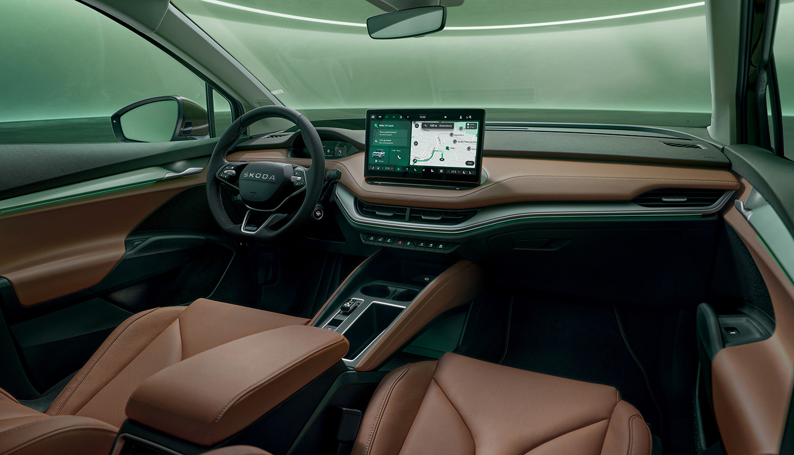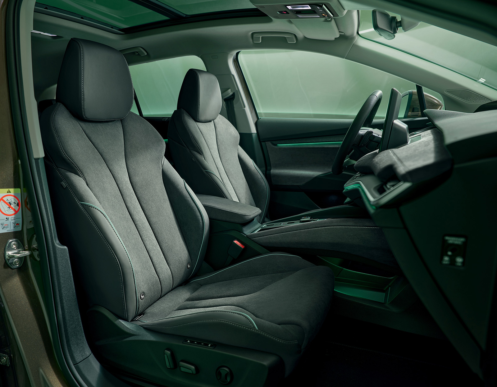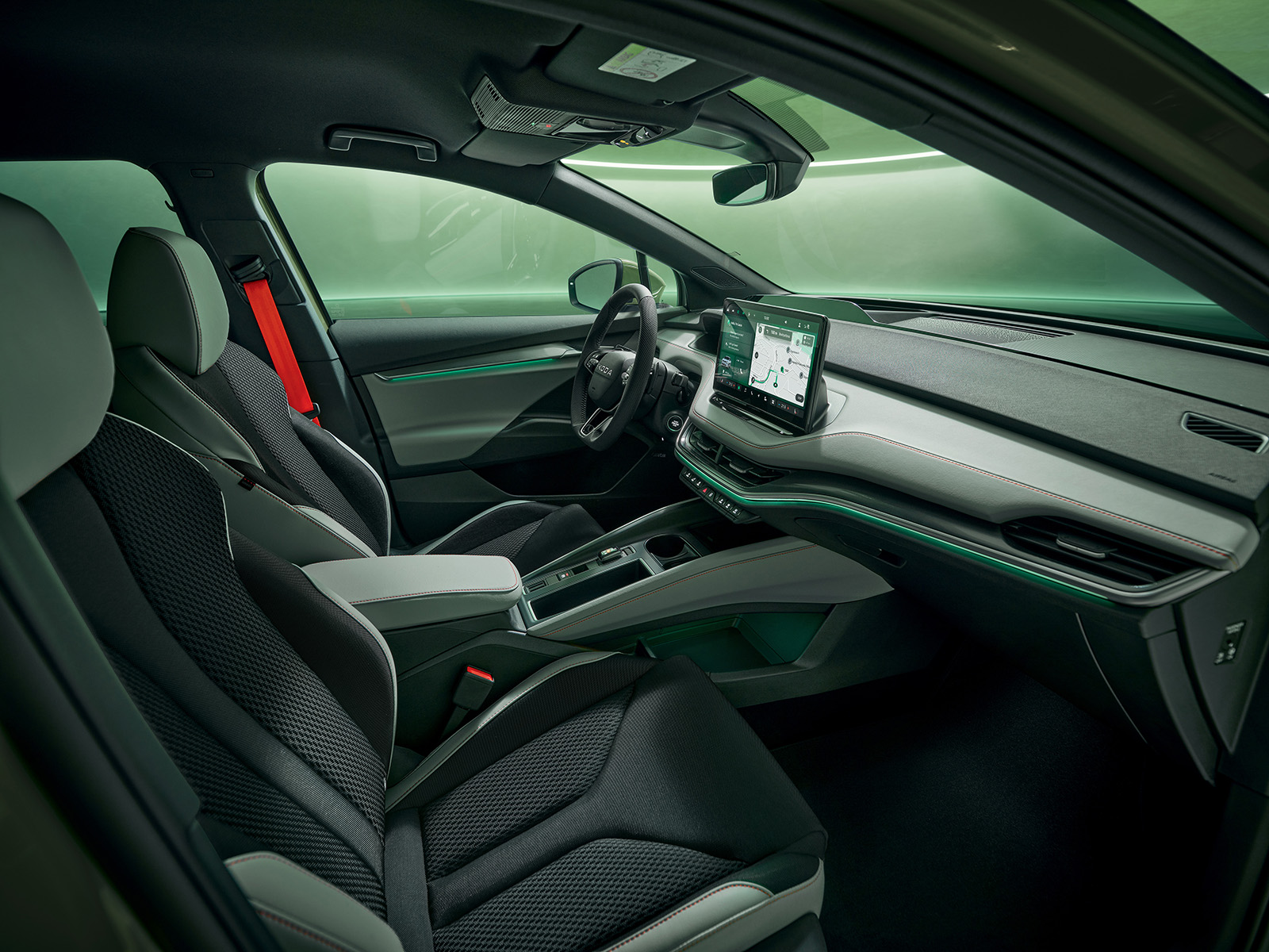 Внатрешност: исто како порано, но со некои подобрувања. Кабината на новиот Enyaq доби суптилни, но значајни промени. Високиот квалитет на материјалите е задржан, а додадени се и нови опции за украсување на ентериерот, наречени „Design Selections“.