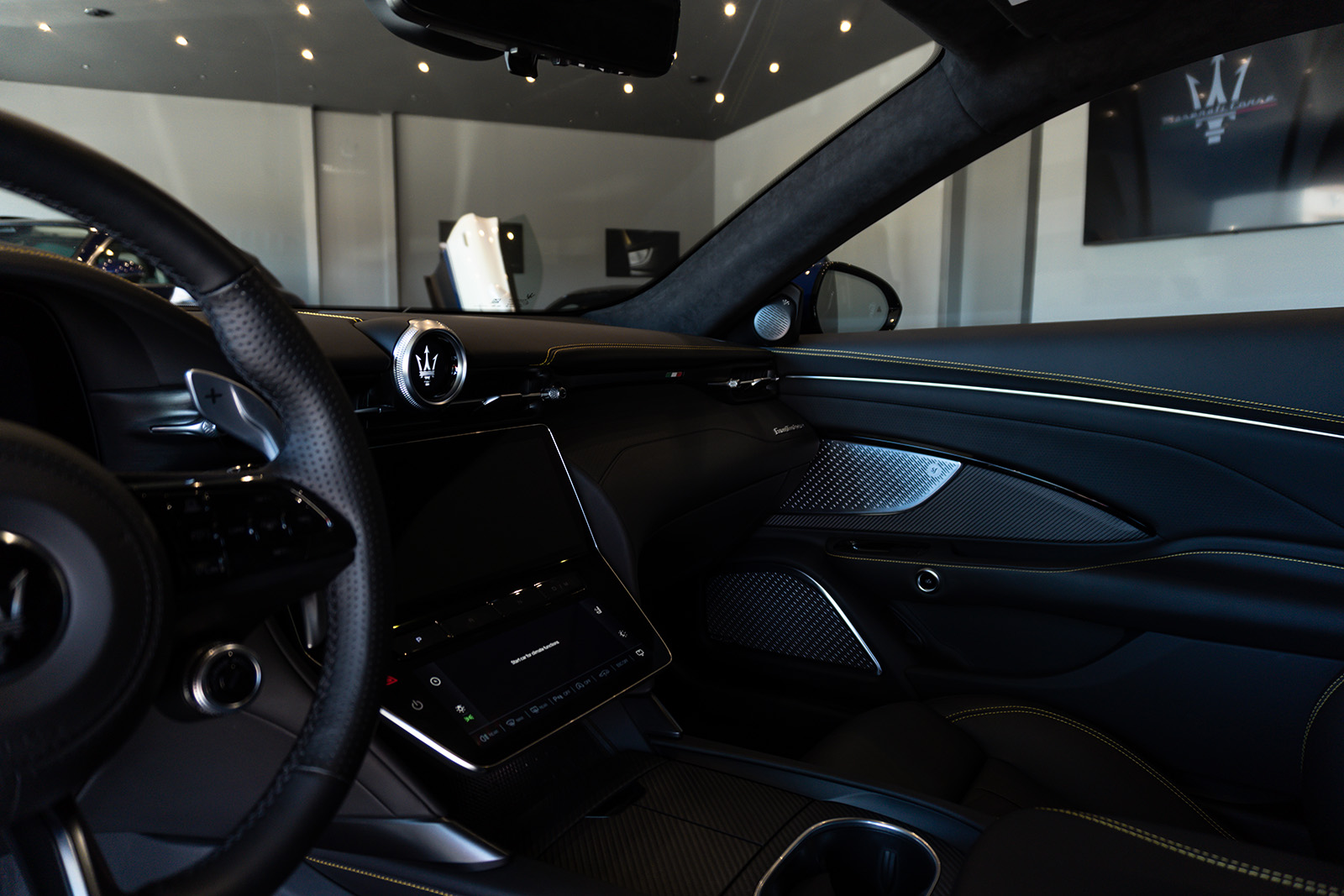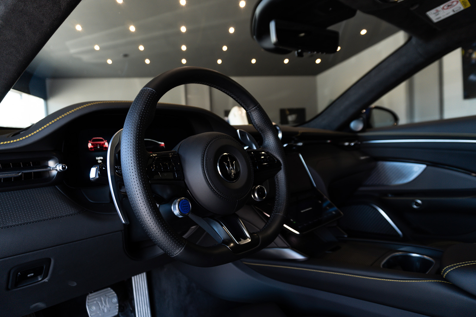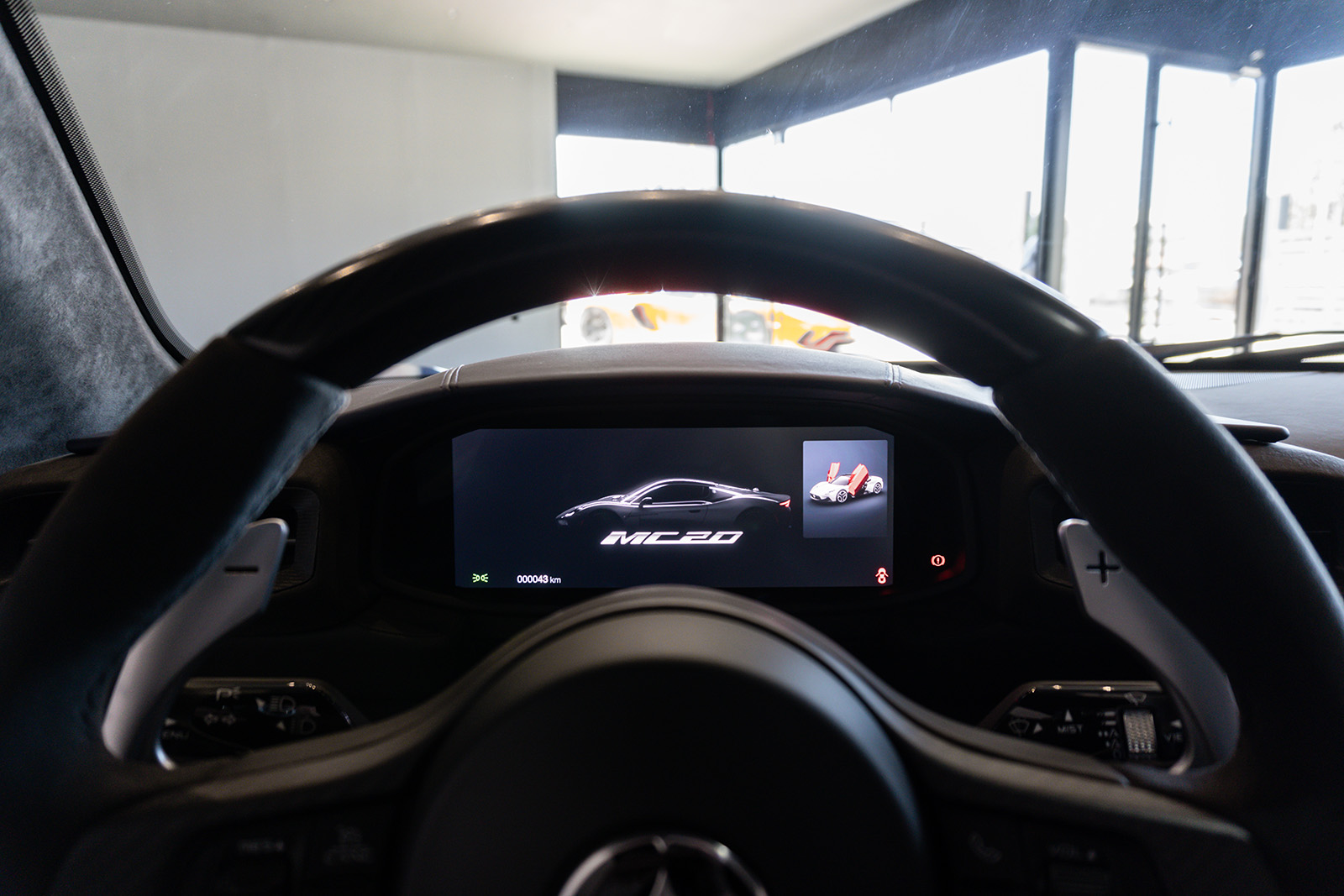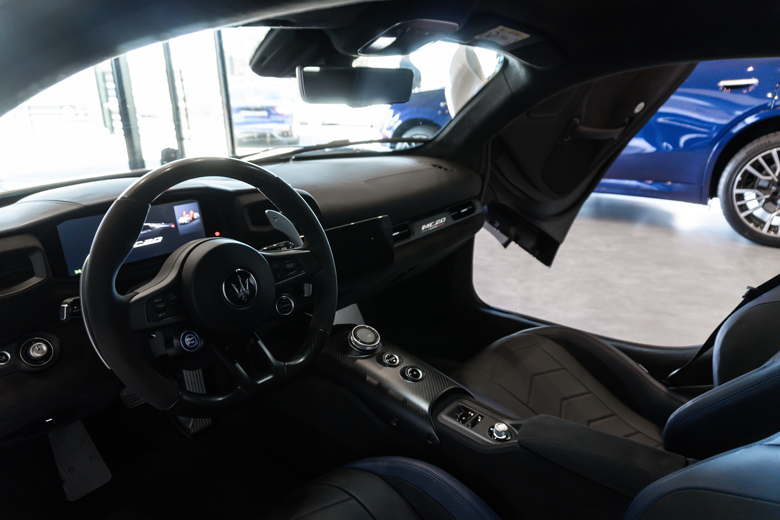 Кабината на Maserati MC20 не пречекува со минимализам и одлични материјали. Впечатливата алкантара е комбинирана со кожа и други висококвалитетни материјали, пријатно опкружувајќи го возачот. Воланот можеби ви изгледа познат – тој е речиси идентичен со оној во Alfa Romeo Giulia и Stelvio. Има и копчиња на воланот, иако имаат малку поинаква функција. Зад воланот има две големи лопатки кои управуваат со менувачот. Тие се прикачени на управувачкиот столб така што секогаш се во совршена положба.