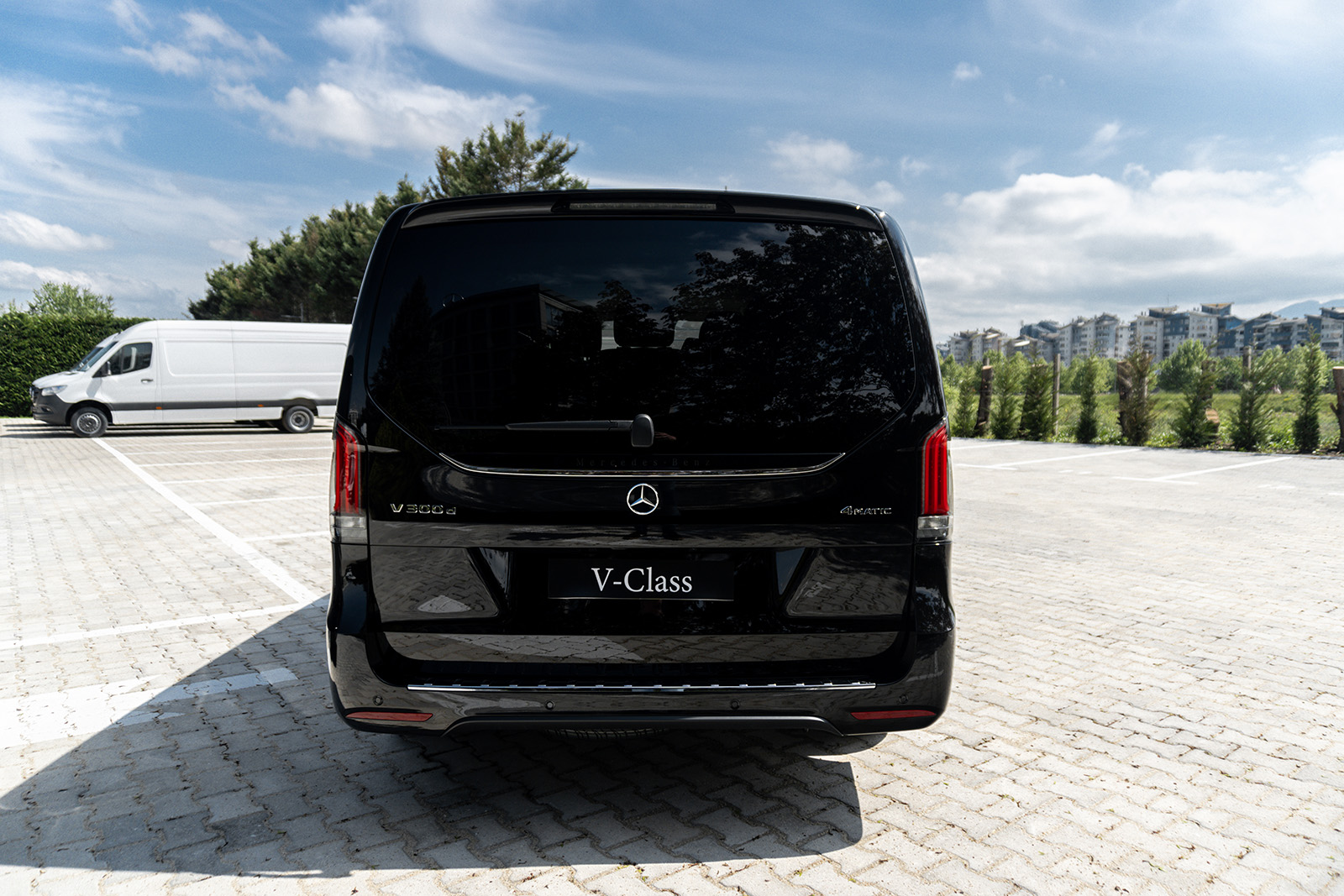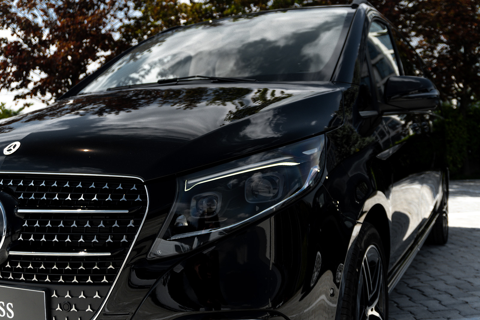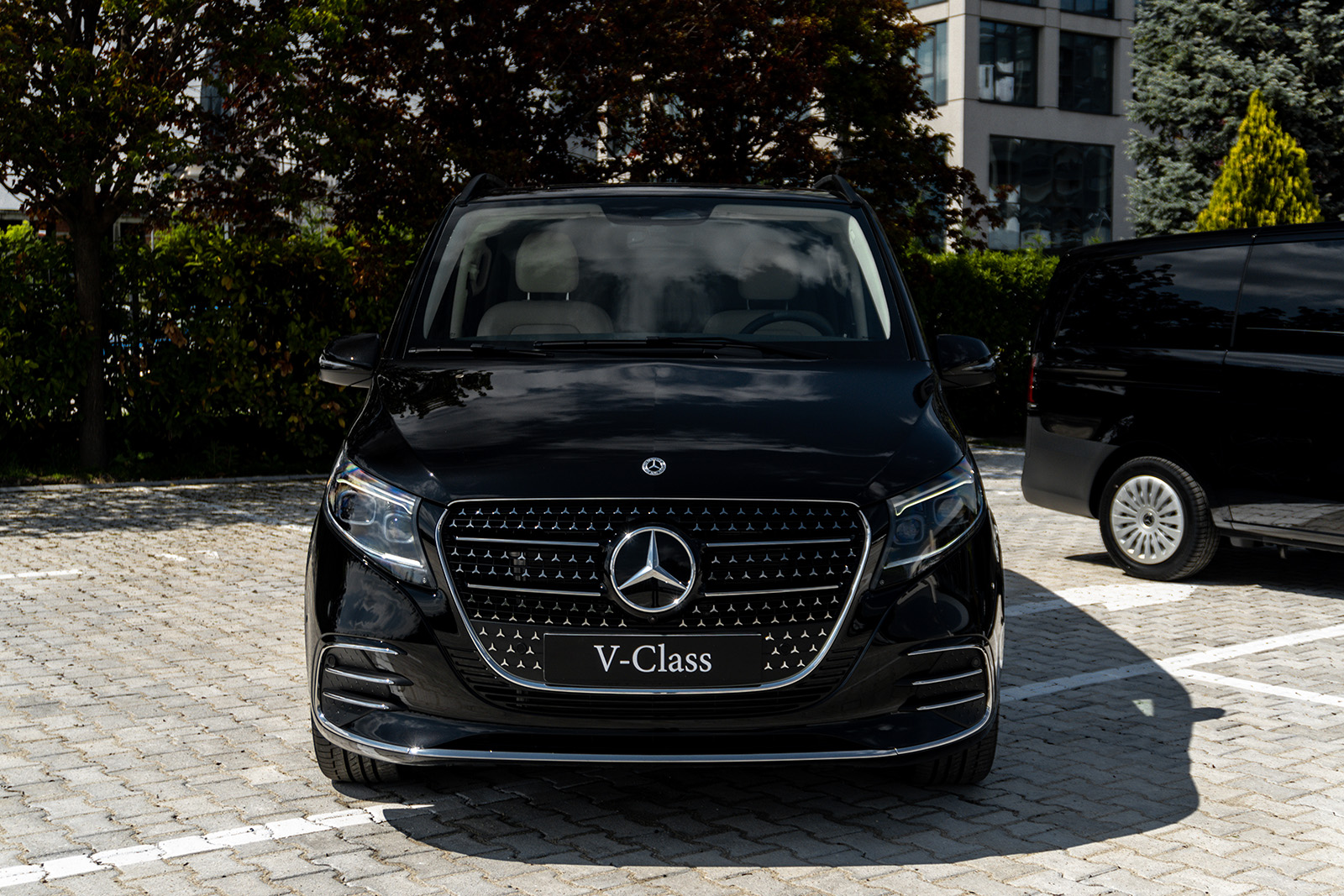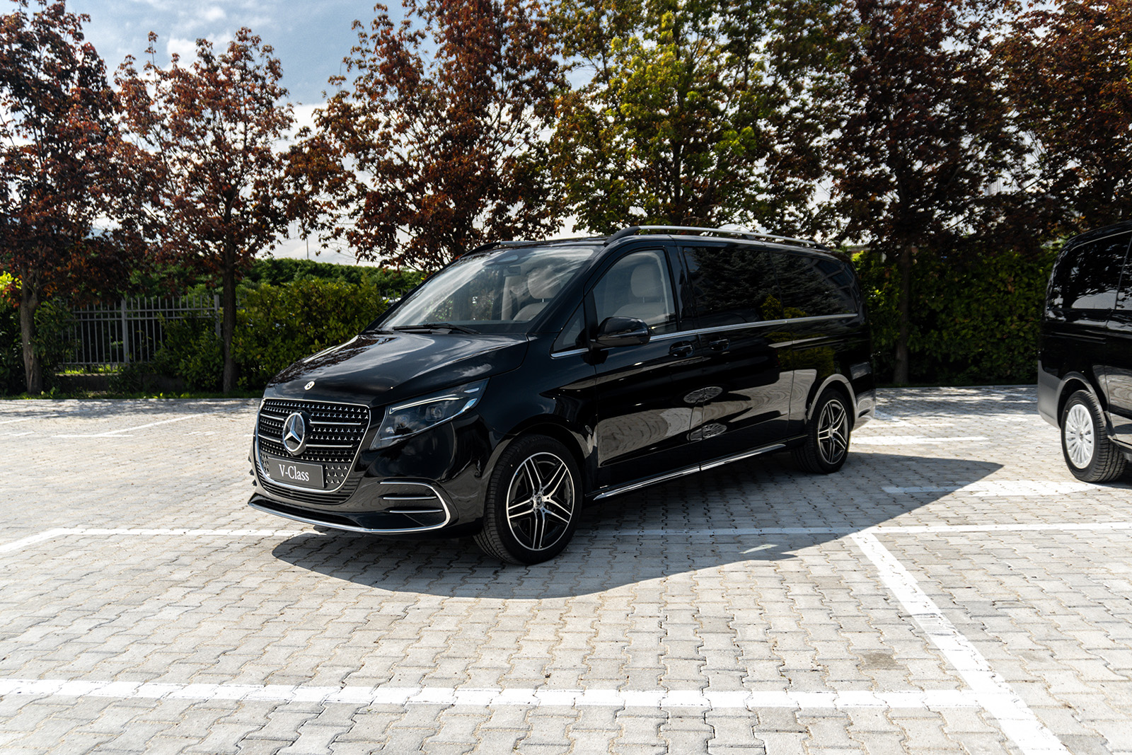 Од друга страна, Новиот луксузен Mercedes V-Class доби долга листа на новитети. Најпрво овде наоѓаме огромна хромирана решетка и карактеристично лого на Mercedes на хаубата. Покрај тоа, има и 19-инчни бандажи скриени во крилата на тркалата. Конкретниот примерок е во AMG-Line варијанта, а тоа значи малку „поспортски“ изглед и неколку интересни детали.
