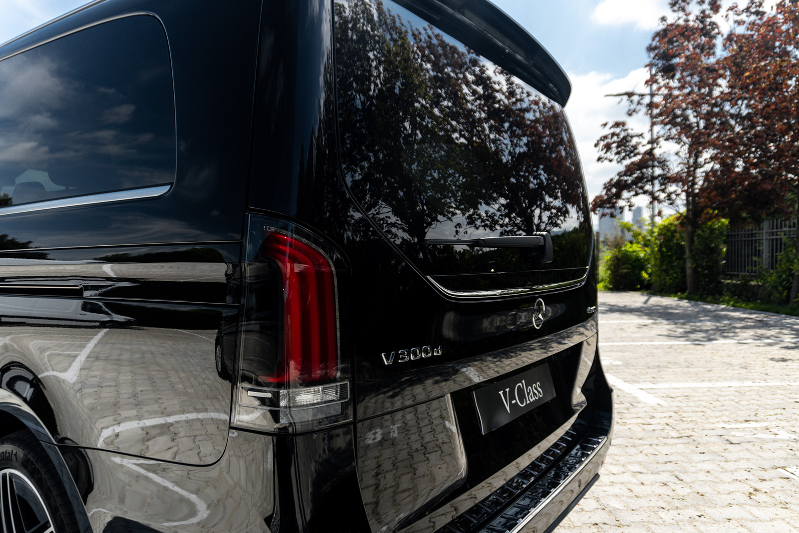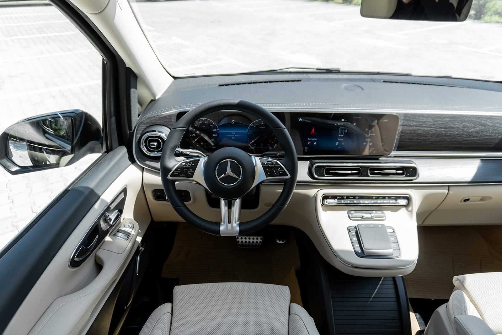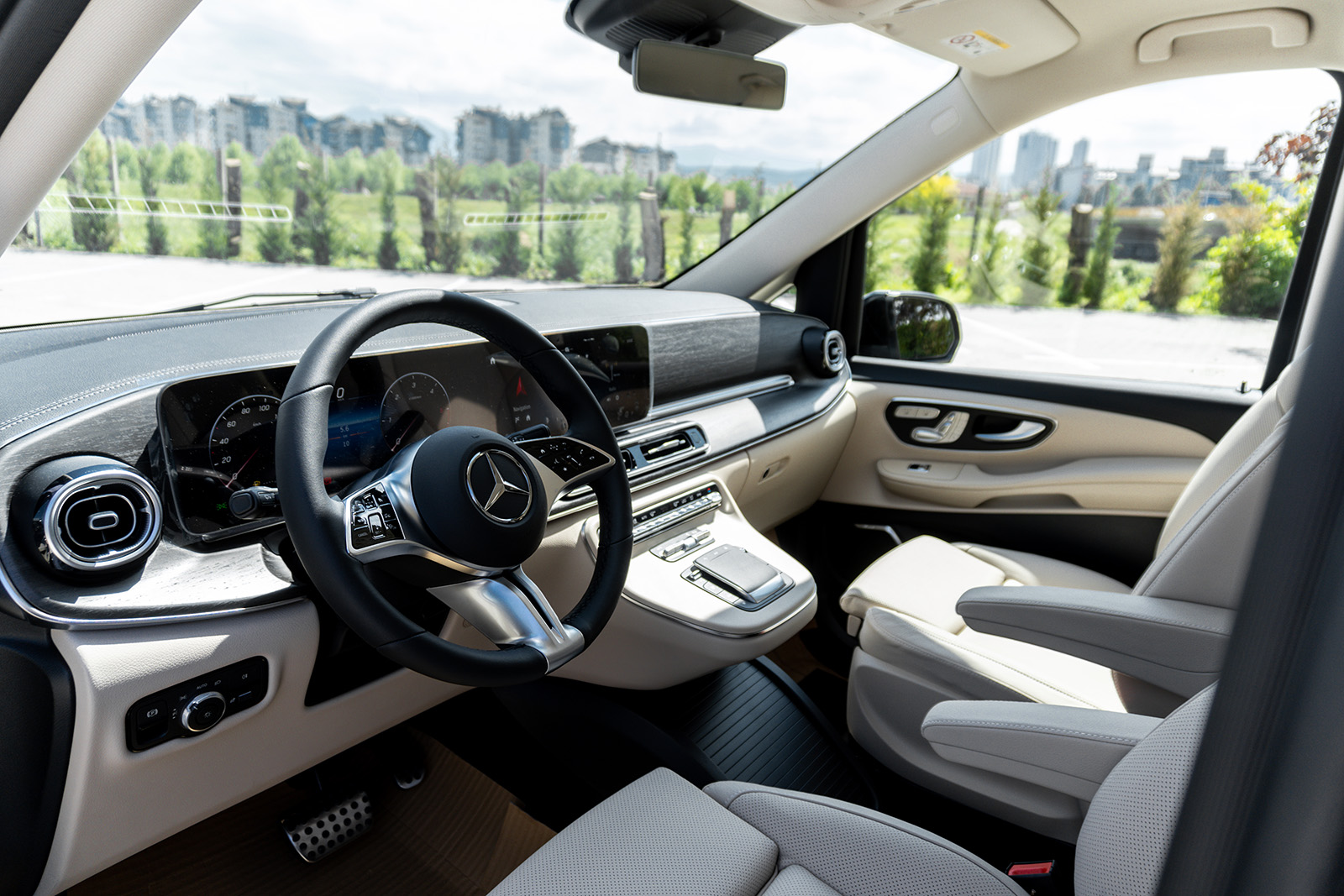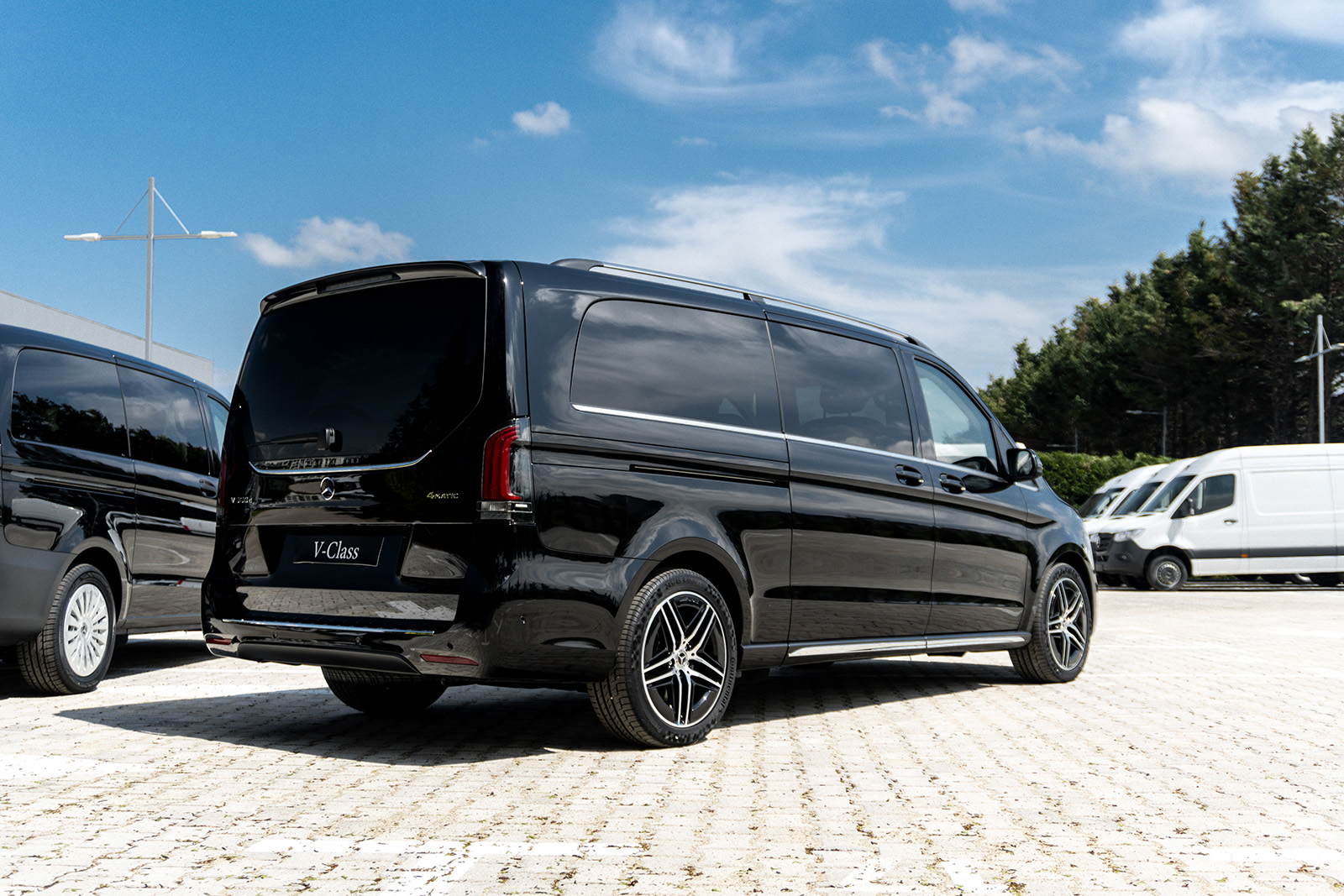 Од друга страна, Новиот луксузен Mercedes V-Class доби долга листа на новитети. Најпрво овде наоѓаме огромна хромирана решетка и карактеристично лого на Mercedes на хаубата. Покрај тоа, има и 19-инчни бандажи скриени во крилата на тркалата. Конкретниот примерок е во AMG-Line варијанта, а тоа значи малку „поспортски“ изглед и неколку интересни детали.