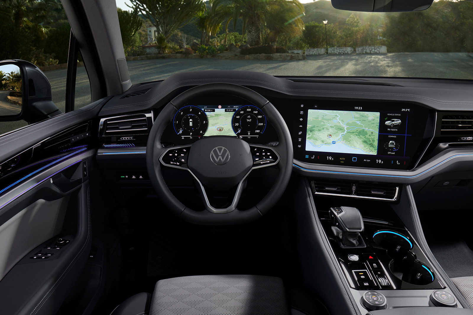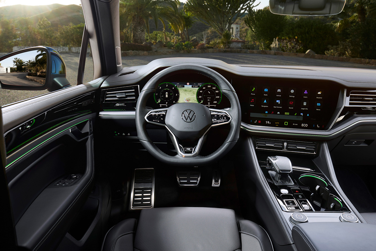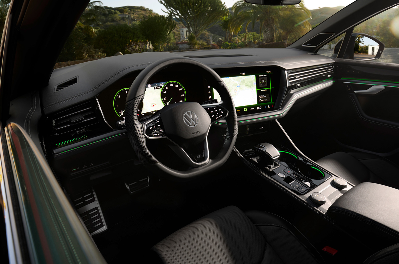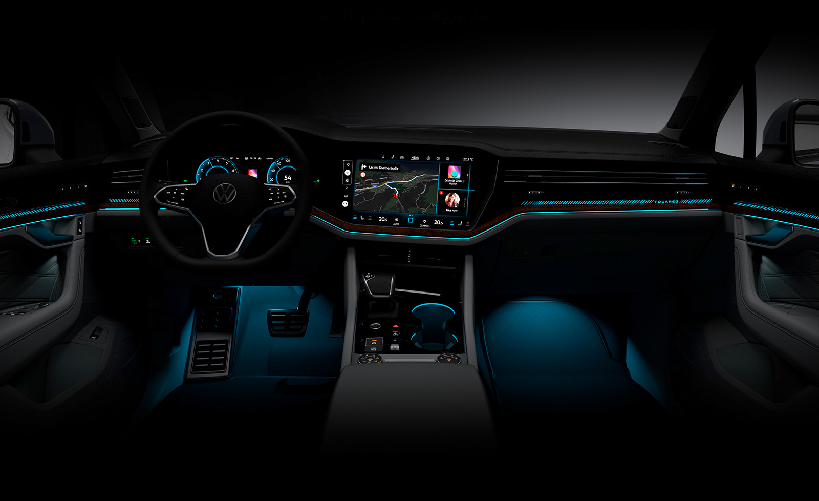 Освежениот Touareg доби и нови бои за внатрешните работи и освежена мултимедијална графика на Innovision концептот (сега опремен со безжичен Apple CarPlay и Android Auto). Има и USB-C приклучоци и нов Dynaudio аудио систем со моќност од 730W. Практичноста овде остана на исто високо ниво. Истото може да се каже и за прилично добрата завршница.