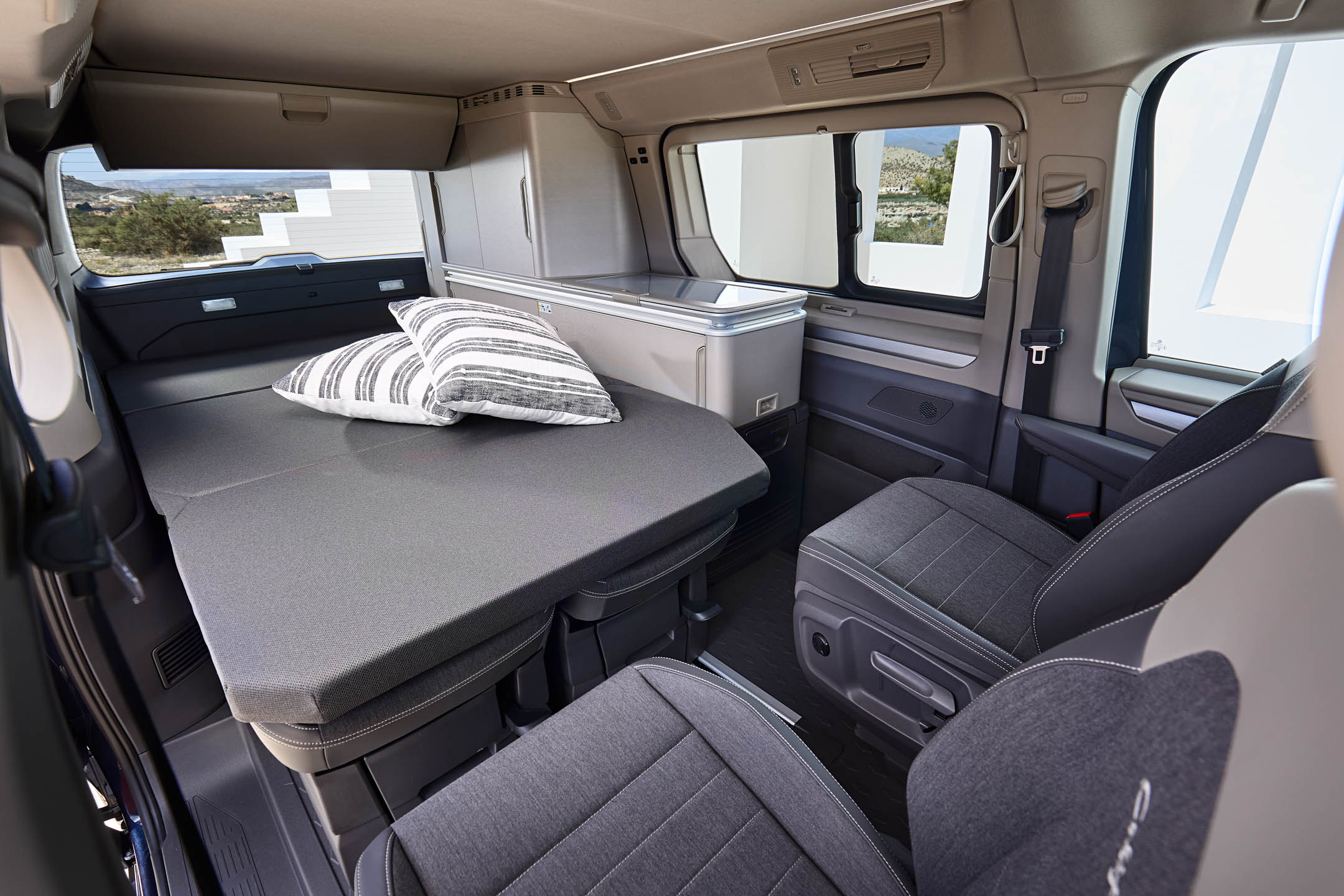 Овој распоред, во комбинација со лизгачки врати кои се отвораат од двете страни, не само што обезбедува поудобен простор за работа и одмор, туку и го олеснува готвењето. Назад, наместо софа, има две индивидуални седишта.