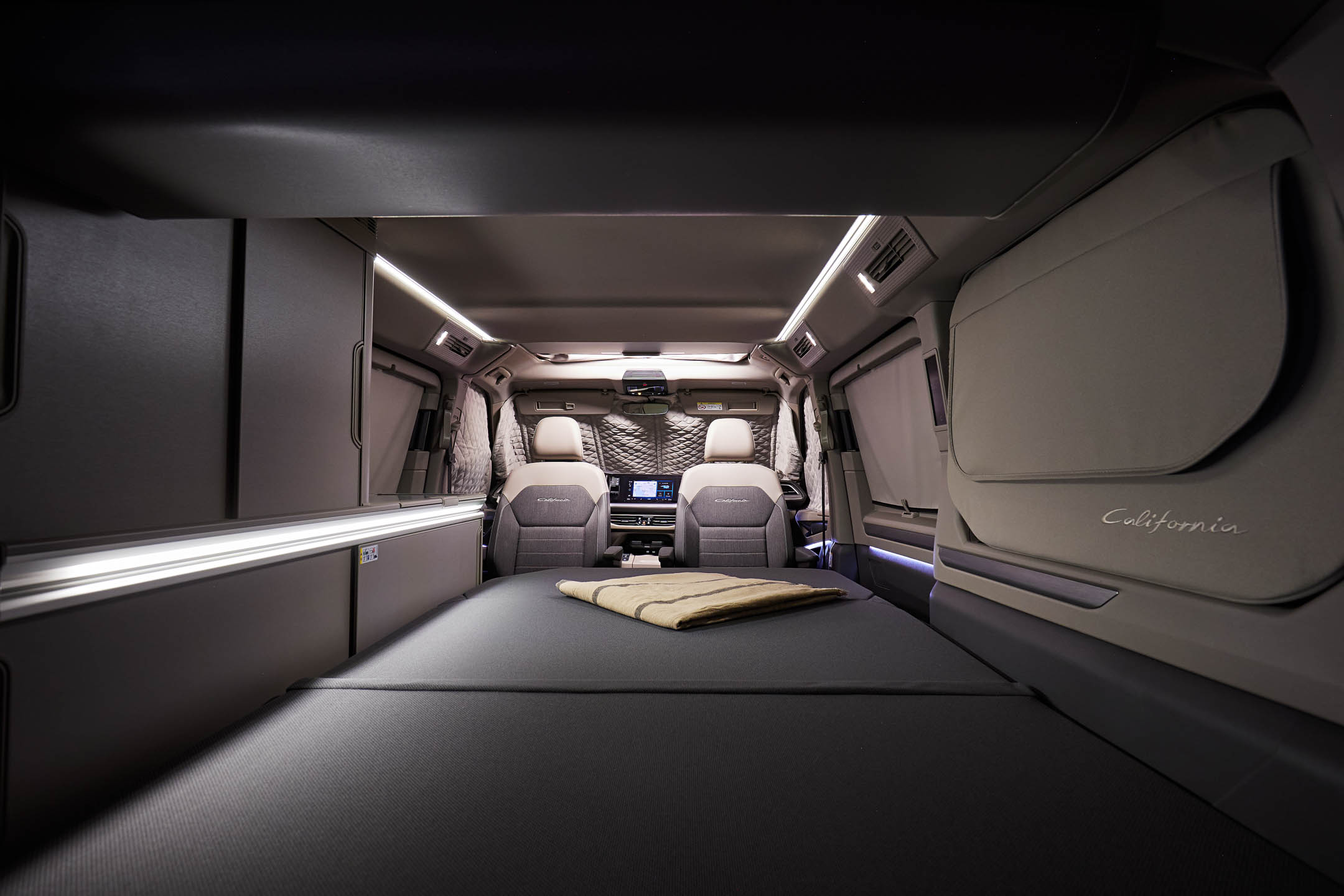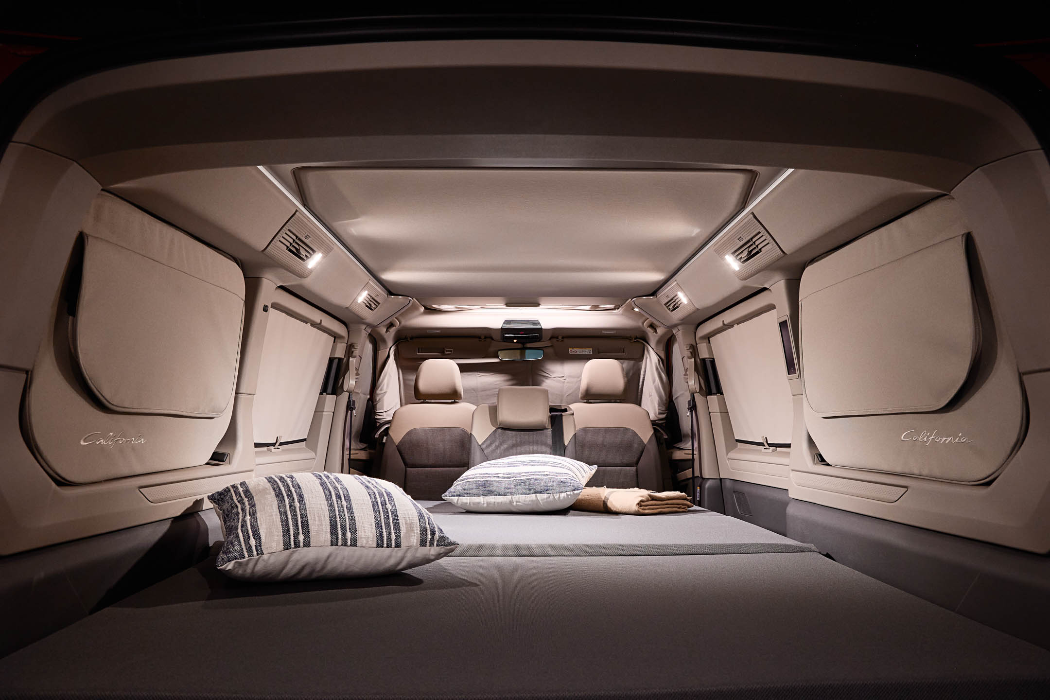 Од верзијата Beach Tour, секоја California има електронска контролна табла за сите удобности, скриена во C-столбот. Покрај тоа, за прв пат автомобилот може да се поврзе со мобилна апликација, која исто така може да се користи за управување со голем број функции. Оваа варијанта вклучува и ротирачки предни седишта, дополнителна батерија од 40 Ah (литиум-железо-фосфат), три задни седишта (лизгачки) и дополнителен преклопен душек што создава втор кревет.