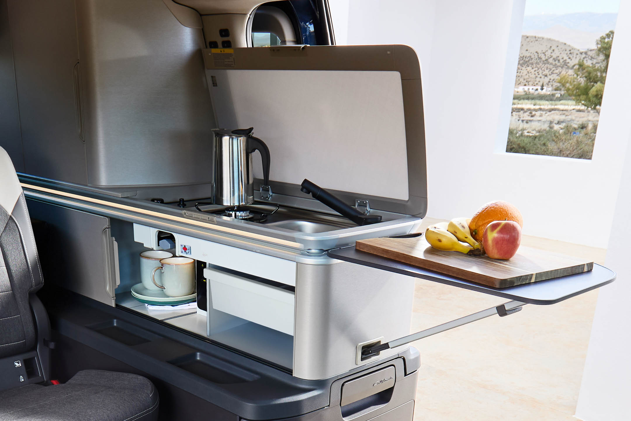 Volkswagen California Coast е кампер со целосна големина во класична верзија. Така, добиваме целосно редизајниран ентериер во споредба со неговиот претходник. Што се смени овде? Како прво, кујната со една рингла е поинаку поставена, фрижидерот е поместен (се отвора како фиока, исто како во Grand California) и мијалникот е сокриен поинаку. Има и многу кабинети за складирање на разни работи.