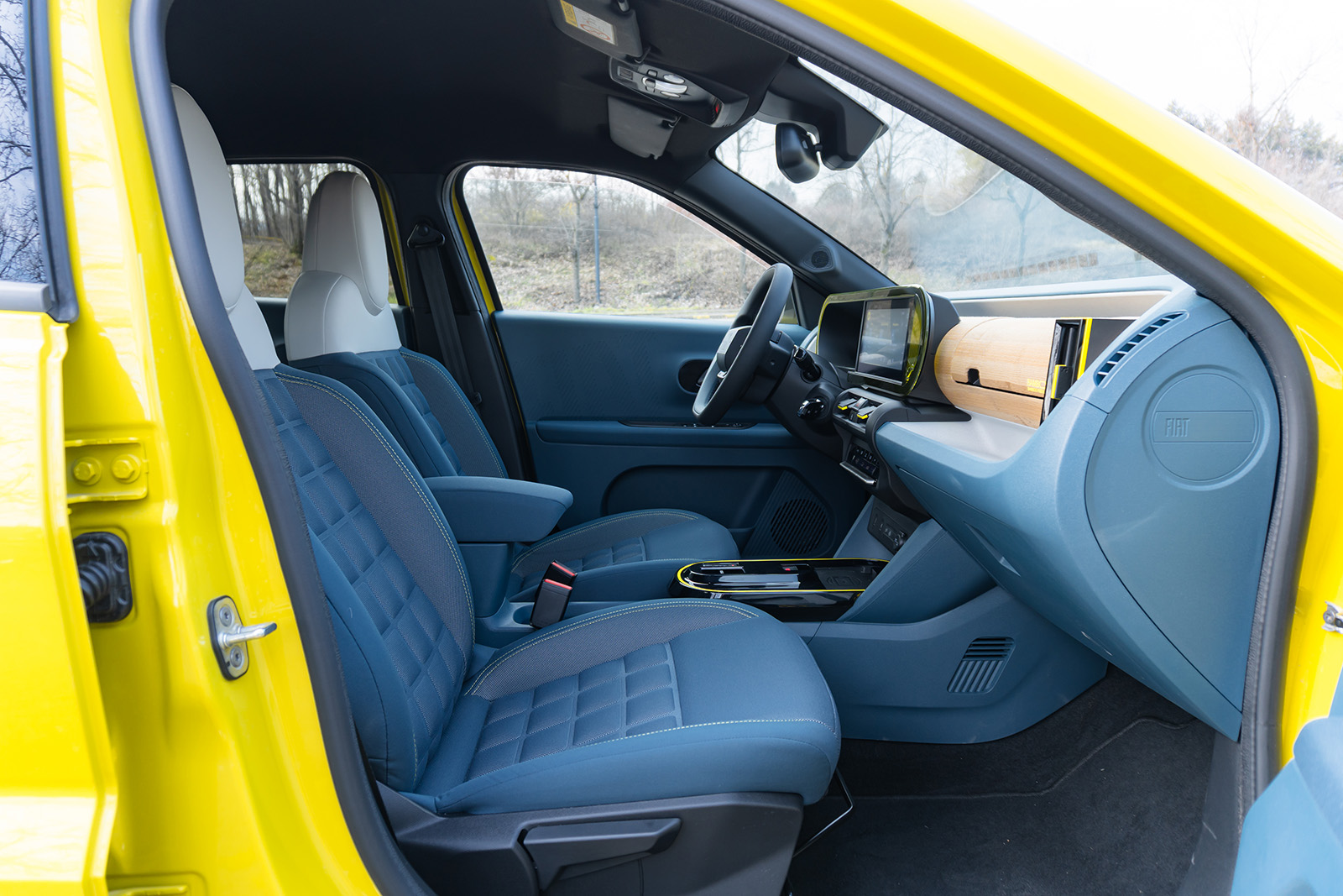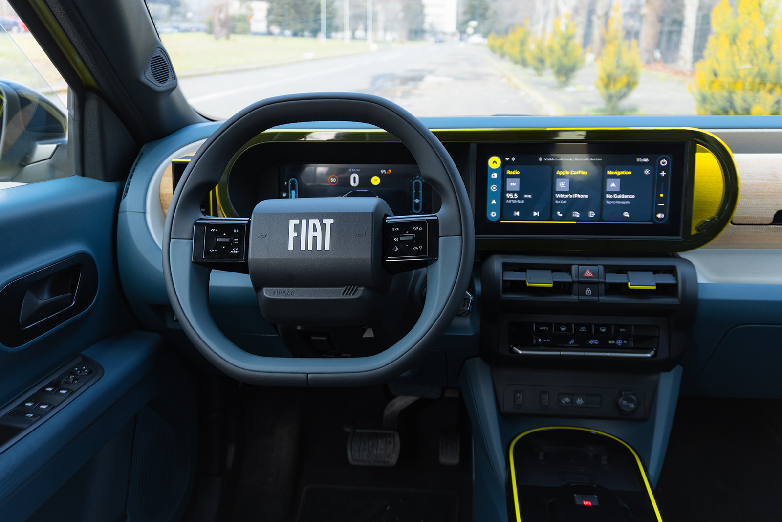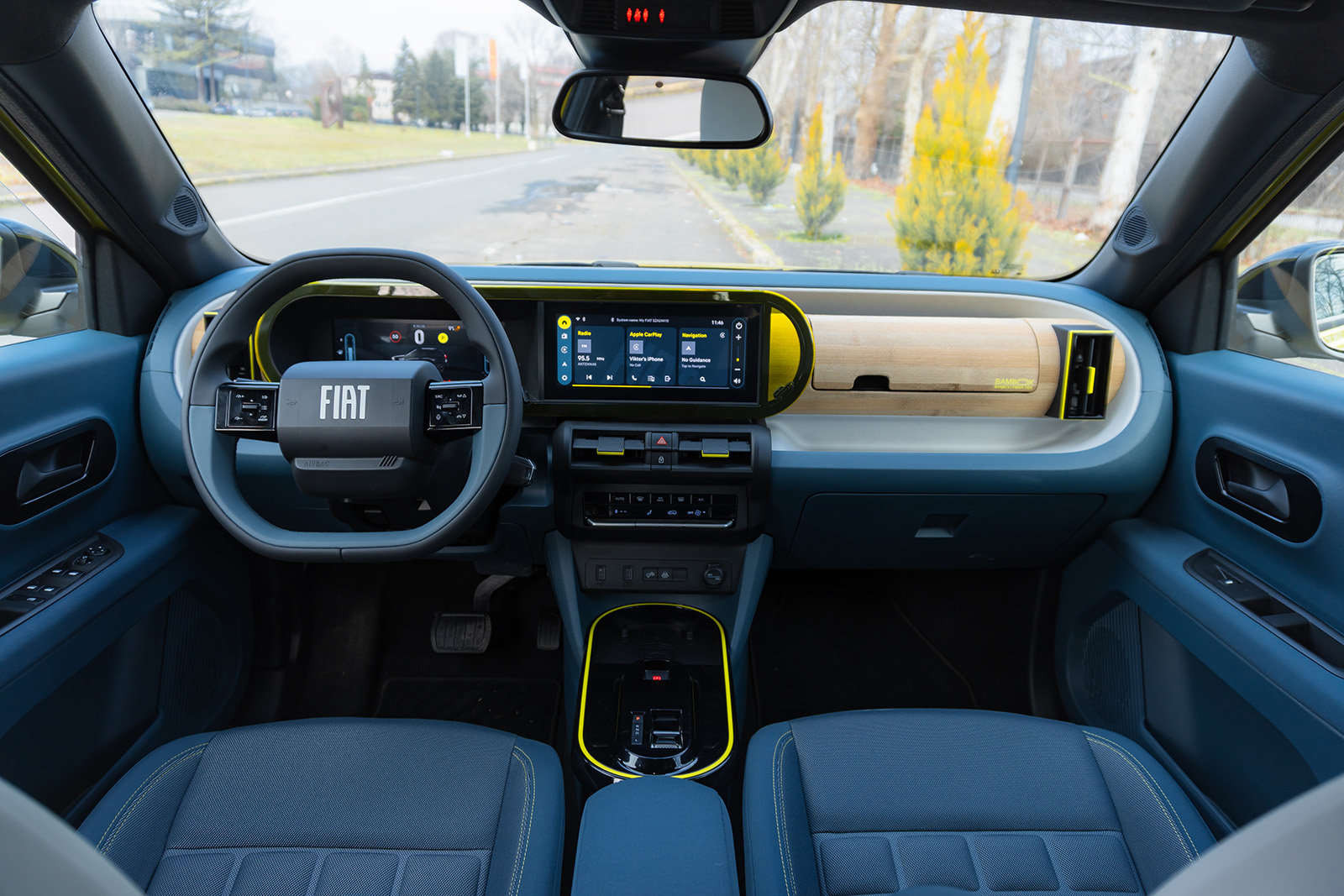 Интересниот и воедно модерен дизајн продолжува и во кабината. Имагинативните и вкусни детали – во зависност од верзијата – се присутни насекаде, со жолта боја на шевовите на инструмент таблата и отворите за воздух. Но, бојата што доминира на повеќето површини е друга. Станува збор за „Blu Tasmania“, дискретна нијанса на сина боја што го покрива поголемиот дел од инструмент таблата, тапацирот на седиштата, воланот и вратите, создавајќи хармонија на бои што ги надминува стандардите на категоријата. Италијанците беа и остануваат мајстори на овој вид детали.