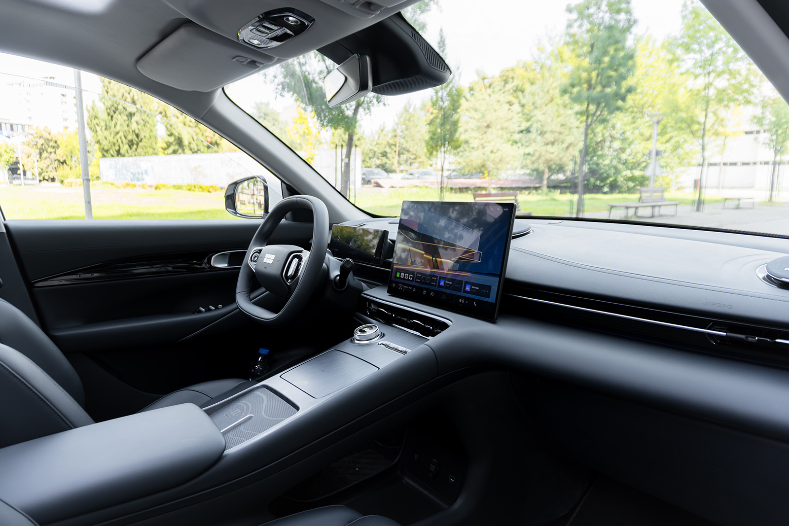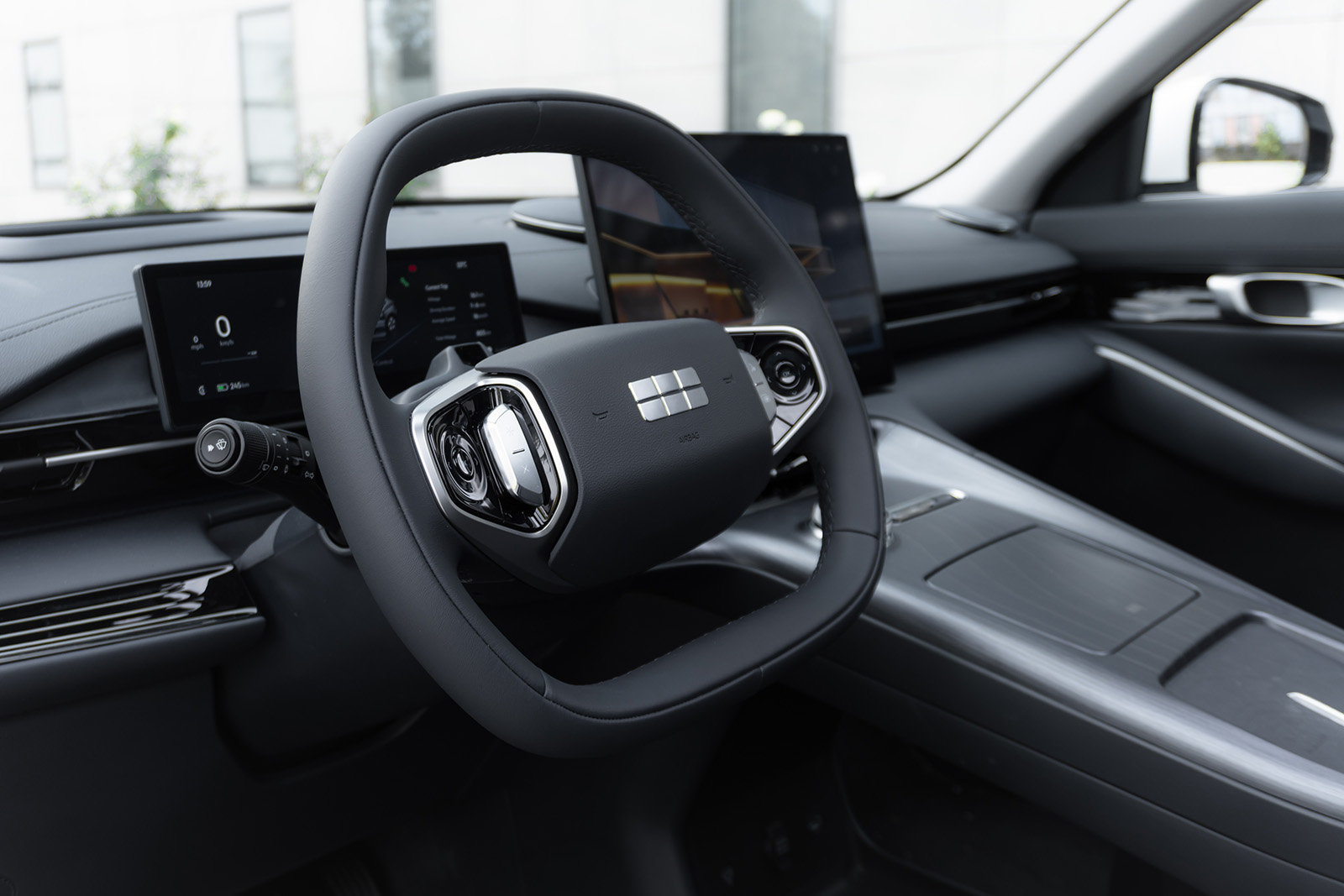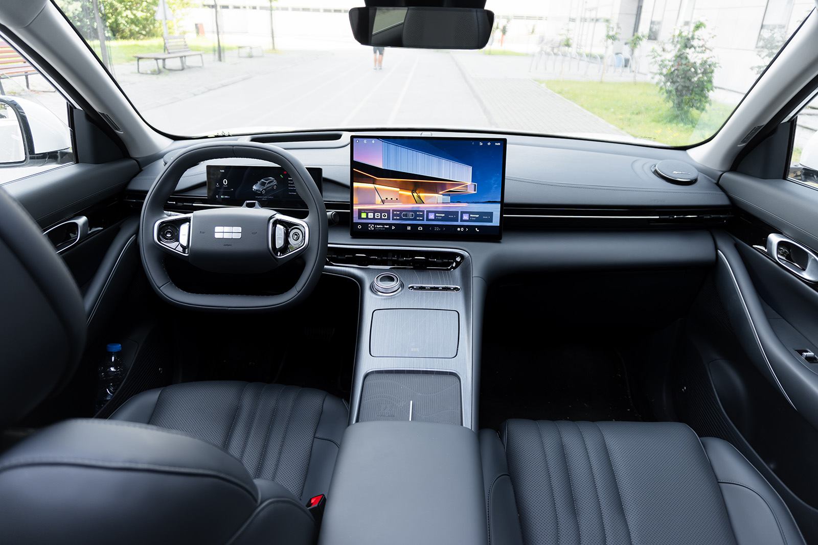 Тестираниот модел е со црна внатрешност, но како опција достапна е и светла внатрешност. Сликата во кабината е засилена со мат никел украсите на воланот, на вратите, на лентата што се протега по предниот дел од контролната табла… Кожниот тапацир не е направен од… кожа, туку од одржлив материјал што Geely го нарекува GeeLuxe – но сепак резултатот останува импресивен.
