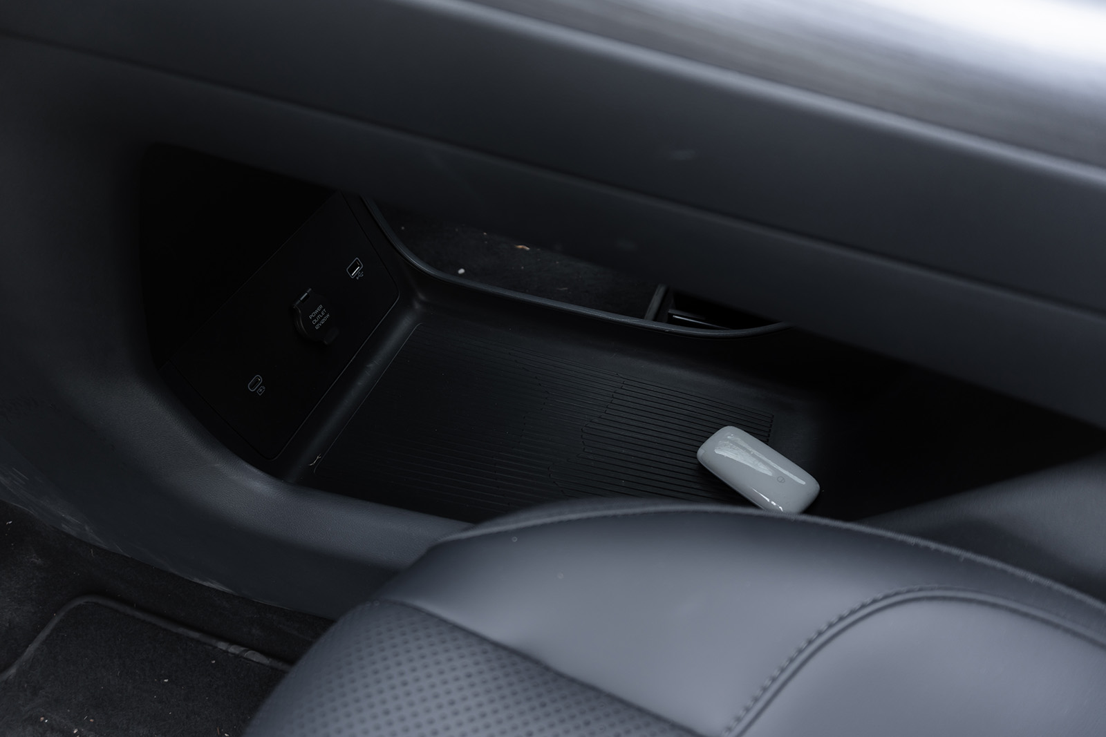 Ротационата контрола на лебдечката централна конзола овозможува практично прилагодување на поставките. Под тоа, има голем простор, со тврда пластика што не е лесно достапна, кој исто така содржи 12-волтен приклучок и два порти: еден USB-C и еден USB-A. Што се однесува до остатокот од ергономијата, не ми се допаднаа некои од контролите. Како на пример прекинувачите за климатизација. Некои од нив се или закопани во мени и подмени или се дуплирани со копчиња на допир кои ја вршат половина од работата, што го прави корисничкото искуство нефункционално. Друга забелешка што ја имам е чудно обликуваниот волан кој исто така има тактилни копчиња без ознаки, што влијае на леснотијата на користење.