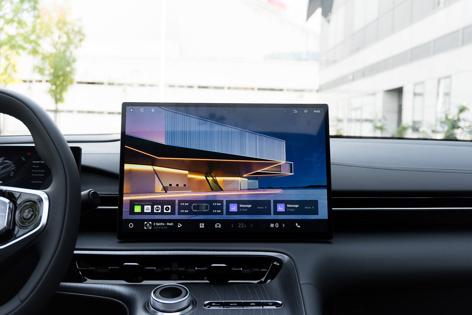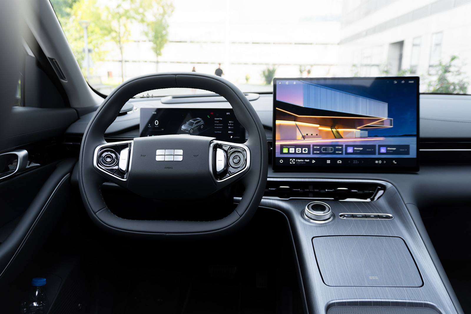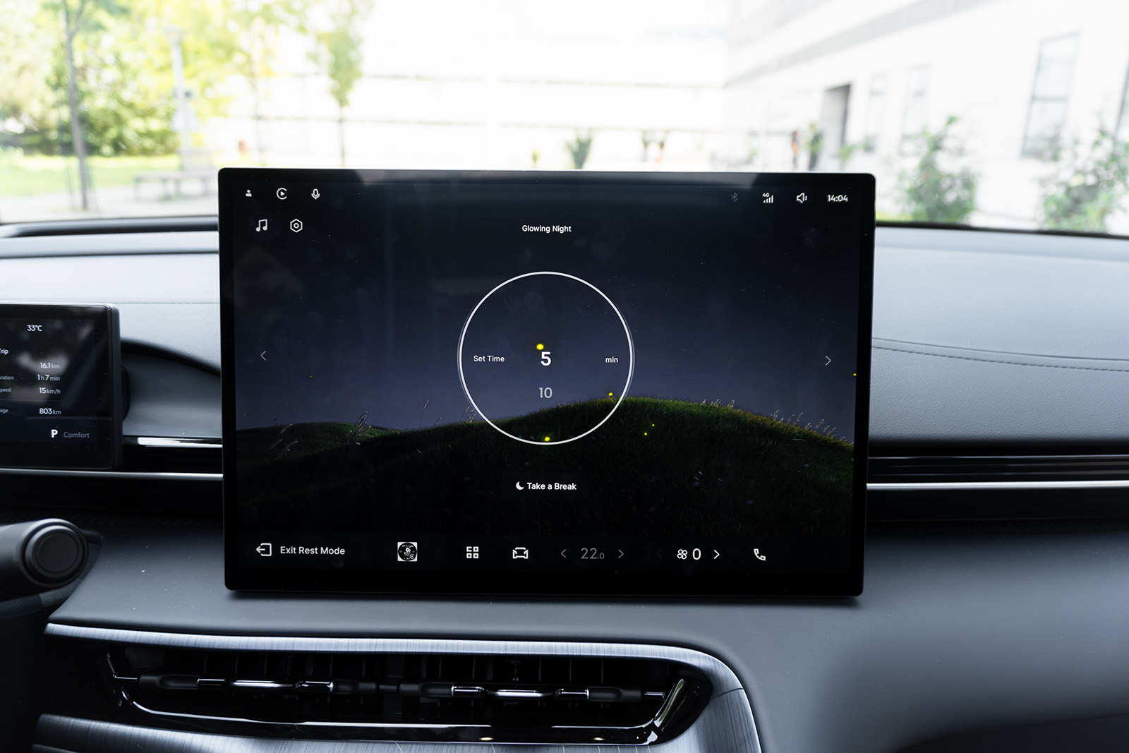 Поврзувањето вклучува 4G, гласовни команди и навигација со информации за сообраќајот во живо. Geely става голем акцент на сопствениот развиен и имплементиран инфозабавен систем, Flyme Auto, кој работи на процесор исто така од сопствен дизајн. Ова вклучува и Flyme Sound – премиум аудио систем со 16 звучници (дури и во потпирачите за глава на предните седишта), претходно поставени функции и 1.000 вати моќност. Навистина е добро, но исто така помалку импресивно отколку на хартија. Вистината е дека очекував повисок акустичен квалитет со оглед на спецификациите.