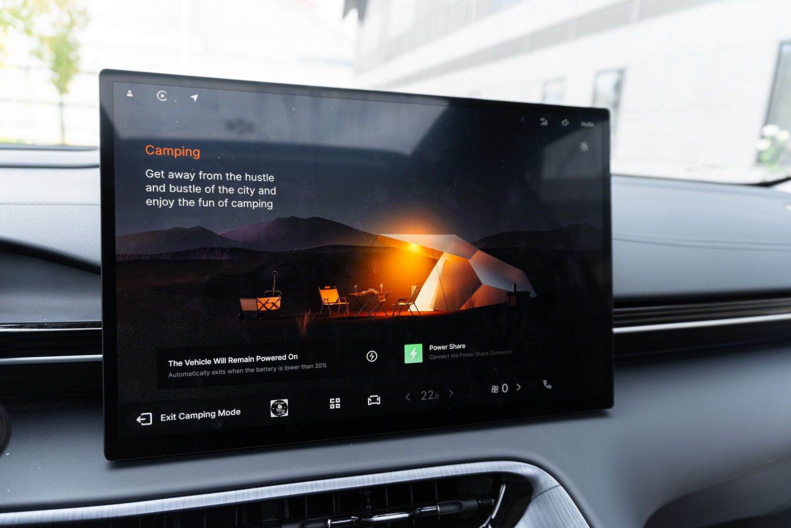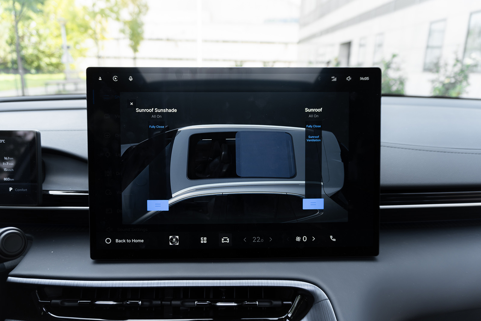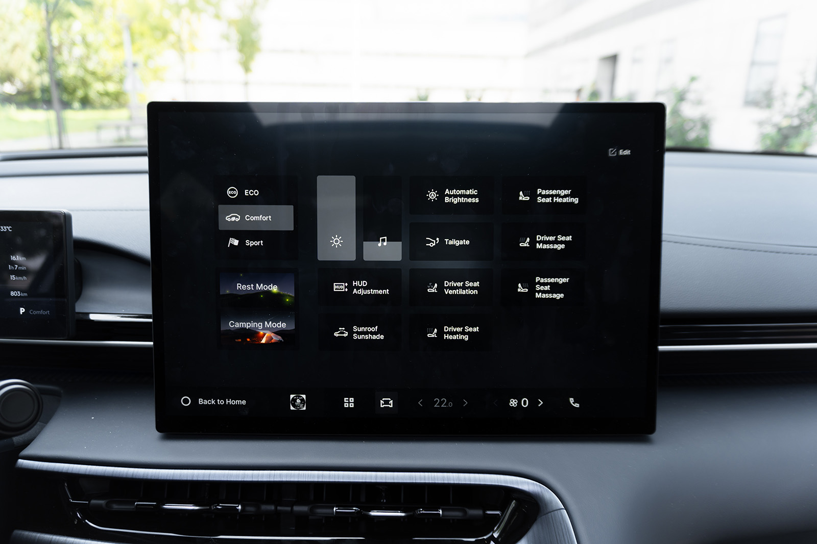 Поврзувањето вклучува 4G, гласовни команди и навигација со информации за сообраќајот во живо. Geely става голем акцент на сопствениот развиен и имплементиран инфозабавен систем, Flyme Auto, кој работи на процесор исто така од сопствен дизајн. Ова вклучува и Flyme Sound – премиум аудио систем со 16 звучници (дури и во потпирачите за глава на предните седишта), претходно поставени функции и 1.000 вати моќност. Навистина е добро, но исто така помалку импресивно отколку на хартија. Вистината е дека очекував повисок акустичен квалитет со оглед на спецификациите.