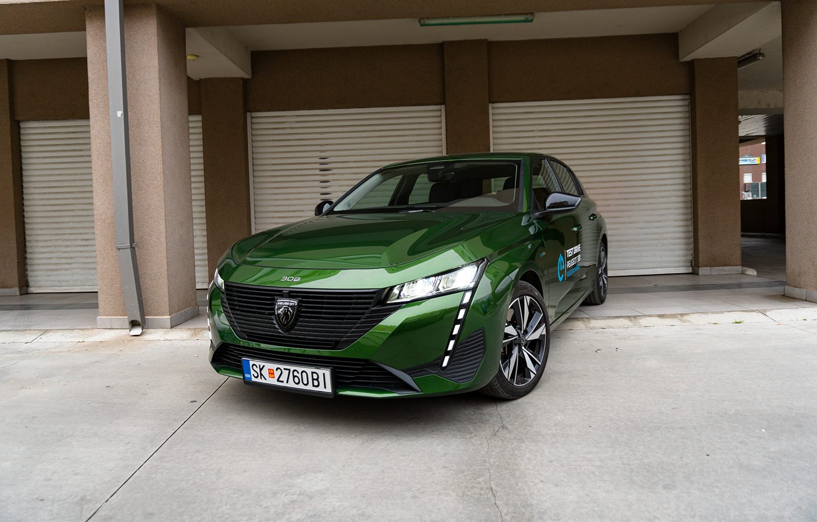 Имајќи веќе постигнато дизајнерски успех со новиот 208, Peugeot ги зачекори стилските стандарди на своето супермини и дополнително го разви својот дизајнерски јазик во целосно новиот 308. Уште првиот пат кога го видов во живо, реков дека ова е еден од најубавите и најтрактивните модели во својата класа и сега можам повторно да го кажам истото. Автомобилот е објективно навистина убав и импресивен, од било кој агол да го погледнете. Особено во оваа „Olivine Green“ металик боја која дополнително го зајакнува оној „wow ефект“. И воедно, оваа боја е стандардна за 308 и е без доплата – одличен потег од Peugeot, браво! На предниот дел, се издвојуваат долгата хауба, големата решетка и препознатливите LED фарови кои се во форма на лавовски заби. Конкретно тестираниот модел ги има стандардните фарови, додека Matrix LED фаровите се резервирани за врвното GT ниво на опременост. Задниот дел е исто толку атрактивен и динамичен, како и доста широк. Ми се допаѓа тоа што кај оваа верзија браникот е со „обична“ мат црна пластика, а не во сјајно црна боја како кај GT верзијата. Задните светла и тука се со LED технологија, но ја немаат онаа интересна графика која е во форма на лавовски канџи што се добива доколку автомобилот е опремен со надградените Matrix светла. Профилот јасно го покажува динамичниот стил и нискиот став кој го има автомобилот. Стандардните алуминиумски бандажи во ова ниво на опременост се со големина од 17-инчи, а според мене се идеалната големина во однос на комфор и изглед.