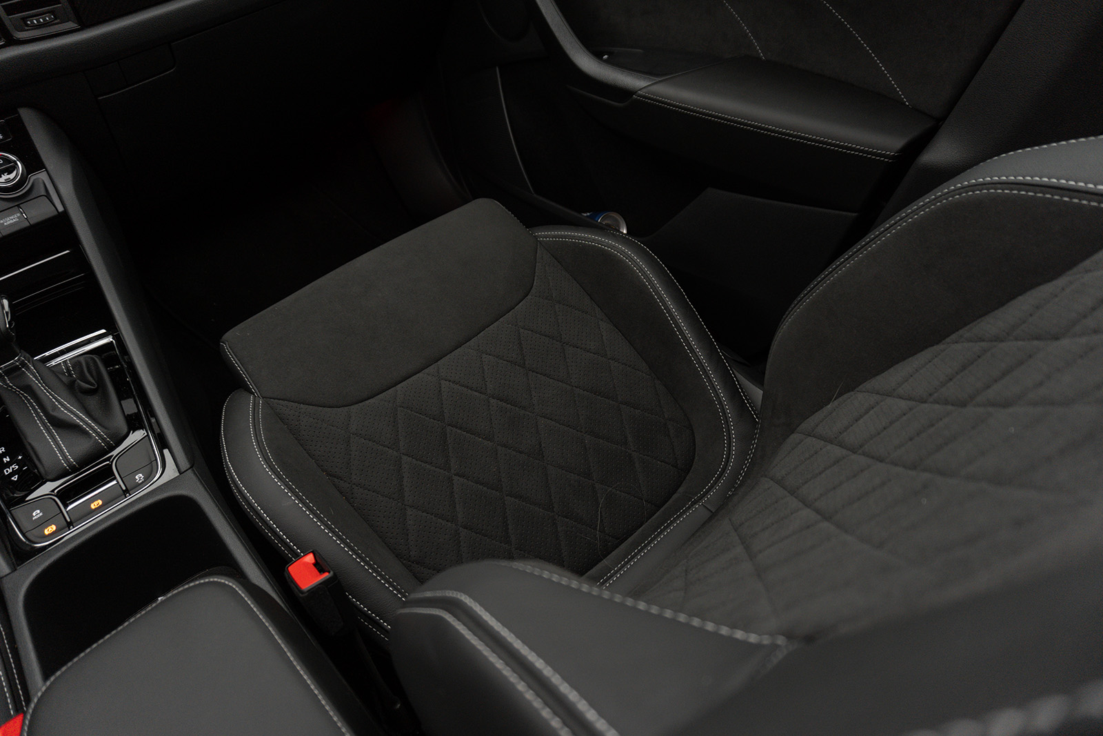 Покрај тоа, квалитетот во внатрешноста е на доста високо ниво. Контролната табла е обложена со кожа и завршена со украсни бели шевови, облога од кожа и алкантара може да се најде и на панелите на вратите, на потпирачот за раце, па дури и на потпирачите за раце во задниот дел. Исто така, повеќето елементи се изработени од меки и многу квалитетни материјали. Ова е навистина многу убав и атрактивен ентериер, а пред се и многу практичен, во кој сите елементи работат заедно. Овде навистина нема за што да се пожалите. Ептен ако мора за нешто да најдам замерка, тоа би било можеби малку поголемата количина на сјајно пијано црни елементи, кои го рефлектираат сонцето и се многу подложени на ситни гребаници и прашина.
