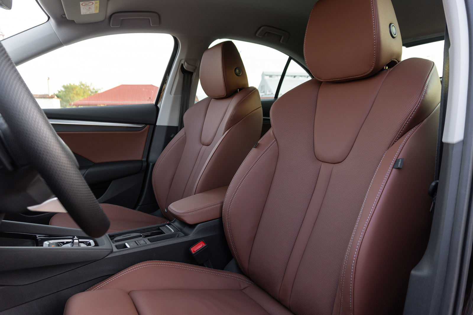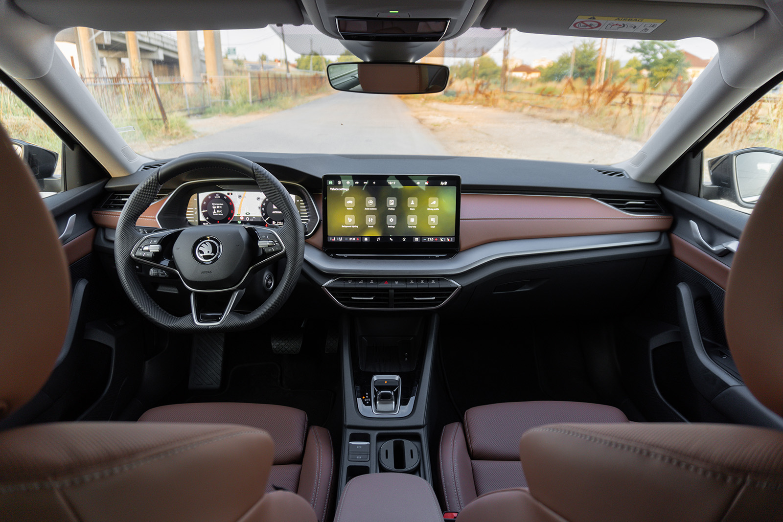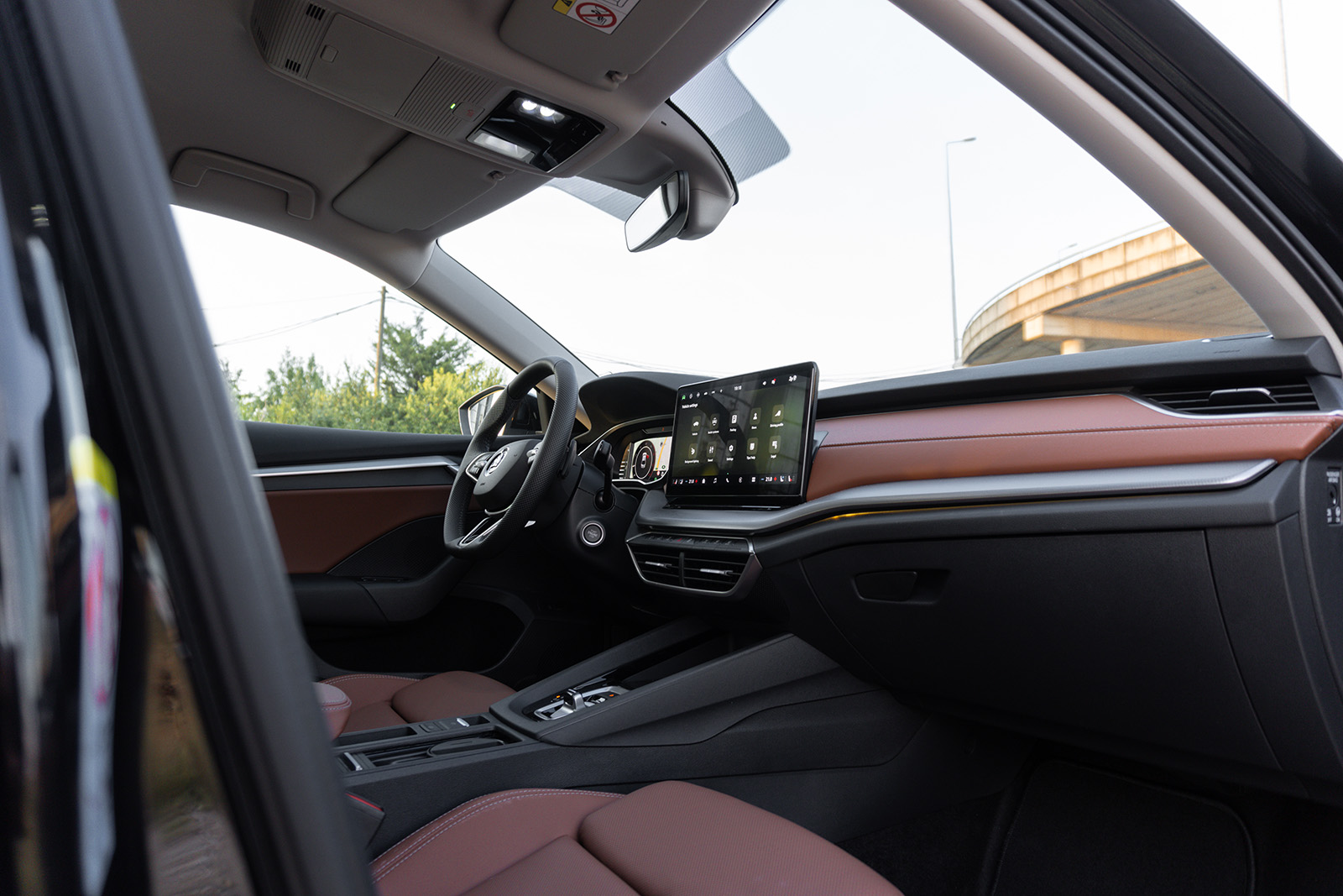 Освежената Octavia сега нуди шест различни типови на ентериер – Studio, Loft, Lodge, Lounge, Suite Black и Suite Cognac. Во основните верзии, тие се црна ткаенина, додека Lodge пакетот нуди рециклиран текстил во сива боја, следниот Lounge пакет е мешавина од алкантара и вештачка еко-кожа, а на врвот се Suite кожните седишта кои нудат функција за вентилација, греење и масажа и дополнително се AGR сертифицирани. Тест примерокот ги има врвните седишта, освен прекрасниот дизајн, нудат и исклучителен комфор, а истовремено и одлична странична поддршка. Вентилацијата на седиштата е секогаш голем плус, особено во ситуации кога автомобилот седел подолго време на сонце и кога температурите се скоро 40 степени.