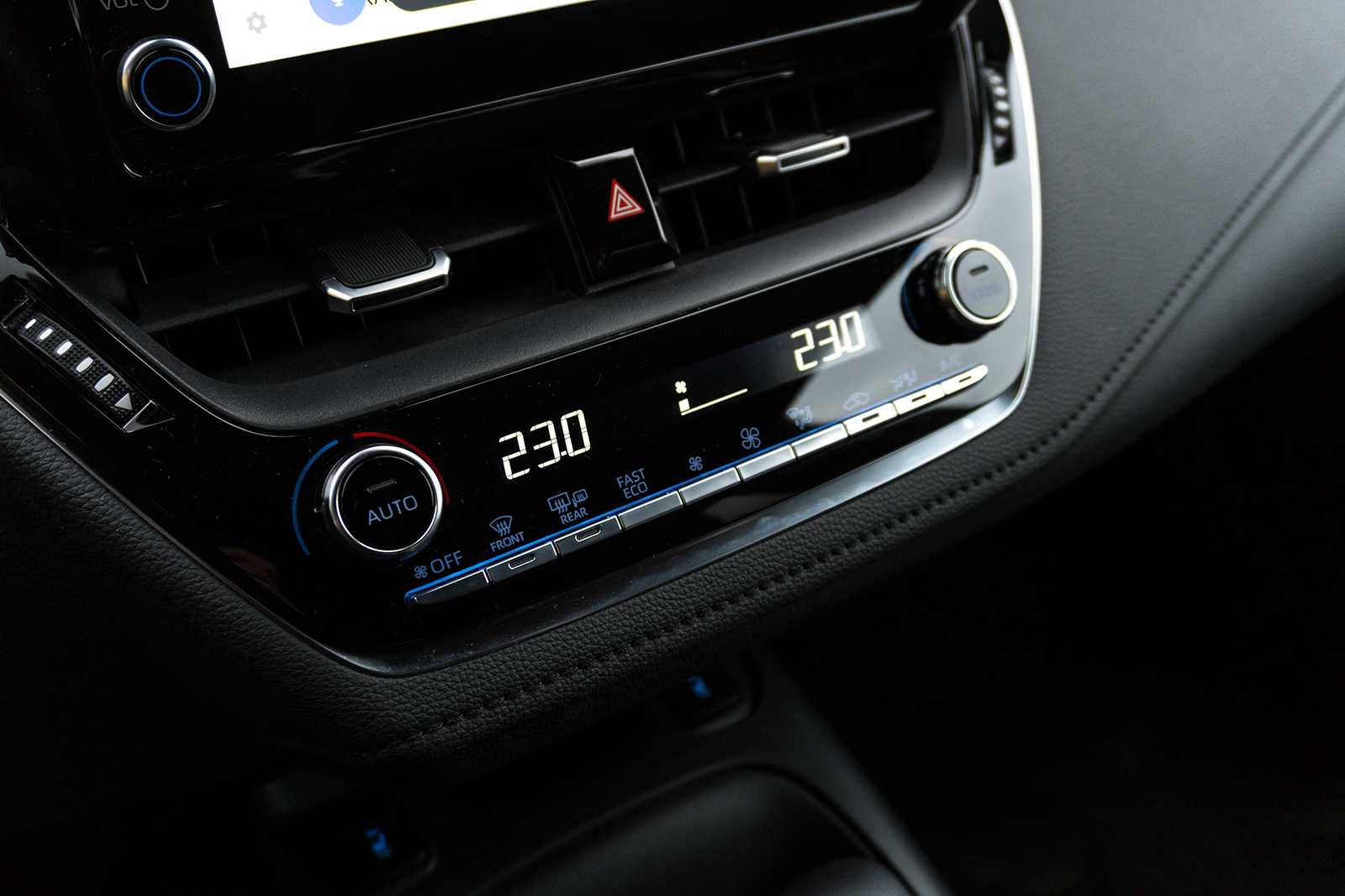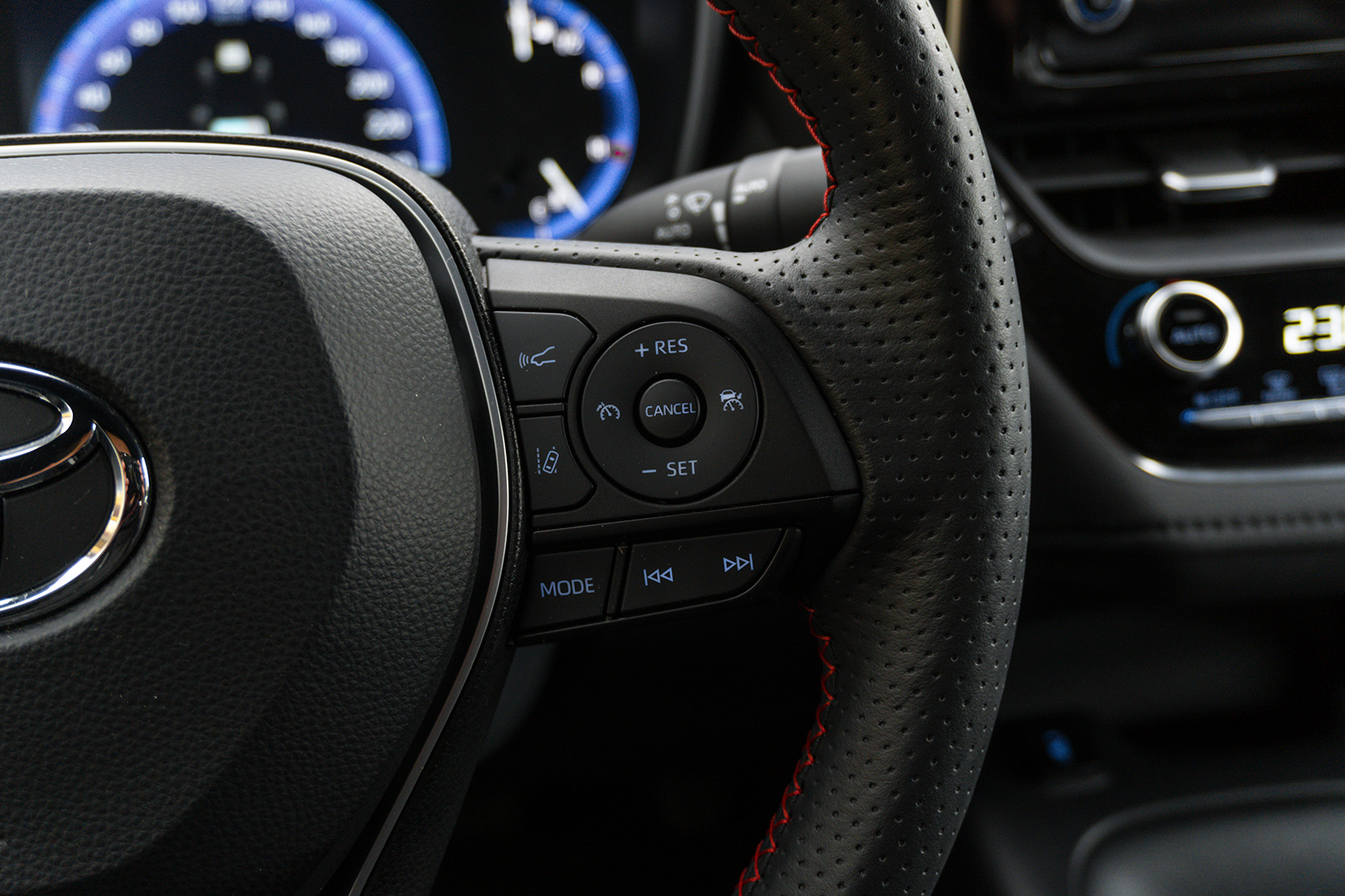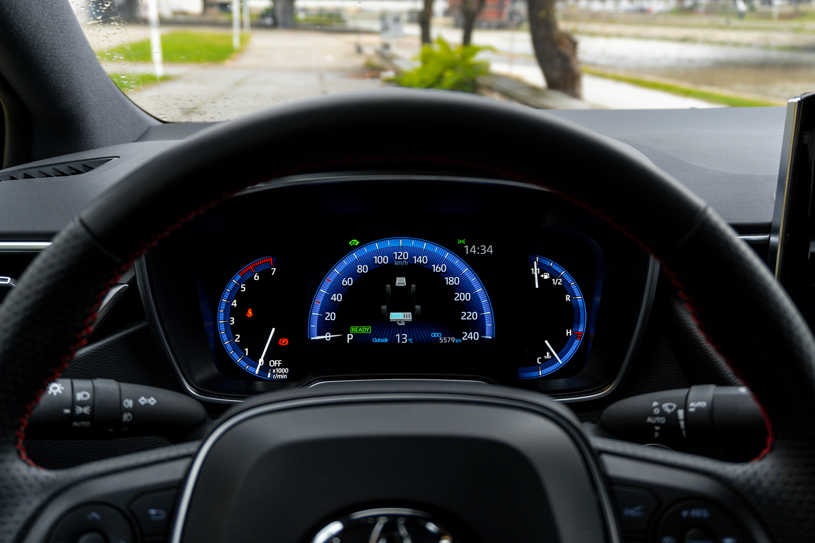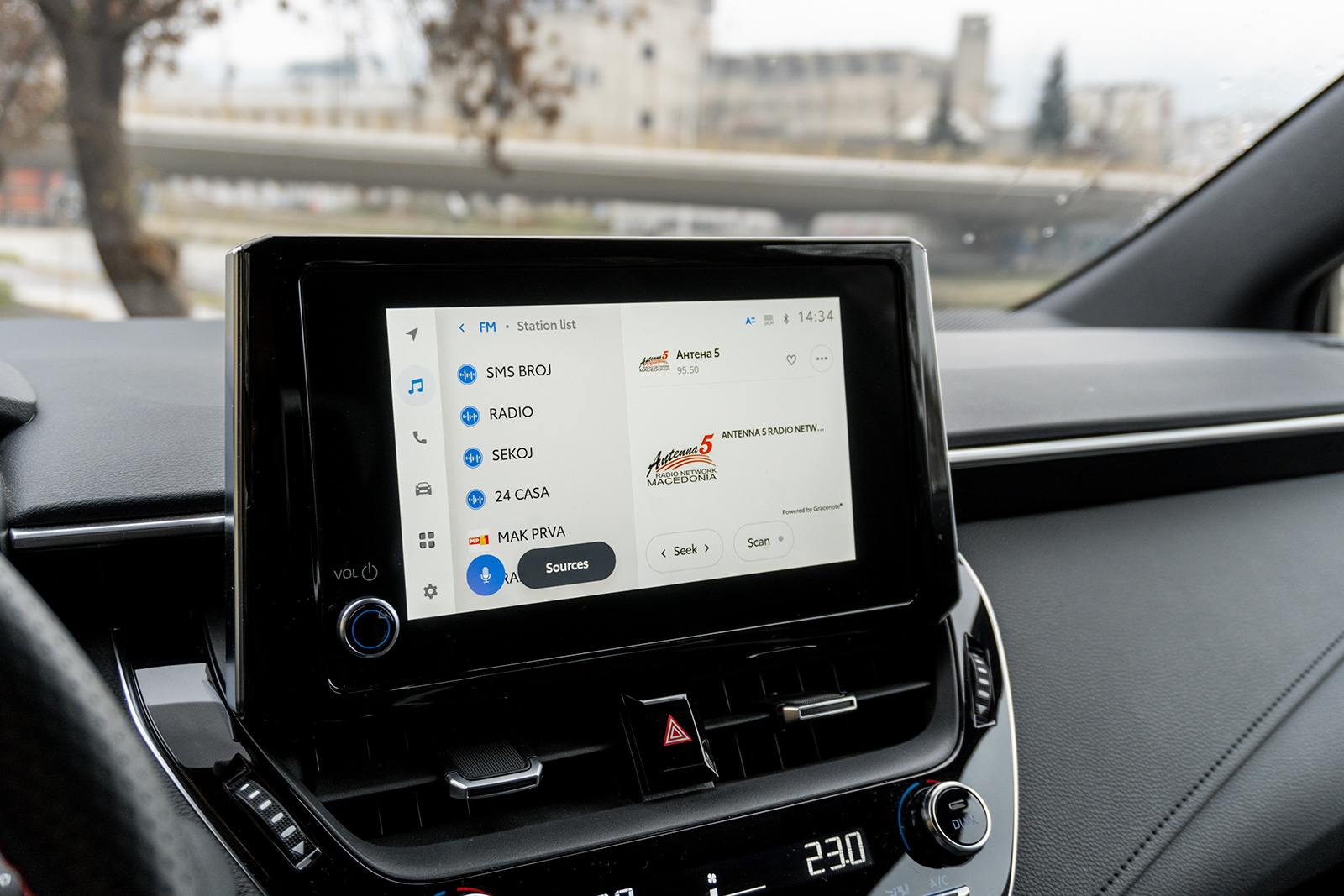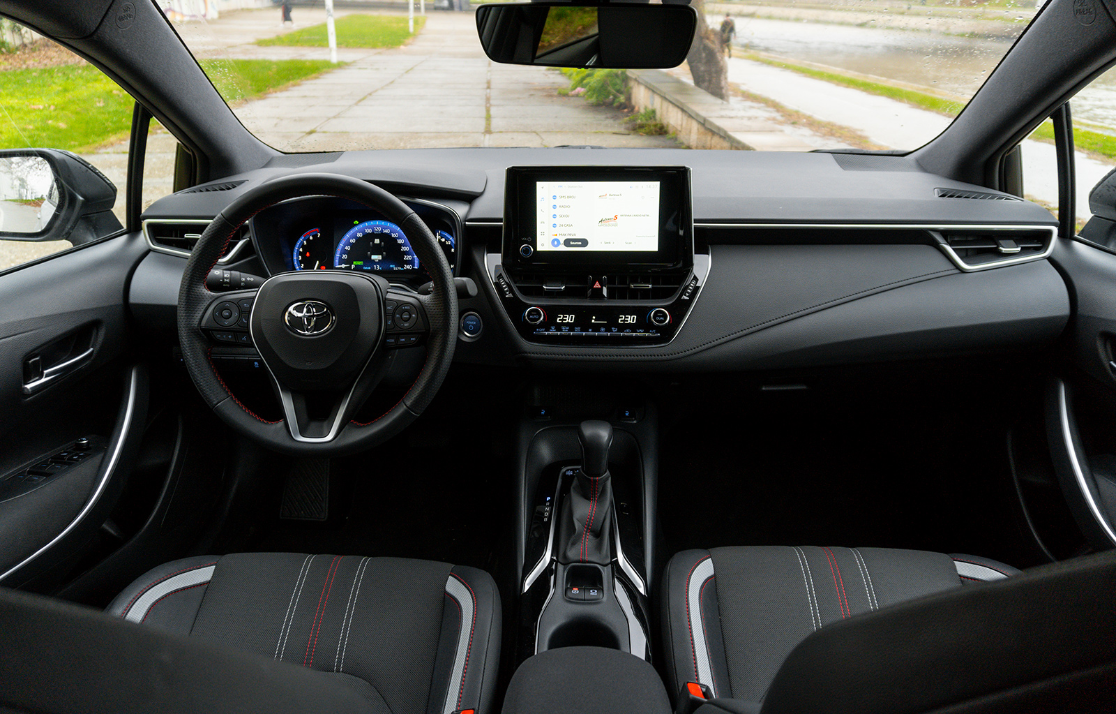 Пред возачот се наоѓа инструмент табла која е во комбинација со класични аналогни инструменти и 7-инчен централно поставен екран на кој се прикажува брзината и други важни информации околу возењето. Од левата страна е тахометар, а од десната страна се поставени мерачи за гориво и температура. На горниот дел од централната конзола е поставен 8-инчен екран за инфозабавниот систем кој сега е со најновиот софтвер на Toyota и кој е далеку подобар од стариот софтвер. Менито е лесно и едноставно за ракување, а целиот дизајн е доста модерен. Плус, сега има и безжично поврзување со Apple CarPlay, додека за Android Auto ќе ви биде потребен кабел. Повторно ќе ги споменам класичните физички контроли кои се поставени под екранот, а овие служат за функциите на клима уредот – едноставно и многу практично решение. Спортските детали ја прават кабината на оваа GR Sport верзија навистина убаво место за поминување на времето.