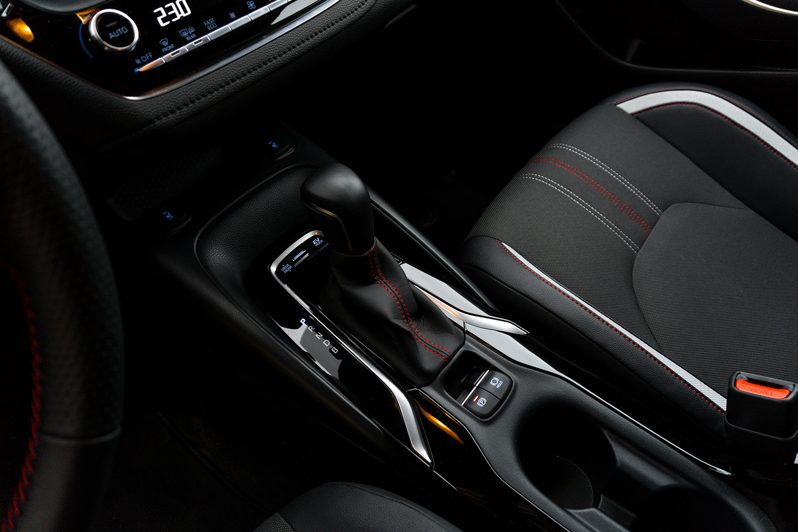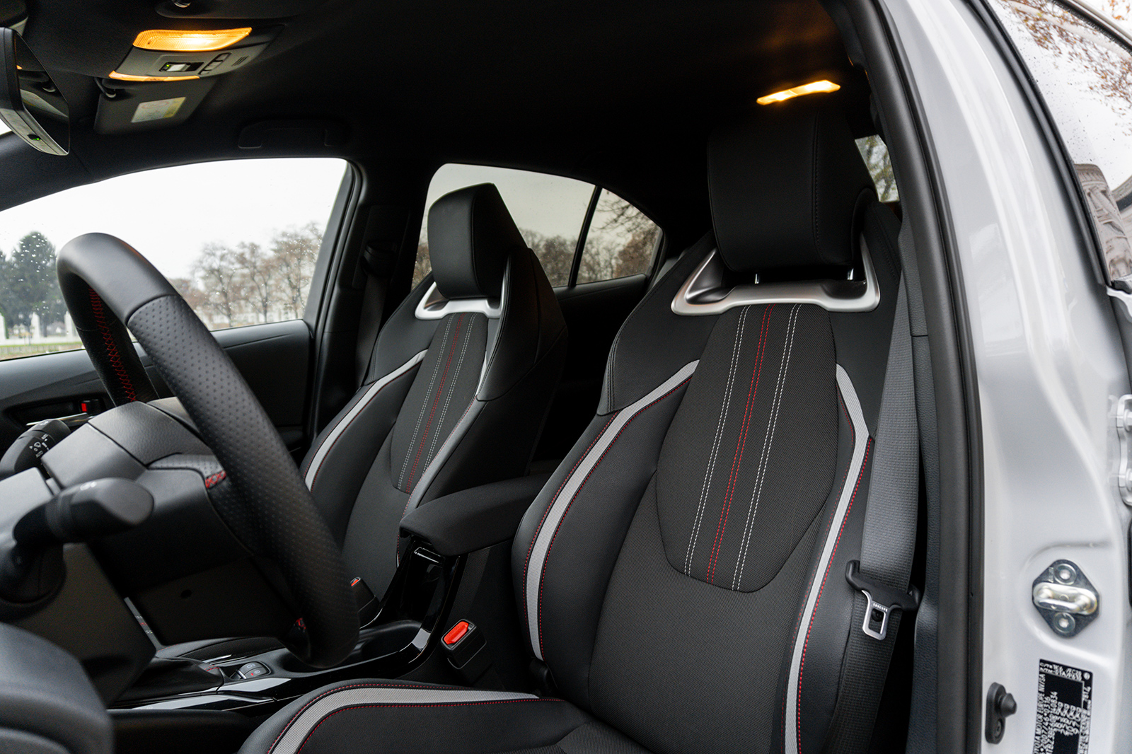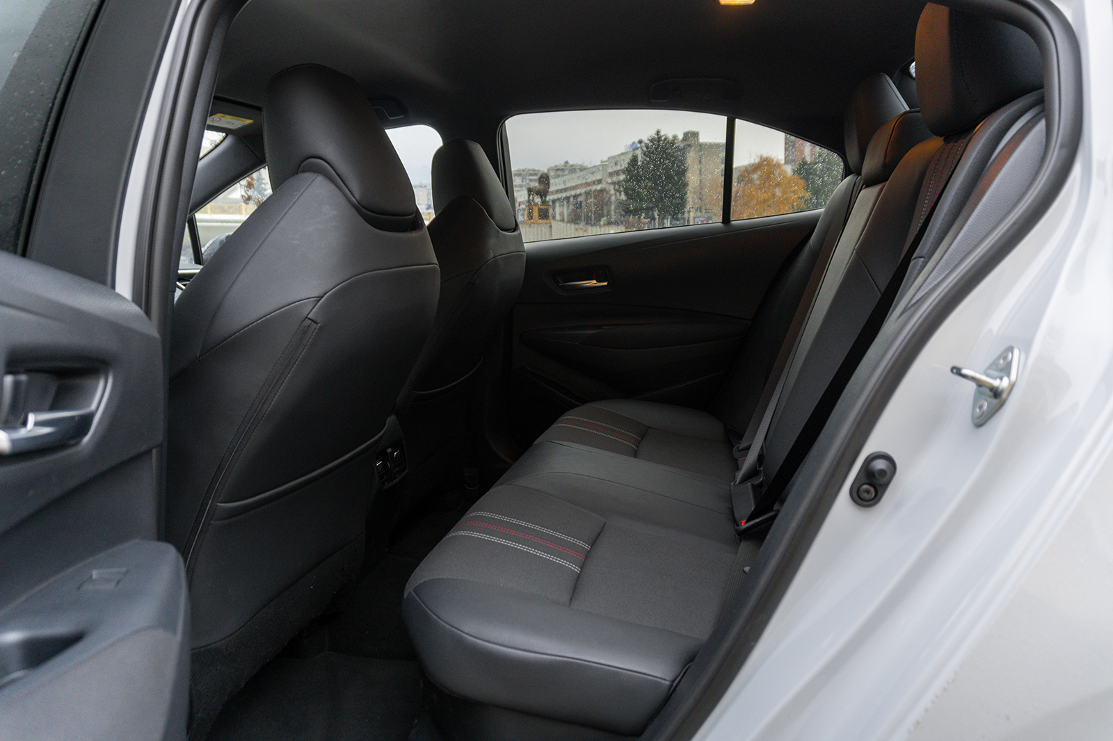 Внатрешноста и понатаму останува супер практична која е со едноставен и минималистички дизајн, а сето ова ќе го ценат оние кои не се големи фанови на најновите трендови со големи екрани во кабината. Тука се уште има класични физички копчиња скоро за сите функции на автомобилот – и сето тоа резултира со многу добра ергономија и лесно ракување. Конкретно GR Sport верзијата добива и низа измени во целата внатрешност за да се добие тоа спортско чувство зад воланот. Најважната промена се прекрасните спортски седишта кои се со детали во боите на Gazoo Racing, а освен што изгледаат убаво, нудат одлична странична поддршка и „ве гушкаат“ во свиоци. Исто така, тие се и доста удобни и за подолги патување. Дополнително, низ целата кабина може да се забележат црвени шевови, а тука е и спортскиот волан кој е делумно обложен во перфорирана кожа и секако црвени шевови. Квалитетот на поставените материјали е добар, но искрено би сакал на одредени места да има за нијанси помеки материјали. Инаку, завршната обработка е на доста солидно ниво и се е склопено како што треба.