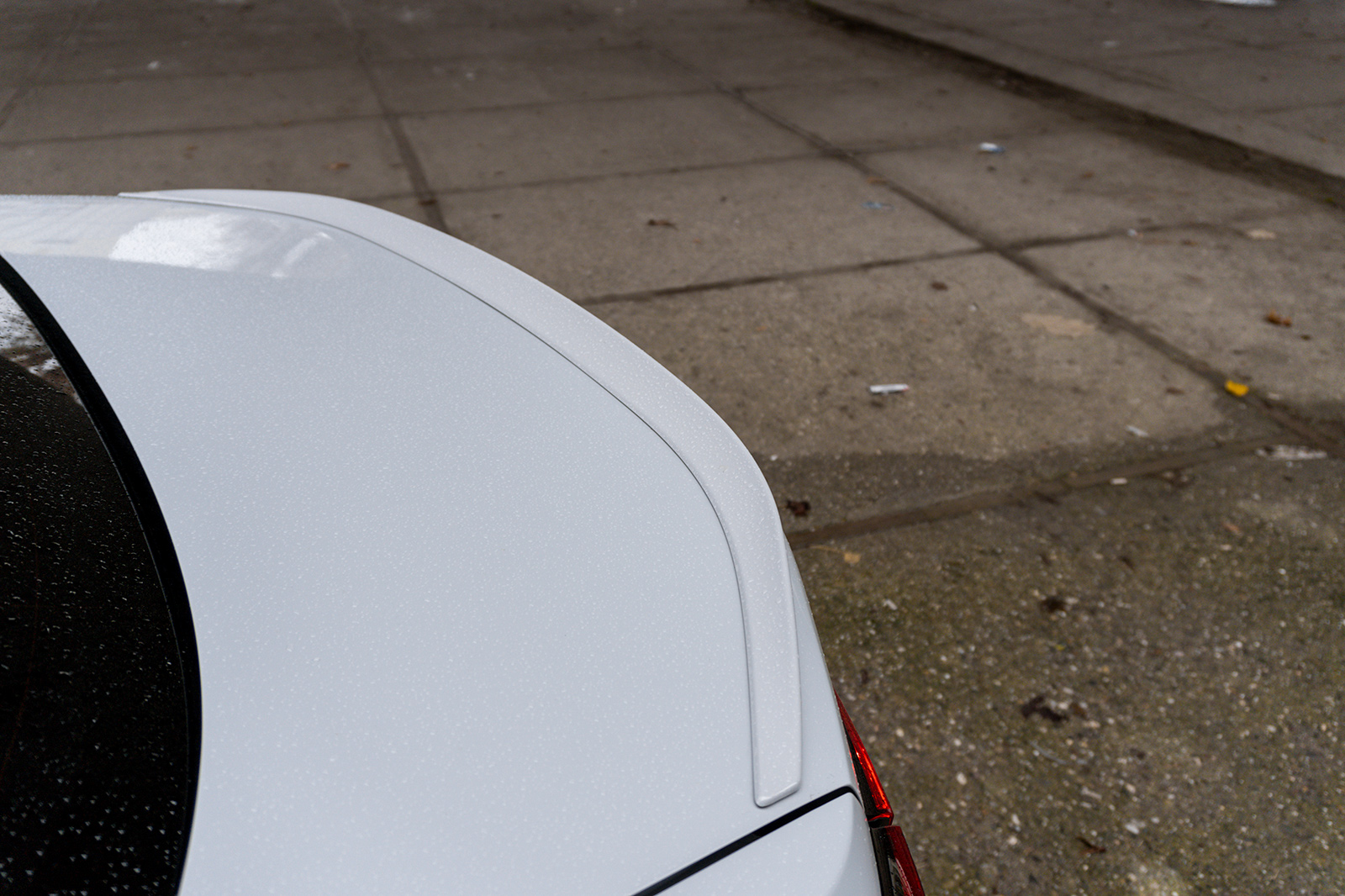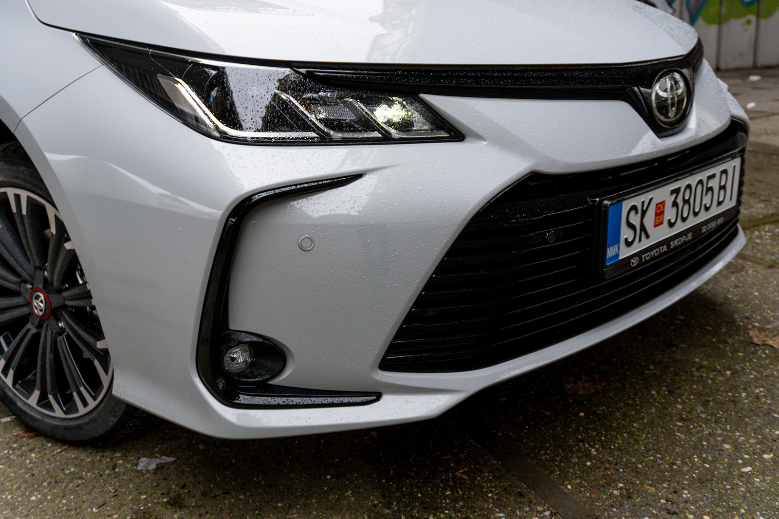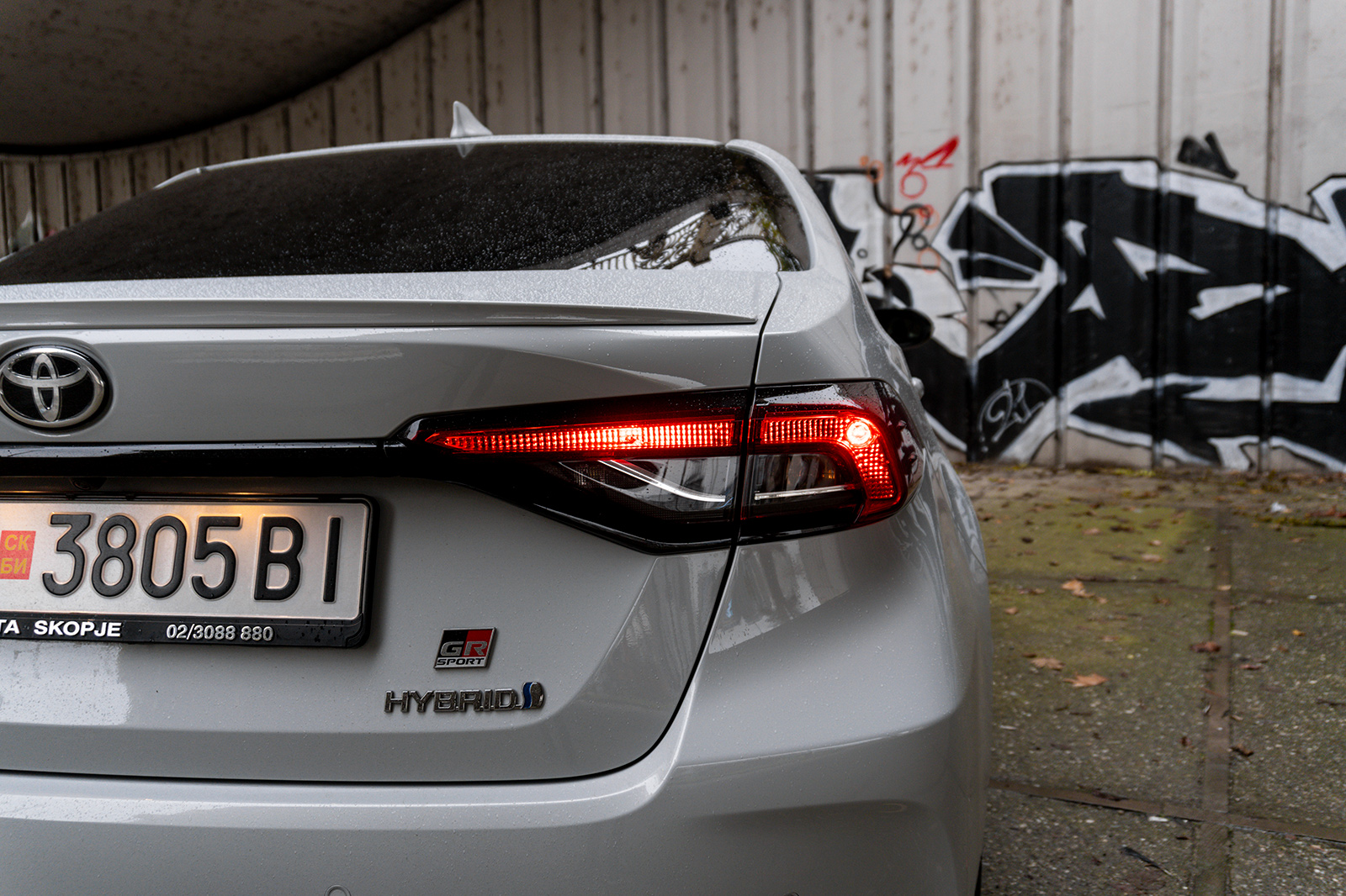 Ова не е прв пат да поминам некое време со Corolla Sedan, пред нешто повеќе од една година на тест имав примерок во највисокото ниво на опременост и придвижуван од истиот 1.8-литарски хибриден погон кој се наоѓа и во оваа Corolla GR Sport, но за тоа ќе зборуваме малку подоцна. Визуелно, од надвор оваа GR Sport верзија добива низа измени кои допринесуваат да се добие тој поспортски и динамичен изглед кој ќе направи автомобилот да се разликува од сите други „короли“ на улица. Да започнеме прво од бојата, оваа „Dynamic Grey“ боја е ексклузивно достапна само за GR Sport верзијата па уште на прв поглед може да се примети дека ова не е „обична“ Corolla. Понатаму, сите хромирани елементи кај другите верзии, тука се во сјајно црна завршница – предната маска, линијата што ги спојува фаровите, деталите околу магленките, ретровизорите, лајсните околу прозорците и лајсните на долниот дел од вратите. Дополнително, на вратата од багажникот е поставен и еден суптилен спојлер кој јас лично би сакал да е во сјајно црна боја.