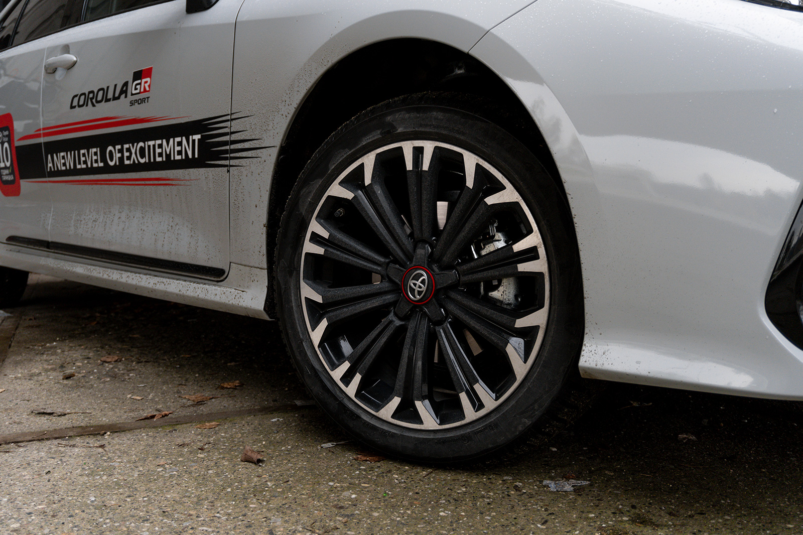 Приказната продолжува и со бандажите кои се ексклузивно достапни за GR Sport верзијата, конкретно тест моделот е со 17-инчни бандажи кои се во двобојна комбинација и интересен детал е црвениот круг во средина околу логото. Како опција, може да се земат и поголеми 18-инчни бандажи кои дополнително го збогатуваат спортскиот изглед, но го намалуваат комфорот. Исто така, на вратата од багажникот и на праговите на предните врати е поставено GR логото. Севкупно, ова не се кој знае какви драстични промени во споредба со другите верзии, но едноставно целиот автомобил остава доста поатрактивен и поубав впечаток, а ова би го ценеле помладите купувачи.