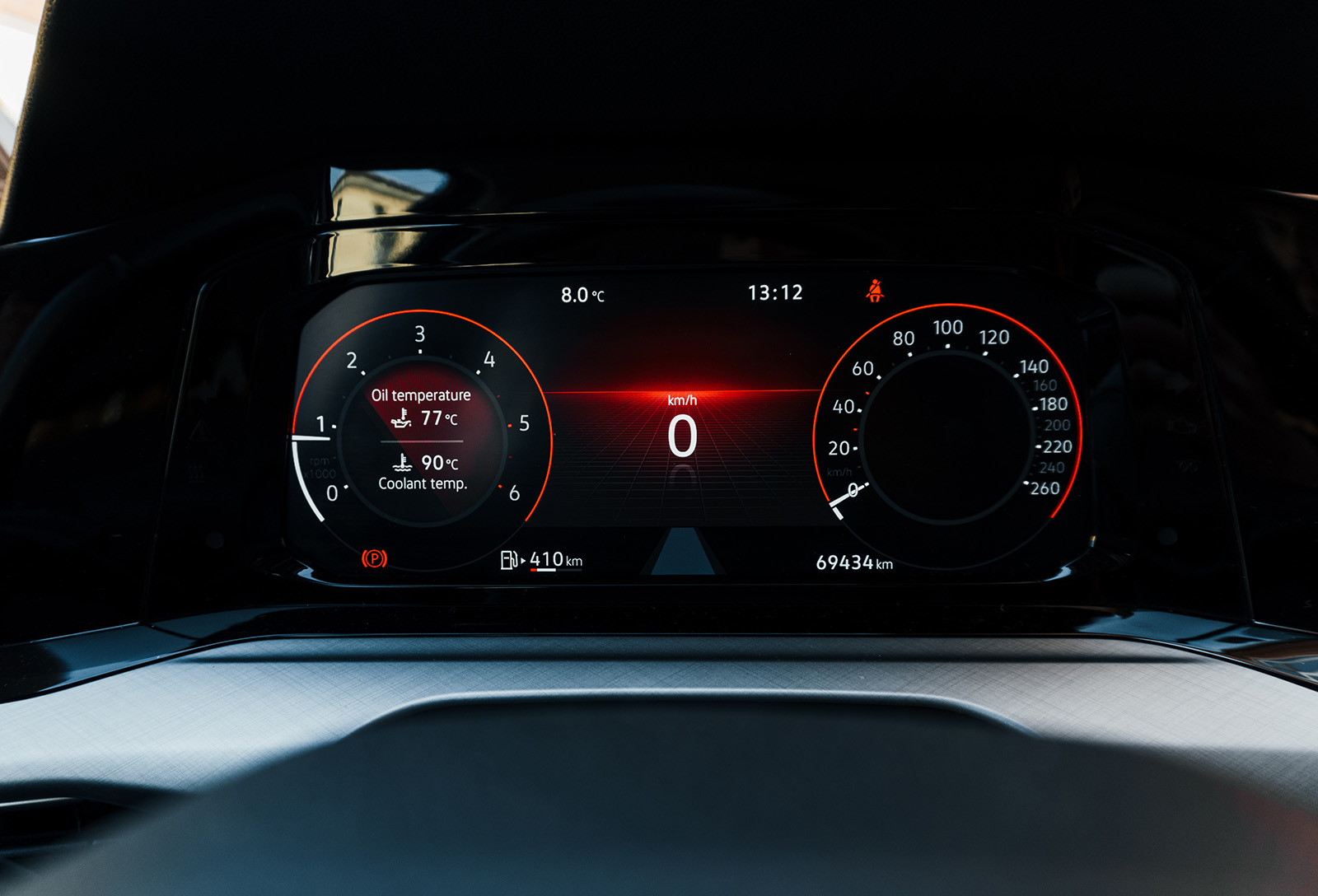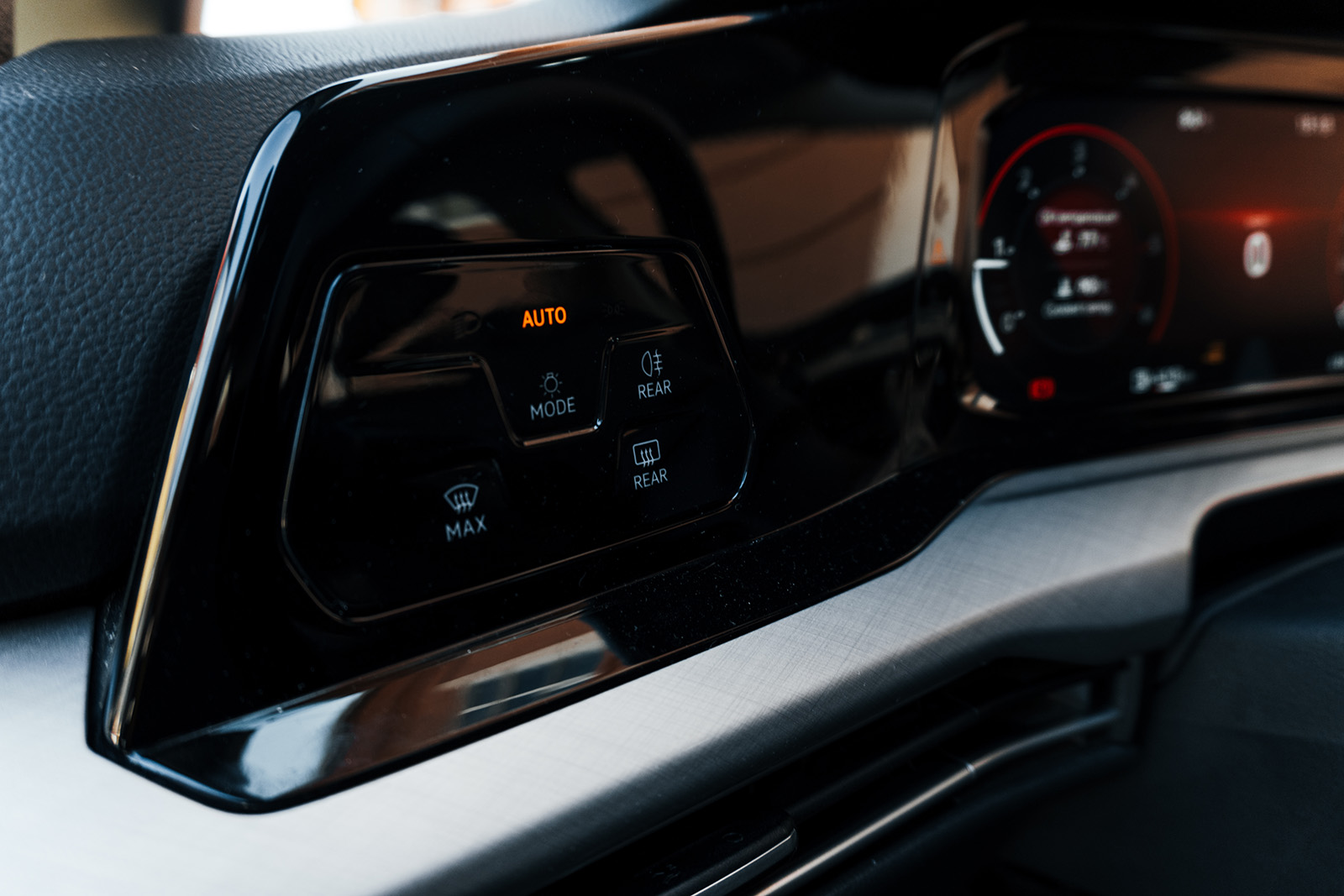 Конкретниот примерок бидејќи е во основното ниво на опременост добива 10.25-инчна дигитална инструмент табла наменета за возачот и 8.25-инчен централен екран за инфозабавниот систем. Овие два екрани се споени со рамка која е во пијано црн финиш и мене лично ова воопшто не ми се допаѓа – магнет за гребаници и прашина. Инструмент таблата нуди неколку различни прикази, а дополнително може и да ја конфигурирате по ваш избор, да го прикажува она што вие сакате. Графиката тука е одлична и јасно се прикажани сите информации. Централниот екран во конкретниот модел не нуди премногу опции и конфигурација, но доколку го земете поголемиот 10.25-инчен екран добивате многу повеќе опции за персонализација. И овој екран има одлична графика, но понекогаш знае малку да се збуни и да му треба повеќе време за да отвори одредена функција. Под централниот екран се наоѓаат четири копчиња на допир – за климата, паркинг сензорите, асистентите и во повисоките нивоа на опременост за избирање на режим на возење.