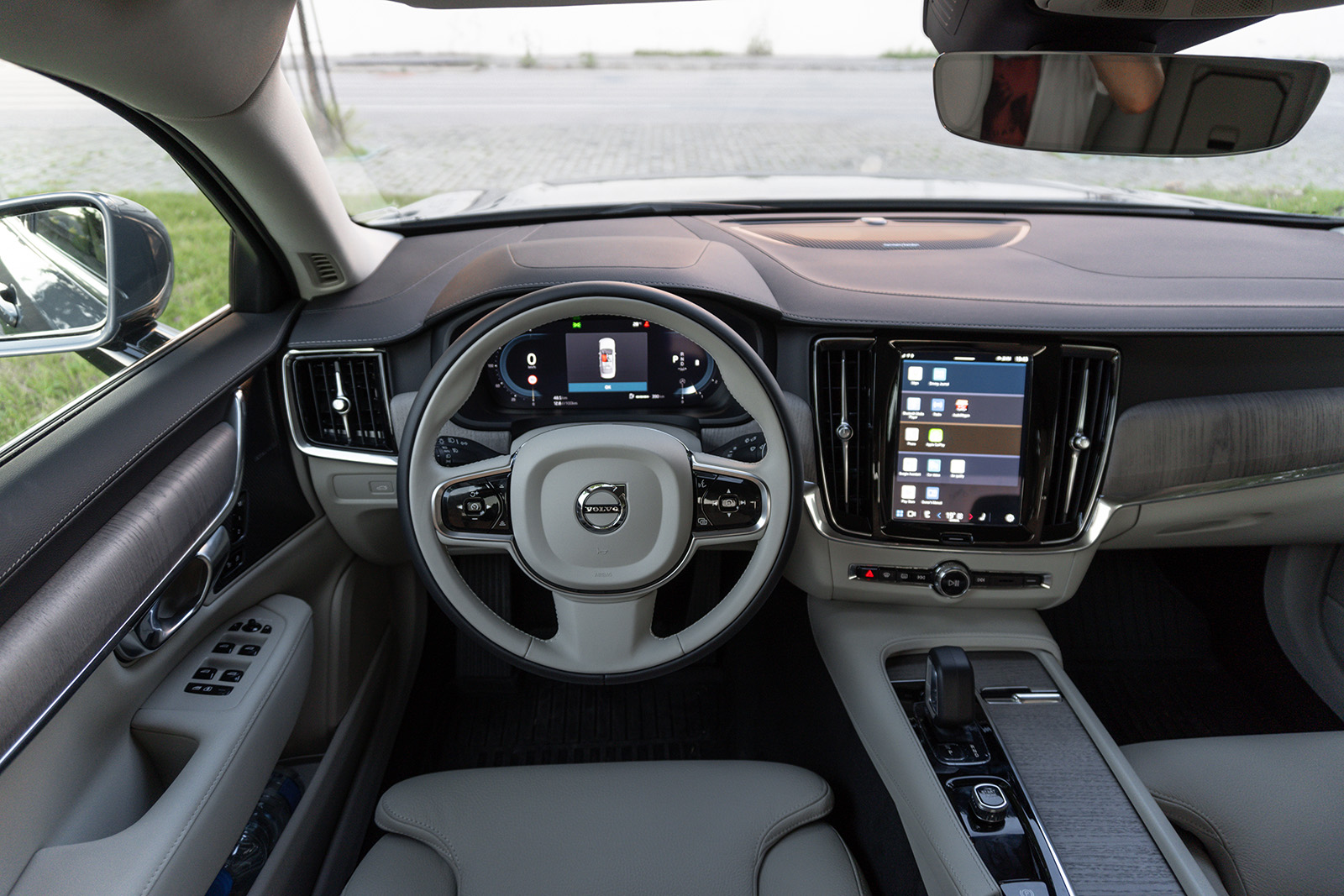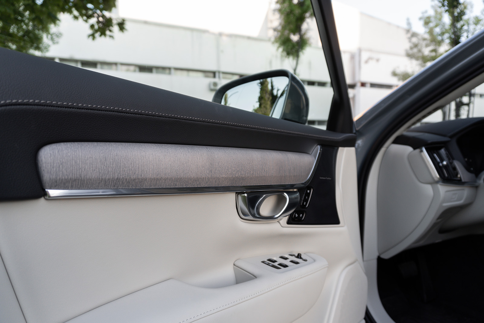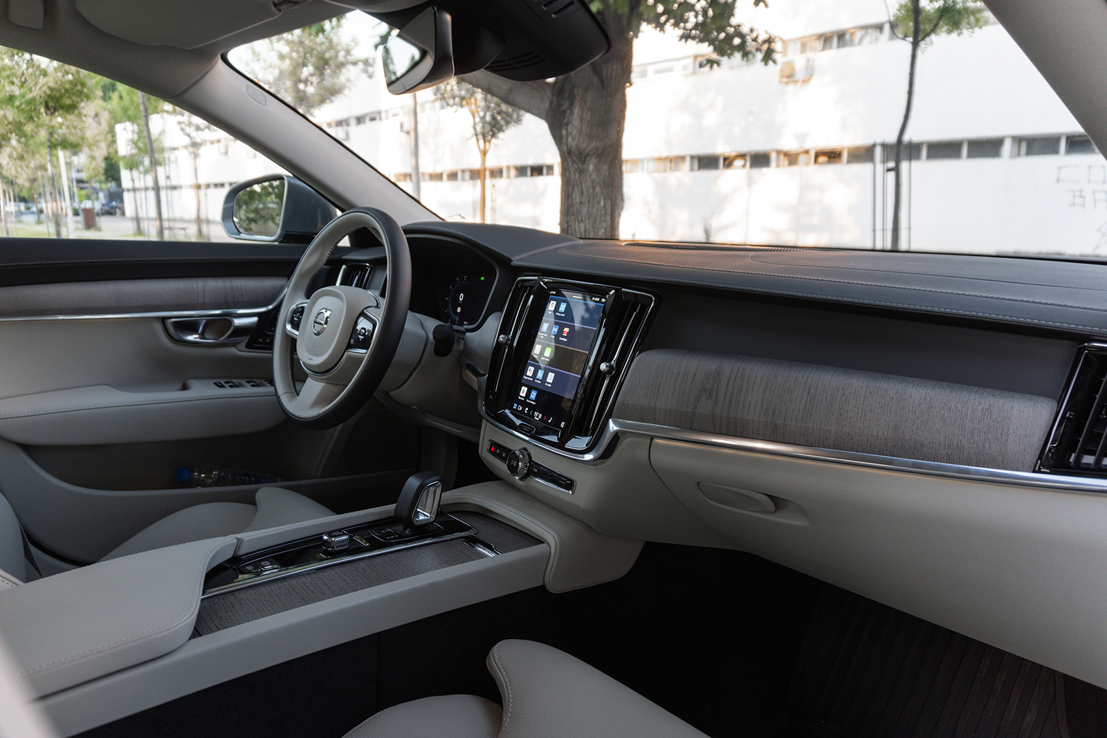 Внатрешноста на Volvo S90 е типичен шведски минимализам кој се спротивставува на текот на времето. Со освежувањето, тука нема да најдеме драстични промени, туку само неколку новости во однос на технологиите. Кабината е ергономска, елегантна и со совршена завршница, а токму тоа се бара кај премиум автомобилите. Во случајот со S90, тука нема да најдете половични мерки. Ако нешто личи на алуминиум, дрво или кожа, тоа е вистински така и ова се најквалитетните материјали. Целата контролна табла е обложена со мек материјал украсен со светли шевови. Низ ширината на пилотската кабина, панелите на вратите и централниот тунел, се наоѓаат декоративни Grey Ash елементи, кои се направени од јасен дрво. Тест примерокот има светол Blond кожен ентериер со греење на предни и задни седишта, кожен волан, менувач обложен во кожа и светол тапацир на покривот. Сето ова прави внатрешноста да се чувствува попријатно и многу поелегантно. Вреди да се погледнат елементи како што е централниот тунел, кој во горниот дел е обложен со кожа, но тапацирот на страничниот дел со мек материјал е многу убав додаток кој го докажува високиот квалитет на внатрешната завршница.