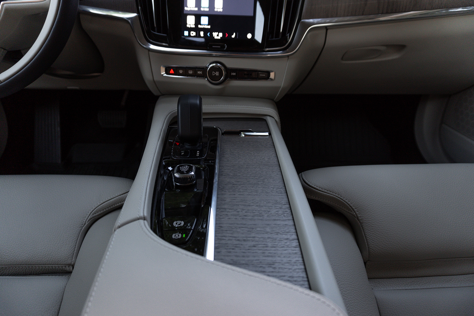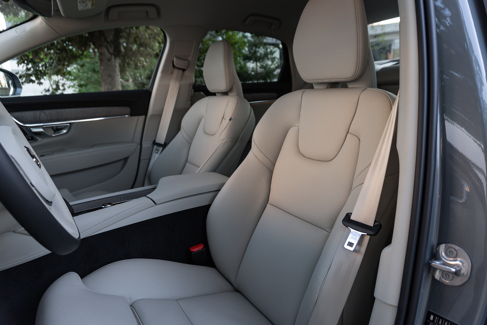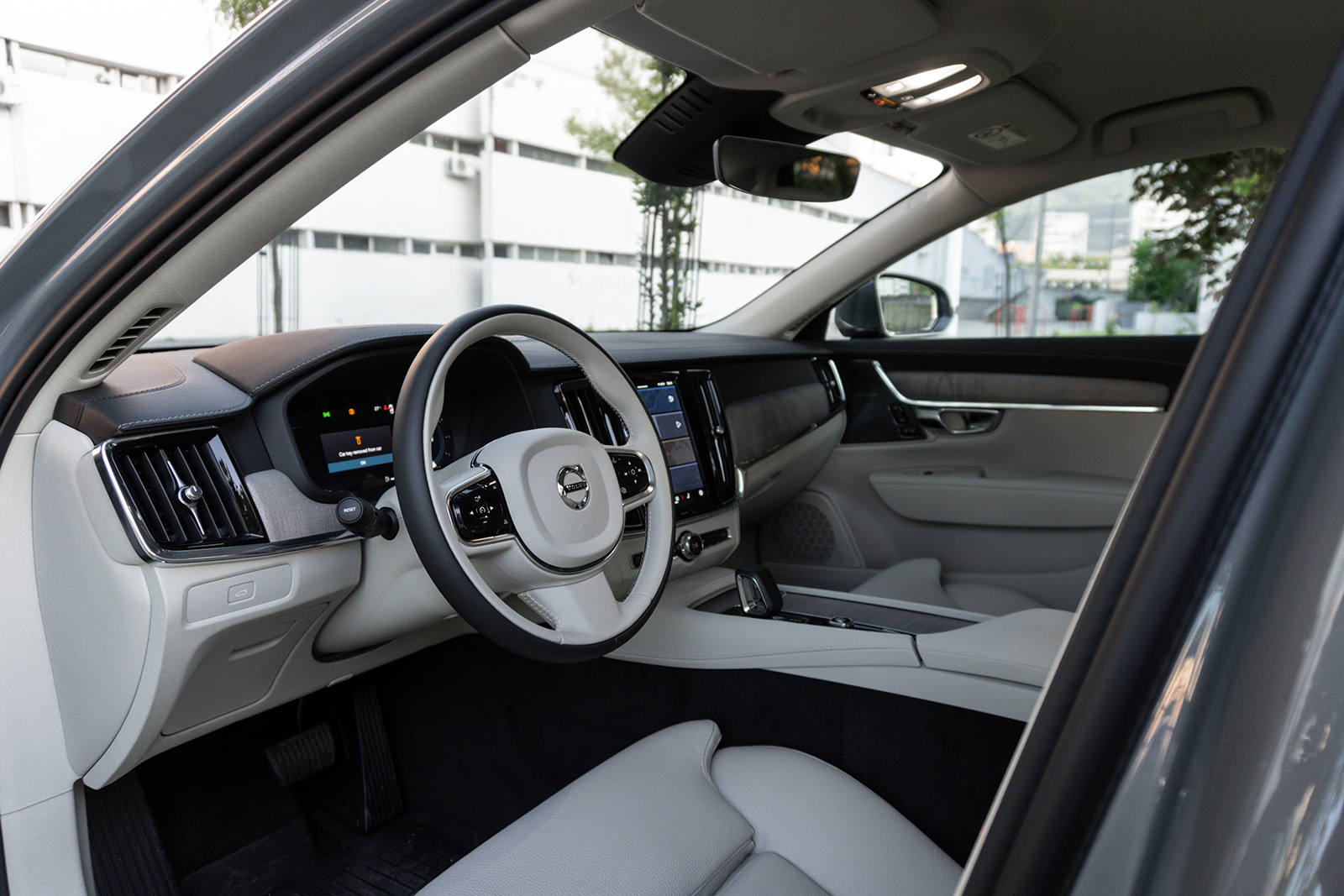 Внатрешноста на Volvo S90 е типичен шведски минимализам кој се спротивставува на текот на времето. Со освежувањето, тука нема да најдеме драстични промени, туку само неколку новости во однос на технологиите. Кабината е ергономска, елегантна и со совршена завршница, а токму тоа се бара кај премиум автомобилите. Во случајот со S90, тука нема да најдете половични мерки. Ако нешто личи на алуминиум, дрво или кожа, тоа е вистински така и ова се најквалитетните материјали. Целата контролна табла е обложена со мек материјал украсен со светли шевови. Низ ширината на пилотската кабина, панелите на вратите и централниот тунел, се наоѓаат декоративни Grey Ash елементи, кои се направени од јасен дрво. Тест примерокот има светол Blond кожен ентериер со греење на предни и задни седишта, кожен волан, менувач обложен во кожа и светол тапацир на покривот. Сето ова прави внатрешноста да се чувствува попријатно и многу поелегантно. Вреди да се погледнат елементи како што е централниот тунел, кој во горниот дел е обложен со кожа, но тапацирот на страничниот дел со мек материјал е многу убав додаток кој го докажува високиот квалитет на внатрешната завршница.
