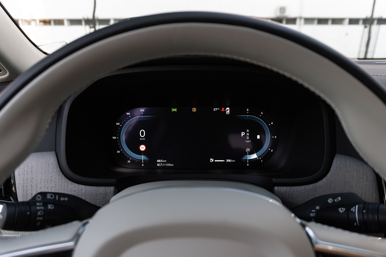 Стандардно се добива дигитална инструмент табла од 12 инчи, која има убав и јасен интерфејс. Проблемот е што неговата функционалност е многу ограничена и нема ни минимална можност да се смени конфигурацијата, па во пракса сме заглавени со еден приказ. Штета што Volvo не го искористи целосно потенцијалот на таквото решение и не стави можност за промена на приказот, боите или прикажаните информации. Единственото нешто што може да се направи е да ја прикаже мапата на средината на екранот или да повикате прозорец со податоци од патниот компјутер, кој исчезнува по некое време. Некои можеби ќе бидат задоволни со оваа некомплицирана инструмант табла, но јас би сакал да има барем неколку различни прикази од кои може да се одбере.